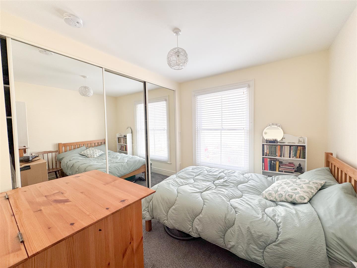 The main bedroom is generously sized, enjoying excellent natural light and fitted wardrobes, while the second bedroom offers versatile use as a guest room, home office, or dressing room.