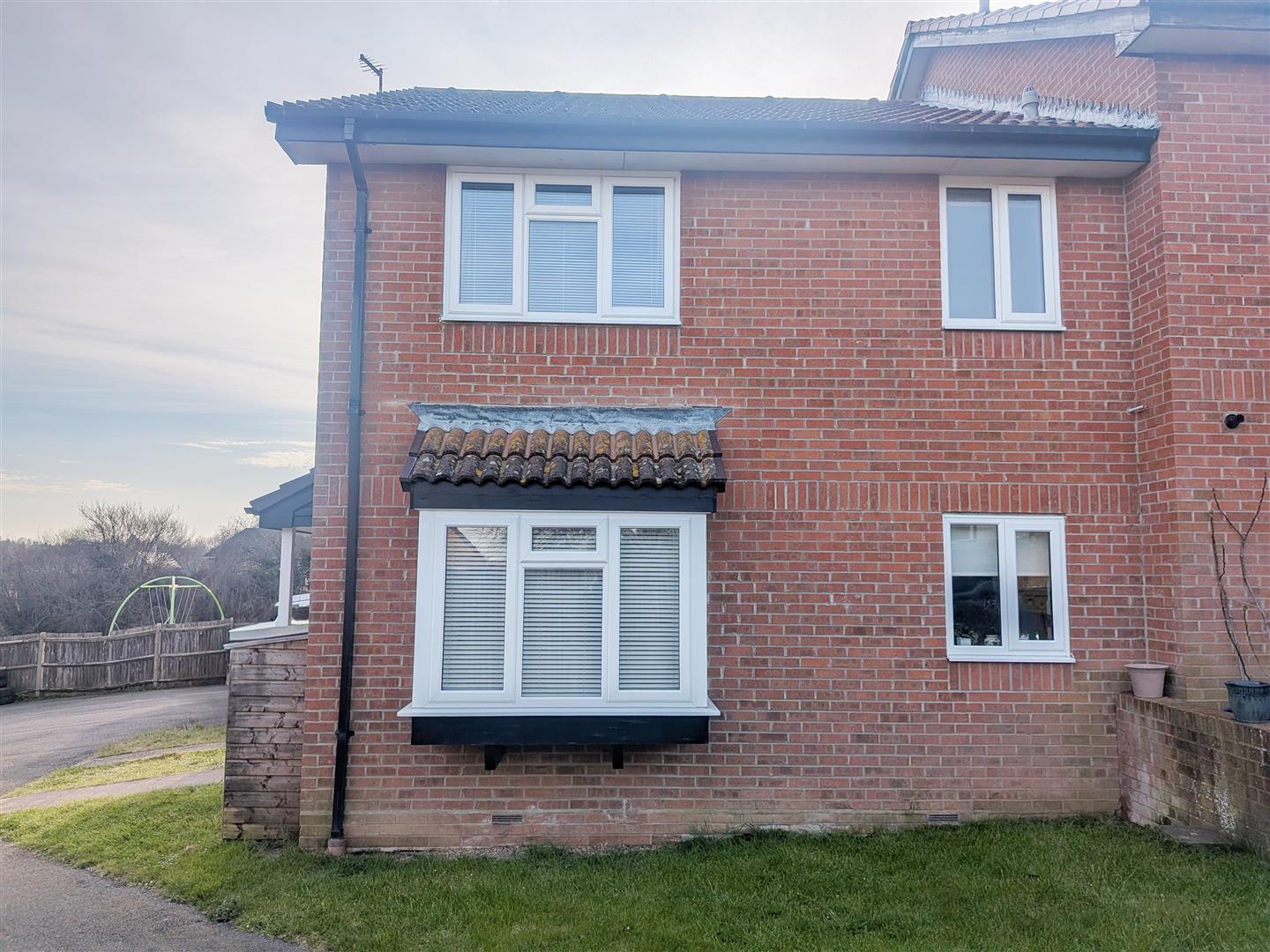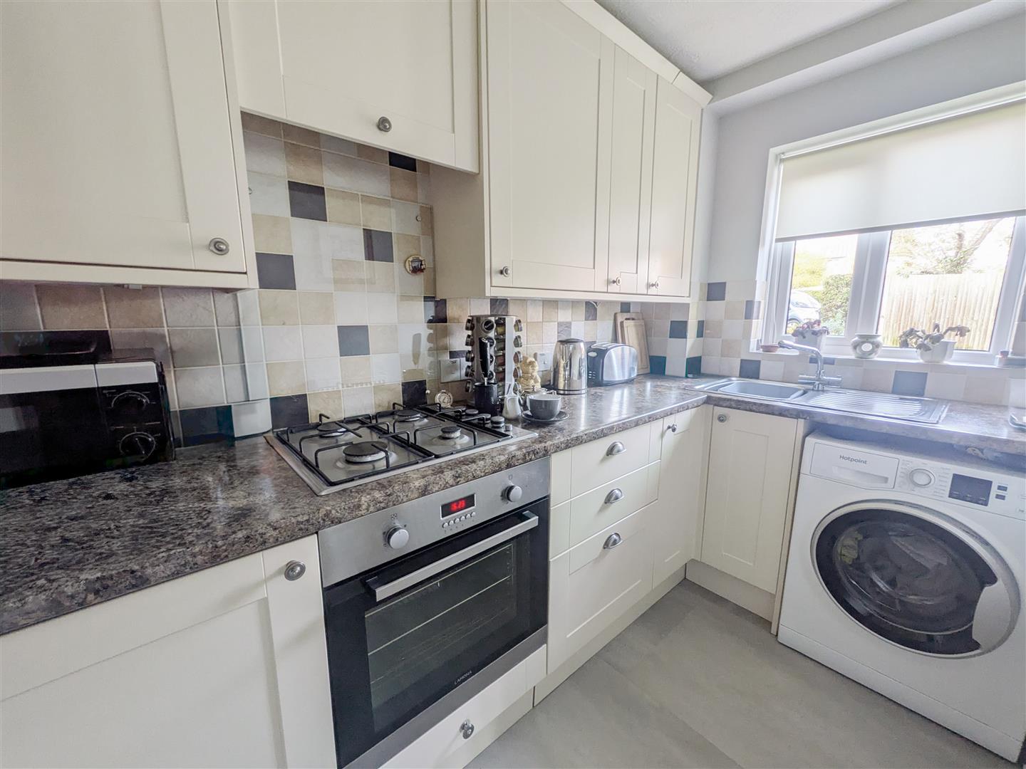 An inviting entrance porch with built-in storage sets the tone, leading into a bright and airy open-plan living and dining space, enhanced by a charming double-glazed bay window that fills the room with natural light. The sleek, well-appointed kitchen features modern fitted units, integrated appliances, and additional space for white goods—perfectly balancing form and function.