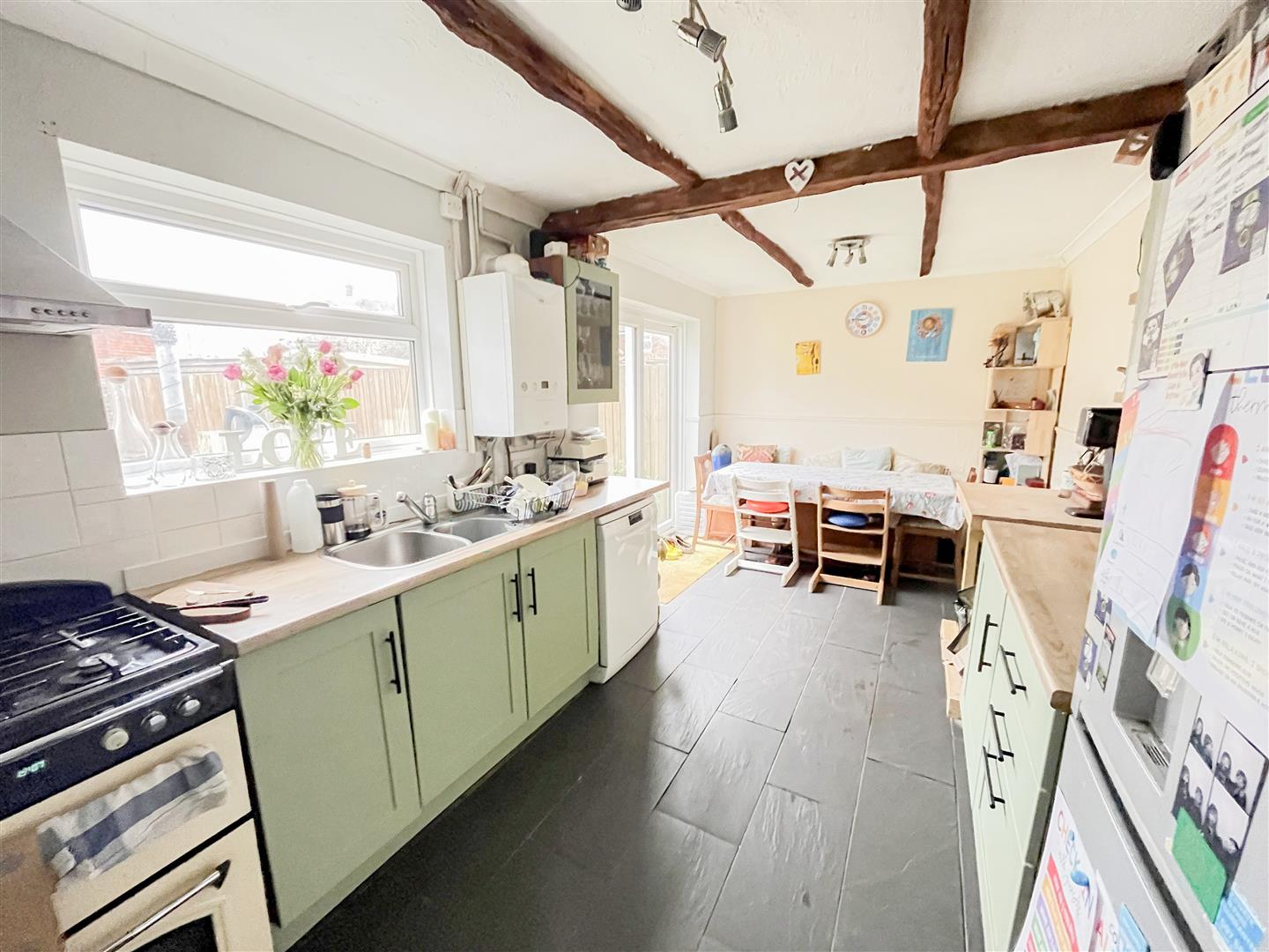 To the rear of the home is the kitchen/dining area, a bright and practical space with ample room for a breakfast table and chairs. Overlooking the garden, making it well suited to modern family life.
