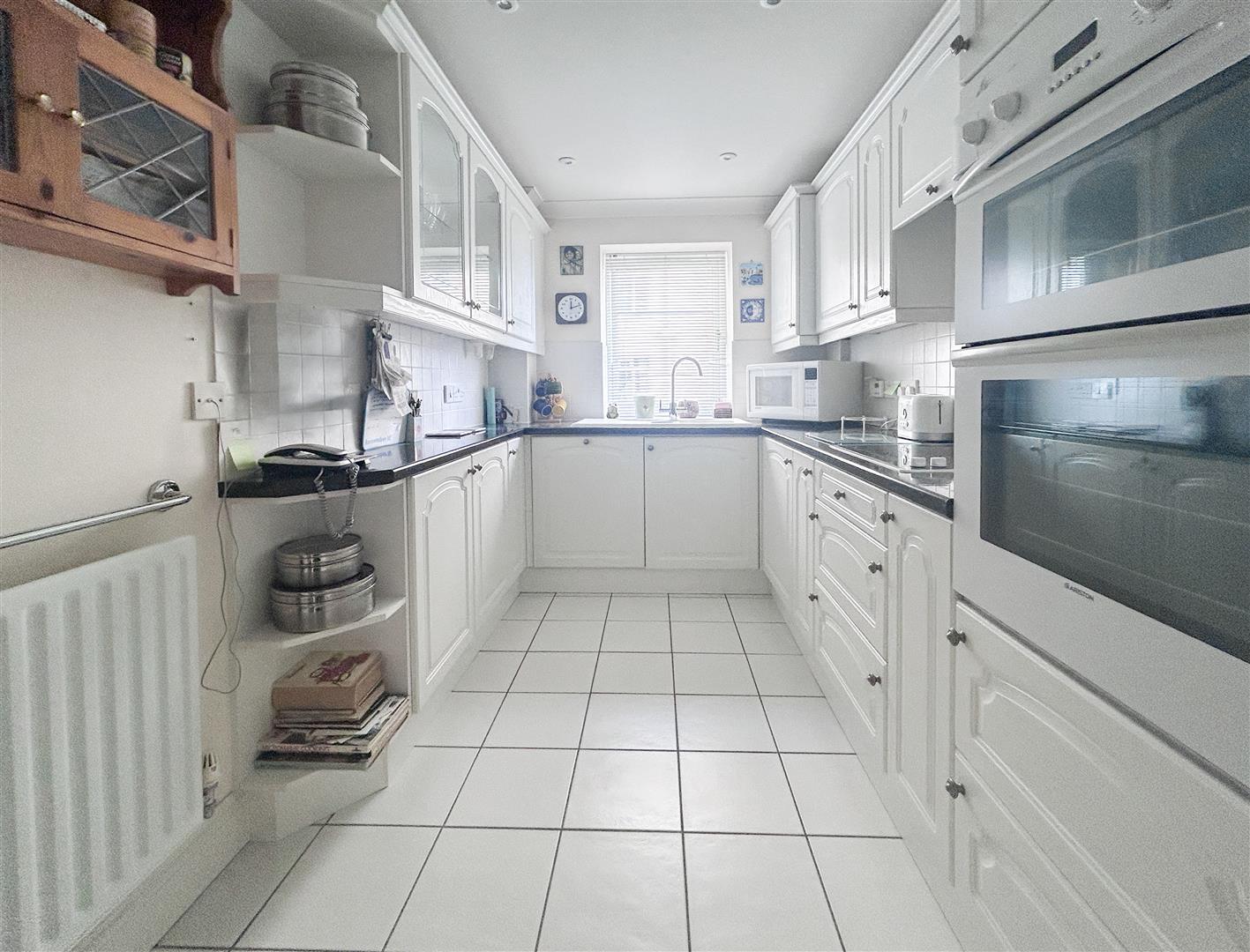 There are two well-proportioned double bedrooms, including a principal bedroom with fitted wardrobes and en-suite shower room. A separate modern bathroom serves the second bedroom. The fitted kitchen offers a range of base and wall units, integrated oven, hob and extractor, fridge/freezer, and ample worktop space.