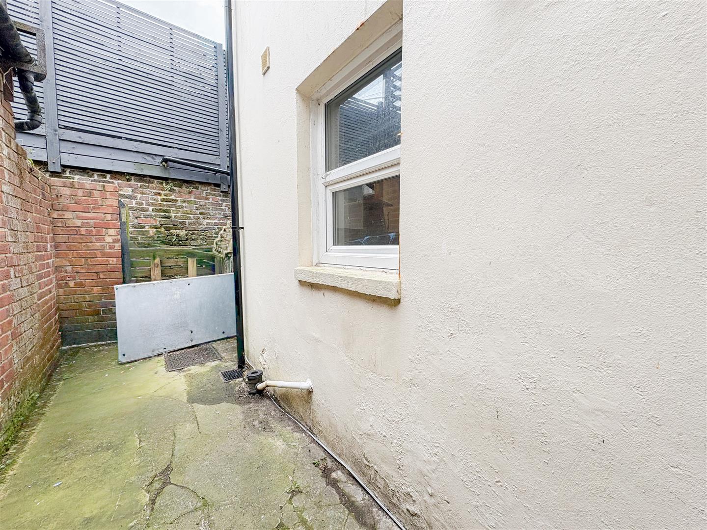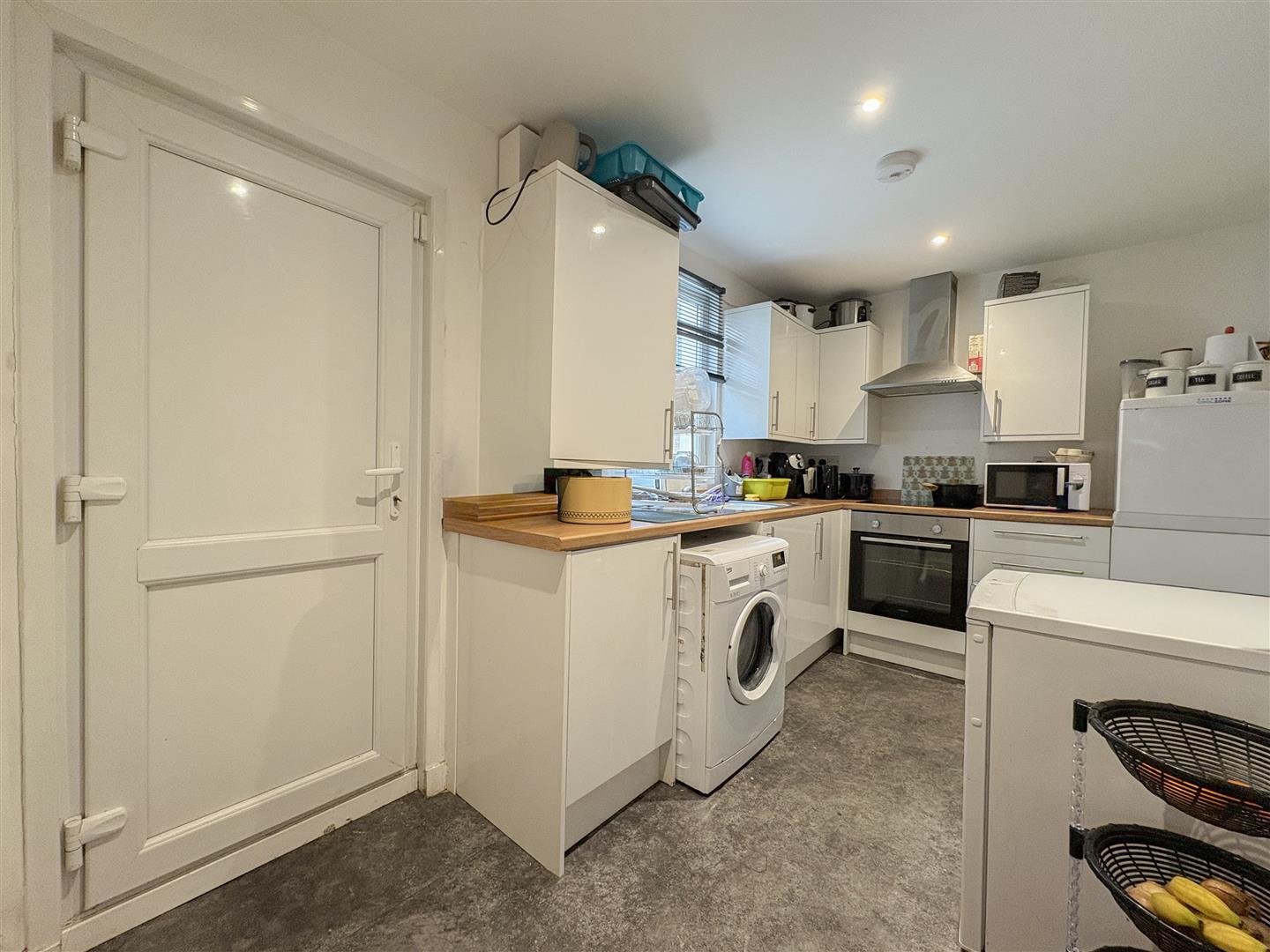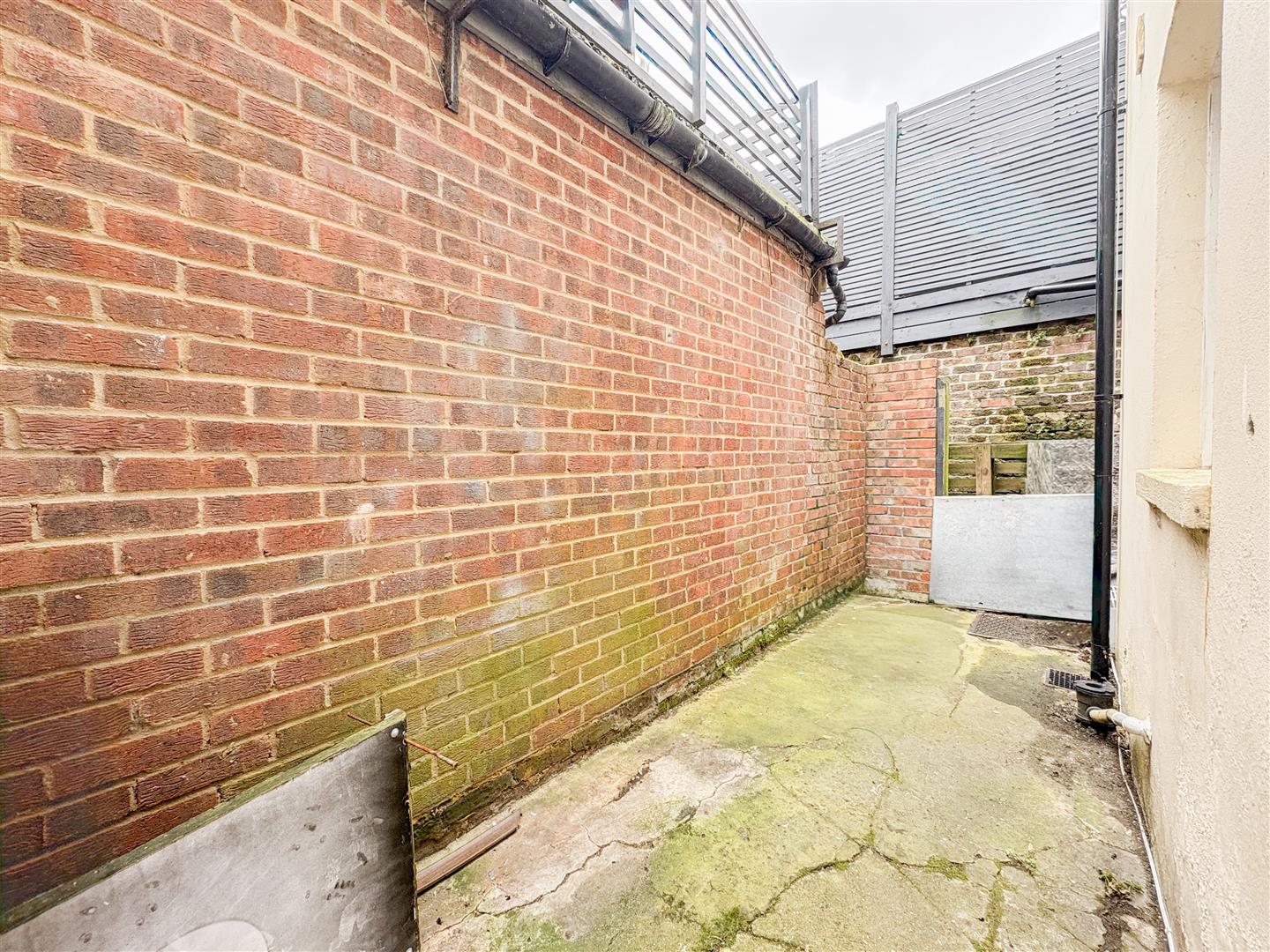 You are welcomed into a spacious reception room, leading through to a modern kitchen fitted with a built-in oven and hob. A door from the kitchen opens onto a small courtyard, providing useful outdoor space.