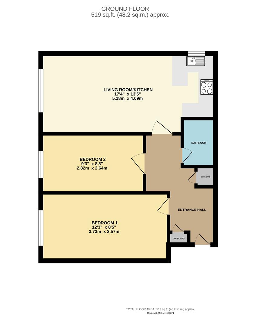 The flat features two well-proportioned bedrooms. The open-plan living room and kitchen is a welcoming area, perfect for entertaining guests or enjoying quiet evenings at home. The layout is thoughtfully designed to maximise space and light throughout.