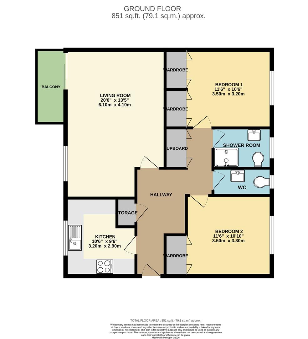 The accommodation is well laid out and comprises a welcoming entrance hall, an impressive 20ft living/dining room opening onto a west-facing balcony, a fitted kitchen, two good-sized double bedrooms, a shower room with WC and a separate WC.