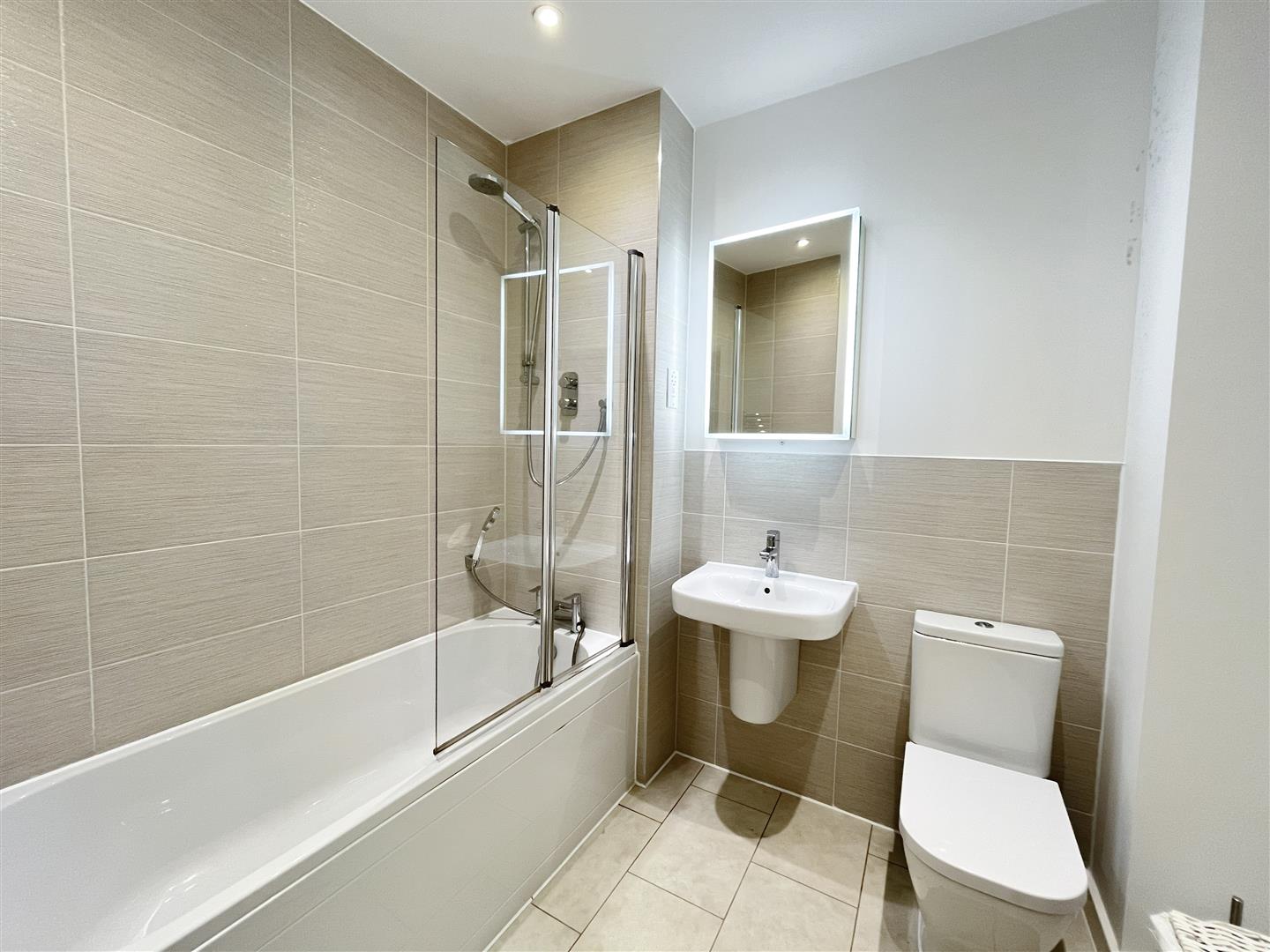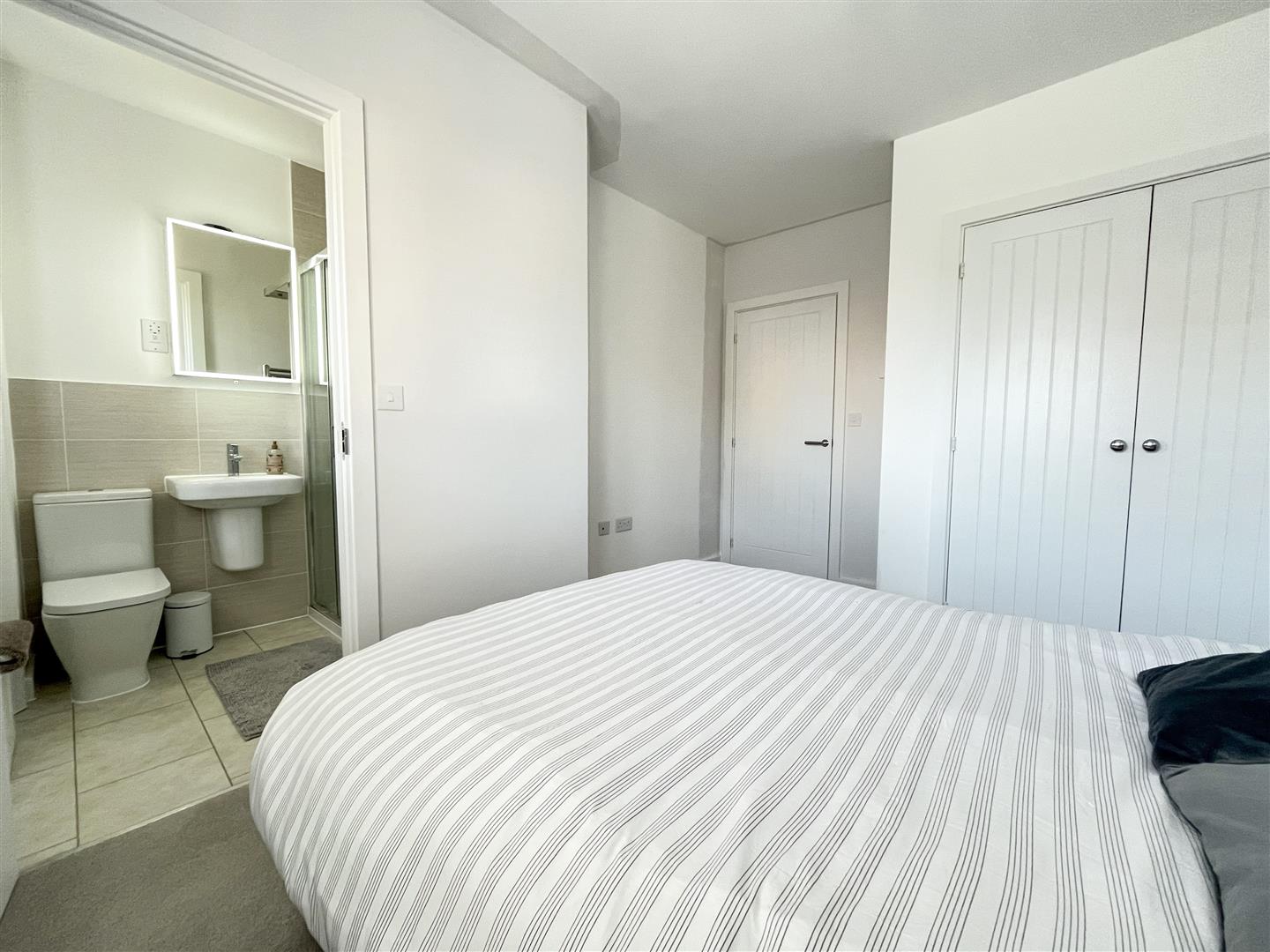 The ground floor features a bright and welcoming living space, a contemporary fitted kitchen complete with integrated appliances, and a convenient cloakroom. Upstairs, the property offers two generous double bedrooms, including a principal bedroom with built-in wardrobe and a sleek ensuite shower room. A modern family bathroom serves the second bedroom.