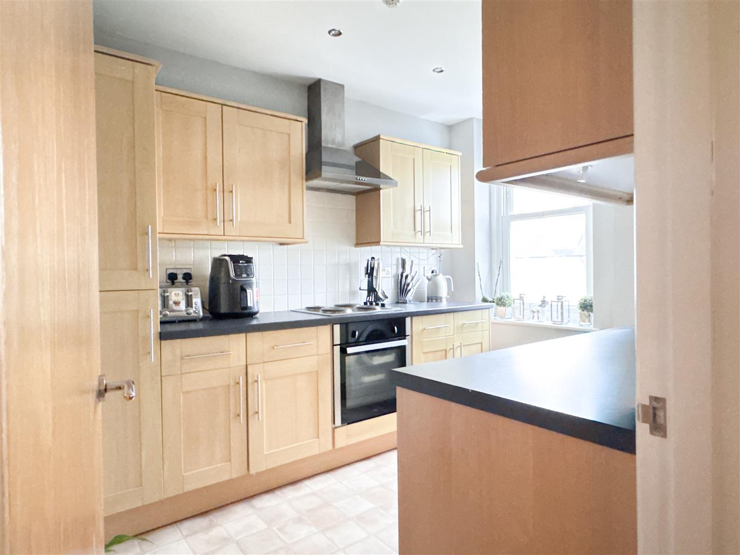 The property features a welcoming entrance hallway leading to a bright and generously sized living room, ideal for both relaxing and entertaining. Adjacent is a fitted kitchen equipped with a range of wall and base units, integrated appliances, and ample worktop space with views out to the Downs.