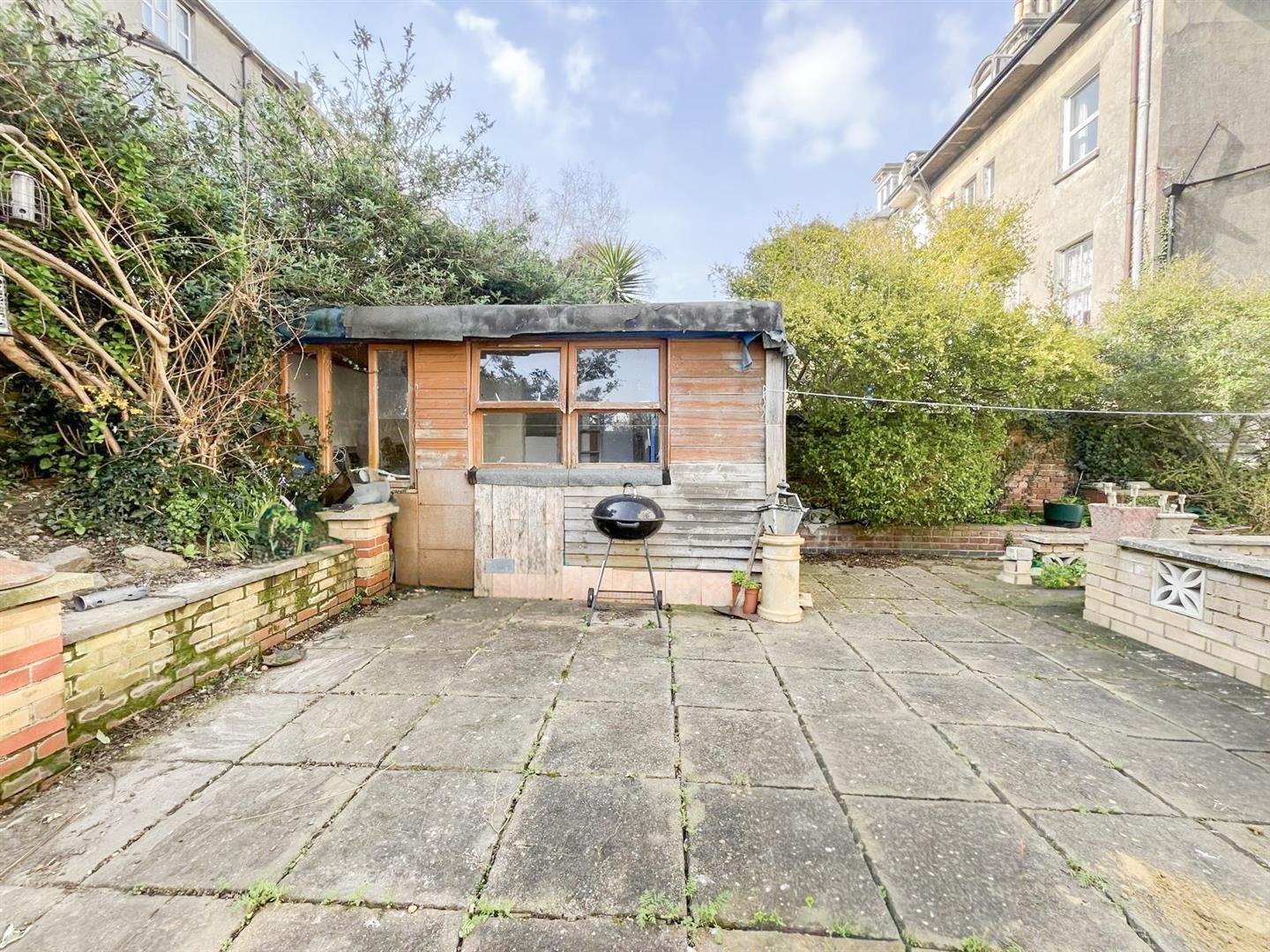 The courtyard garden is mostly paved with an area of decking and mature border, and benefits from a large shed with power supply.