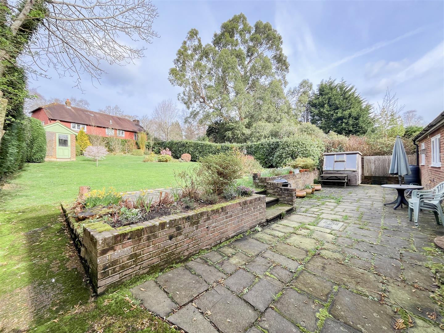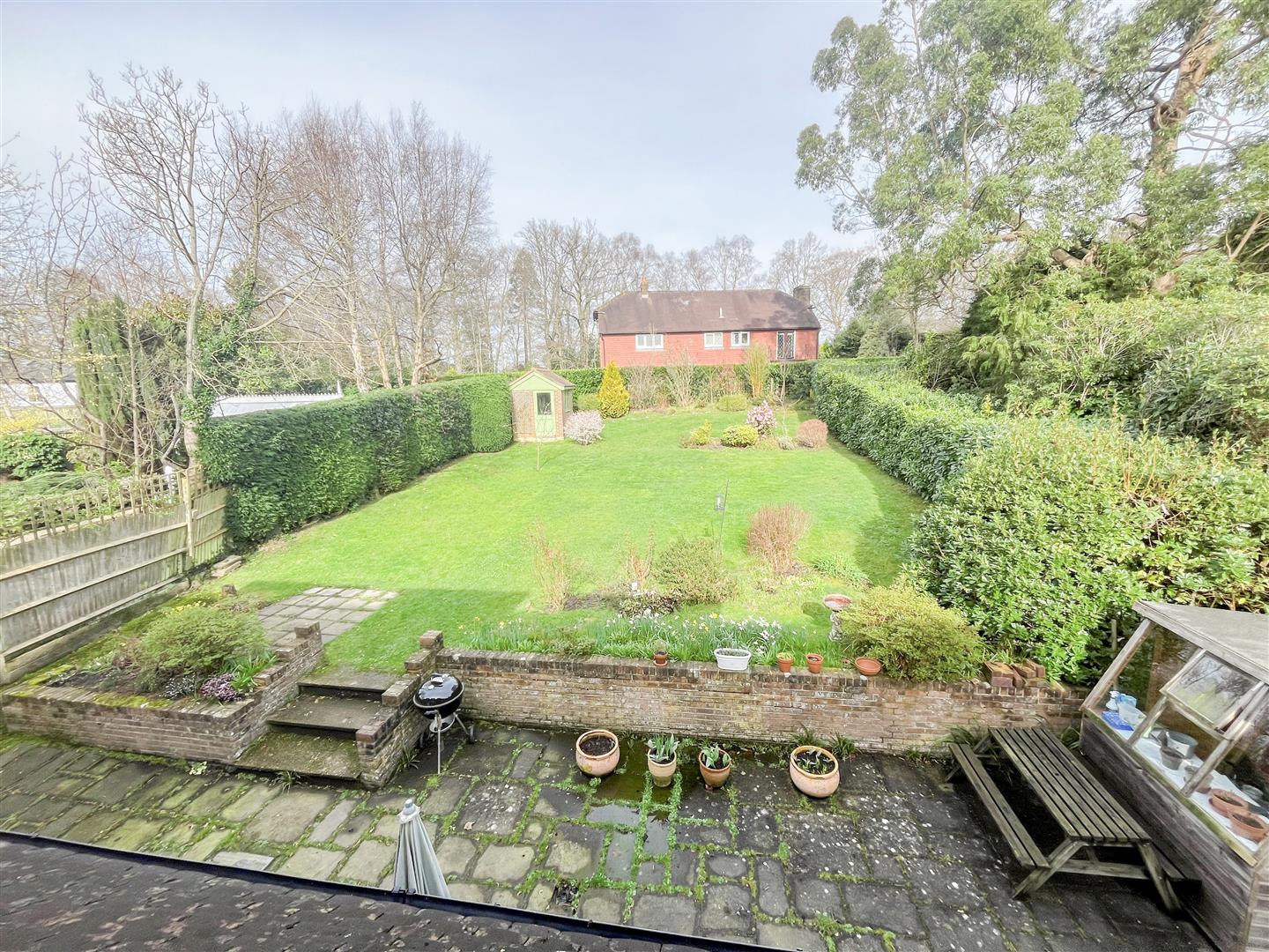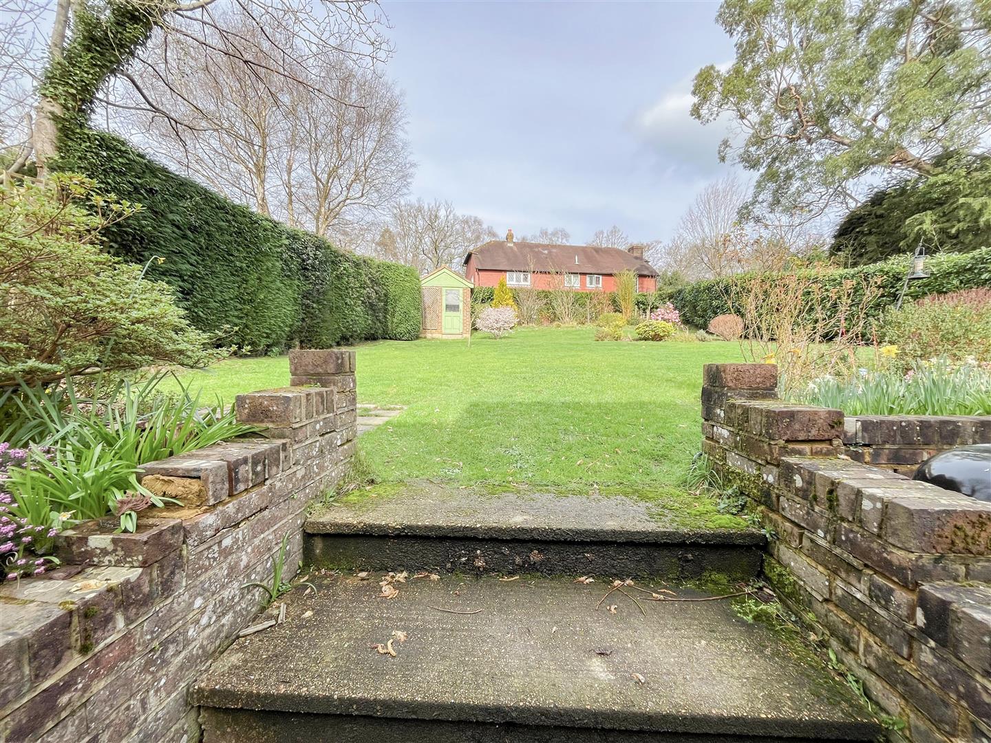 Outside, the rear garden is particularly attractive, mainly laid to lawn and enclosed by mature hedging that provides a good degree of privacy. There are established flower beds with a variety of shrubs and planting, and a brick-built outbuilding at the far end of the garden which offers useful storage.