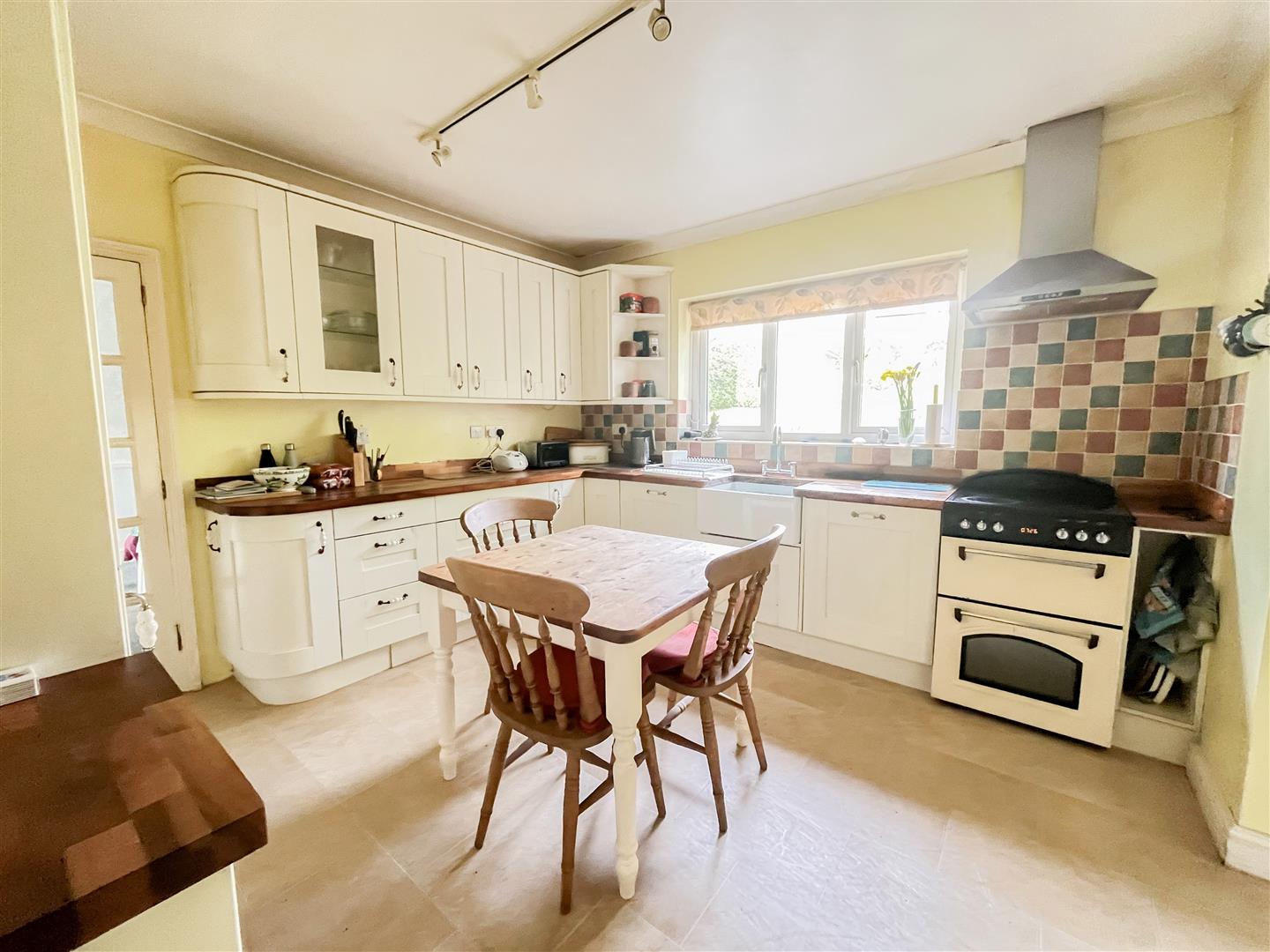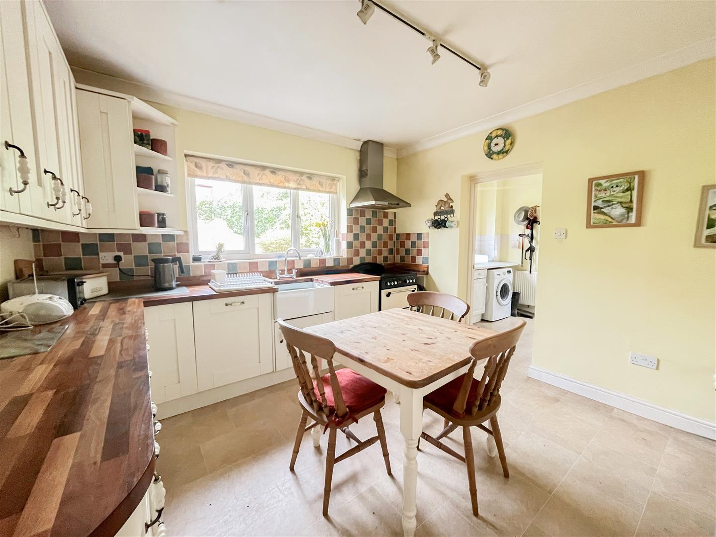 The kitchen/breakfast room offers generous storage, a traditional Belfast sink, and a large window overlooking the garden, creating a pleasant outlook while cooking or dining. A separate utility room sits just off the kitchen, and a conveniently located shower room is also found on the ground floor. Decorative features including ceiling roses, coving, and dado rails add character and period charm to the living spaces.