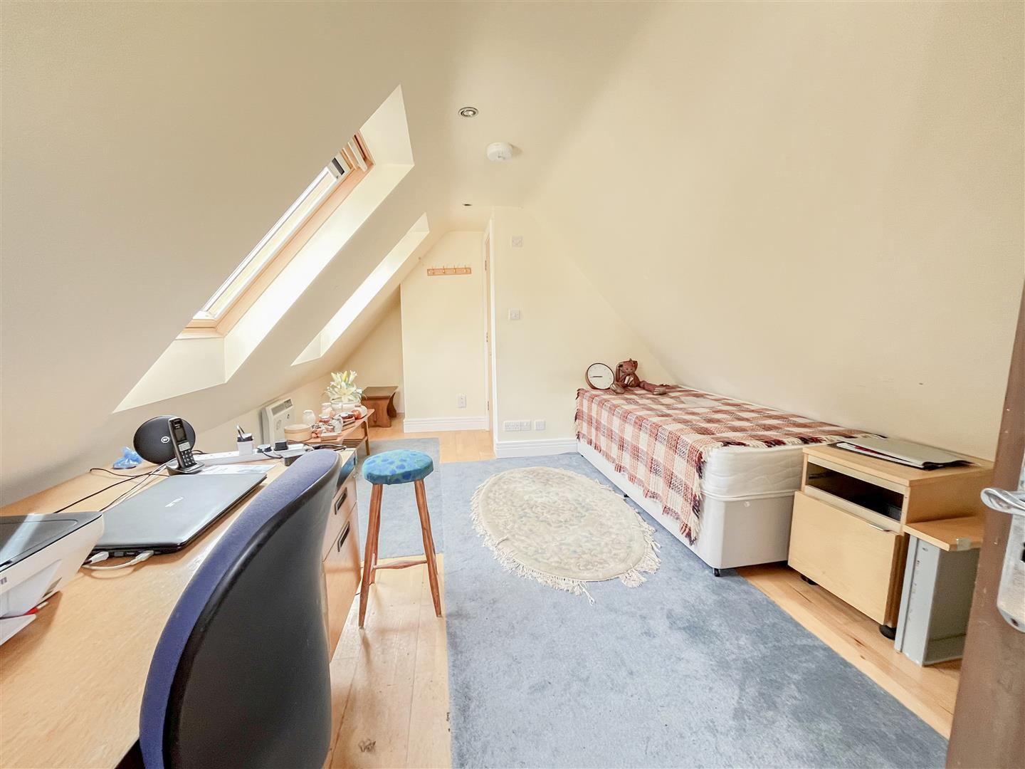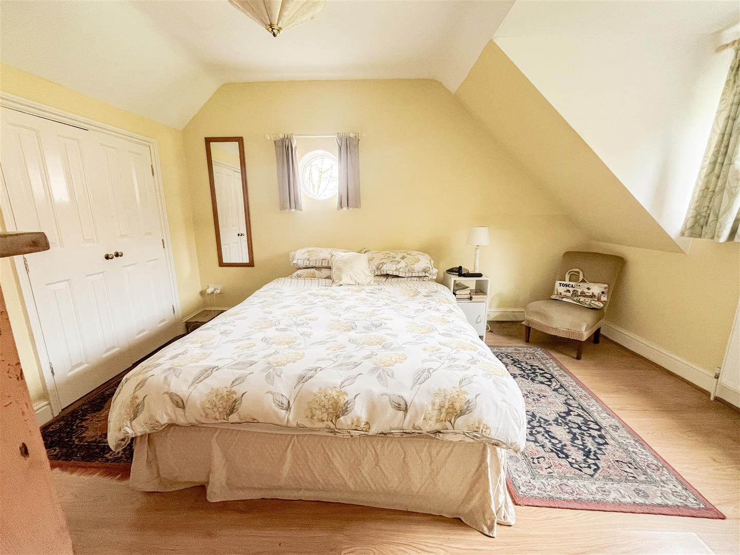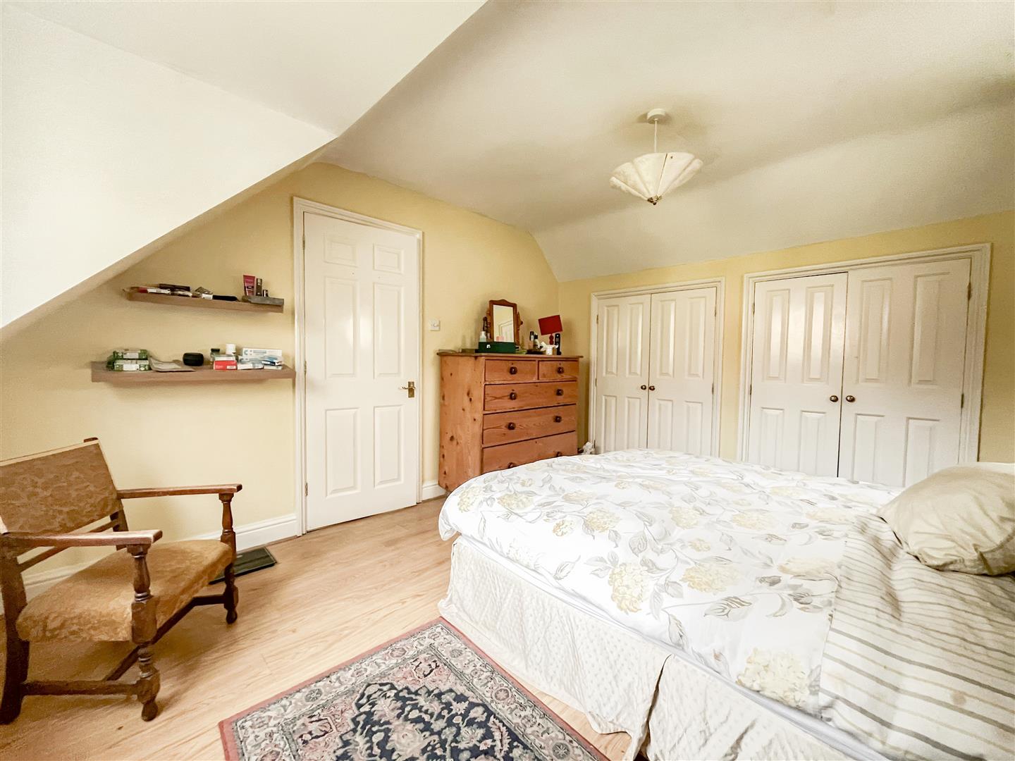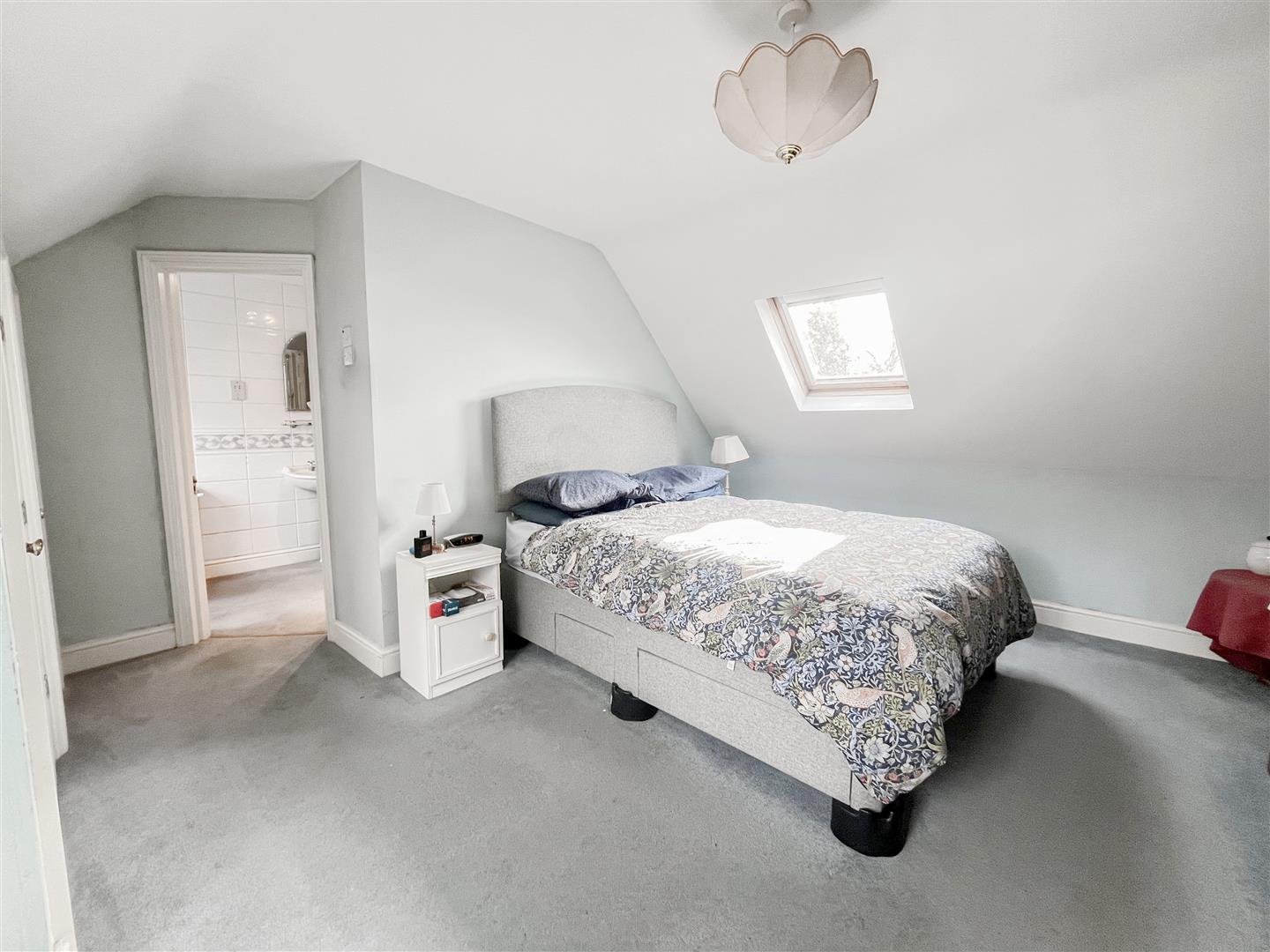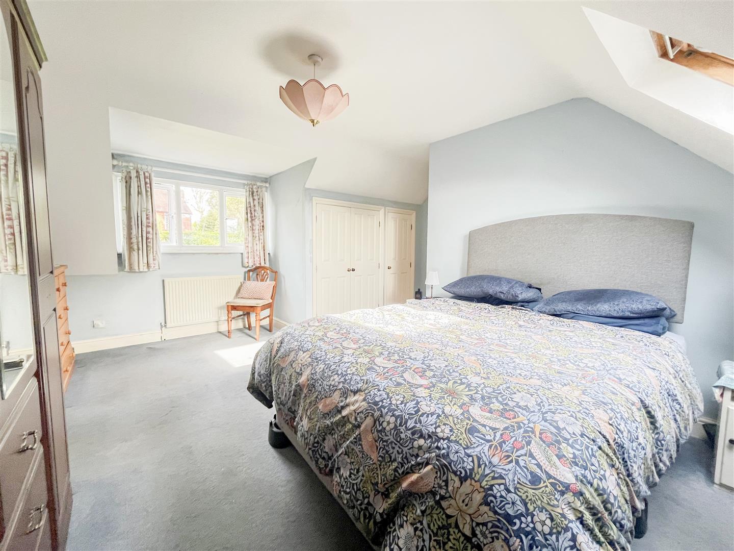 The first floor provides three bedrooms, including two spacious doubles with built-in cupboards. The principal bedroom benefits from its own ensuite bathroom. A further bedroom features a distinctive eyebrow window that fills the room with natural light, and a separate shower room serves the remaining bedrooms.
