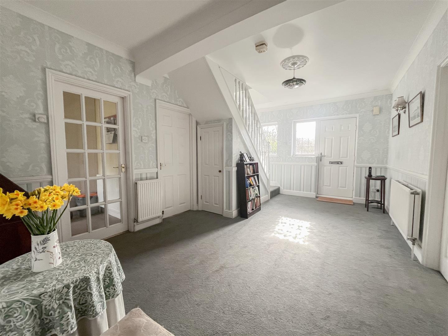 Stepping through the front door, you are welcomed by an impressive entrance hall that immediately gives a sense of the scale and light this home provides. From here, the ground floor opens into three reception rooms. The main living room is positioned to one side, while the opposite side of the hallway leads to a formal dining room and a flexible additional room that could be used as a fourth bedroom, study, or snug.