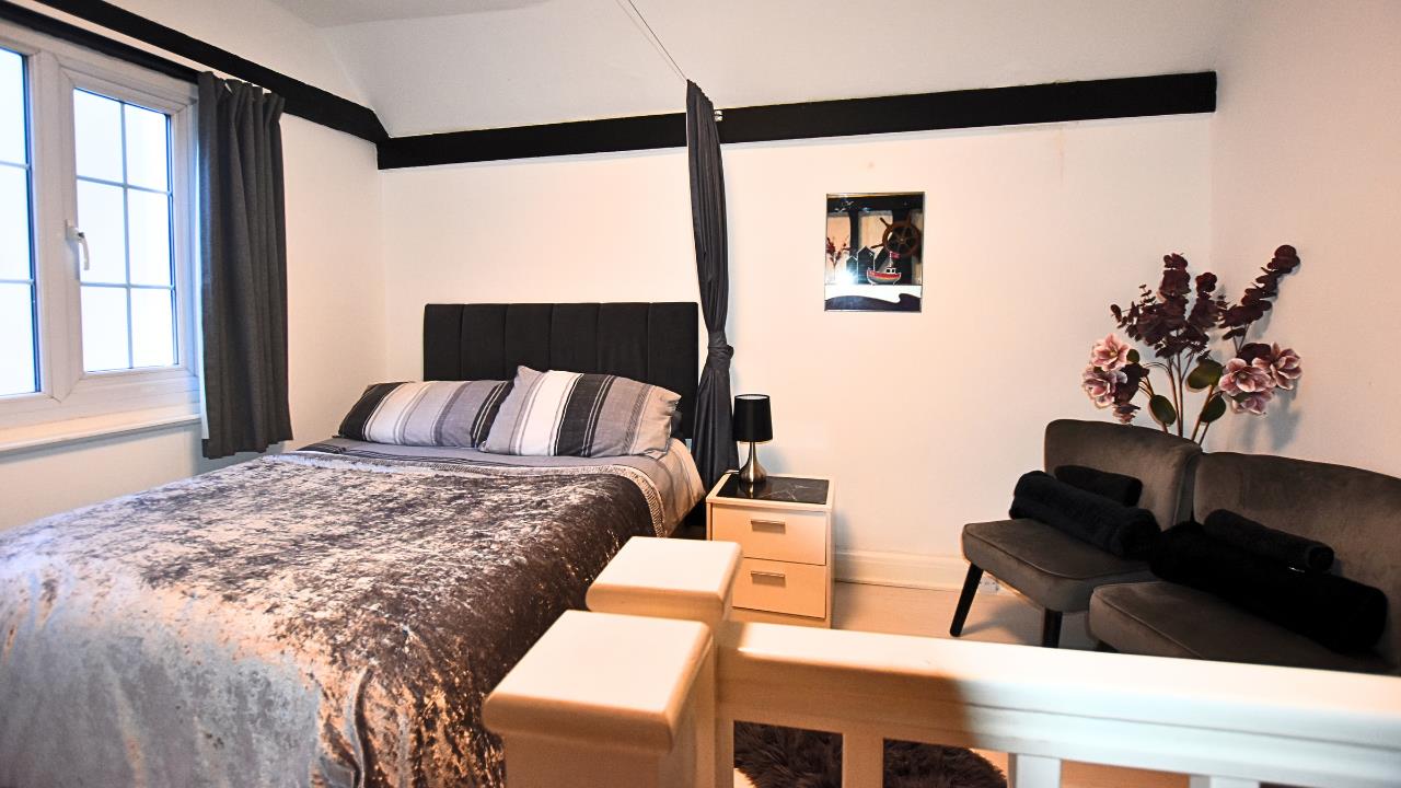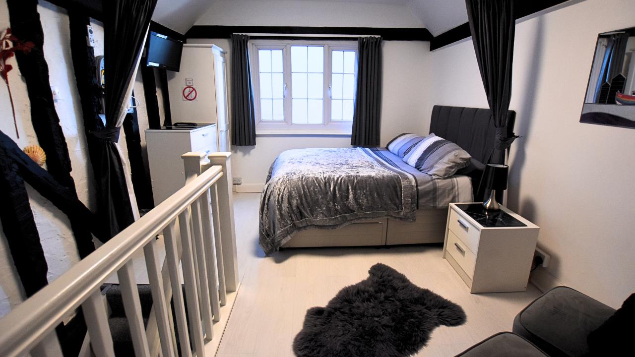 An attractive staircase takes you up to the hotel style bedroom with en-suite shower room. A floor to ceiling curtain can be drawn in the middle of the room for added privacy. The living room sofa bed offers additional sleeping capacity.