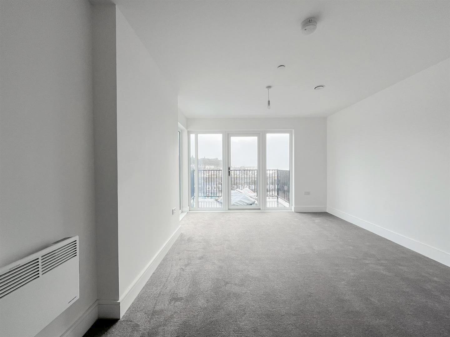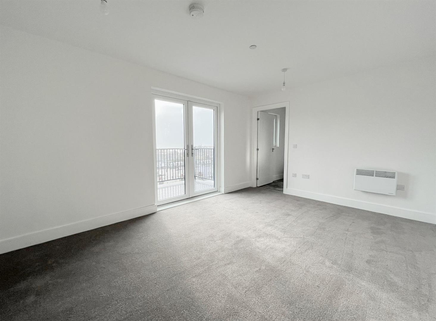 The open-plan living area features a modern fitted kitchen complete with integrated appliances, including a dishwasher, washing machine, and fridge-freezer. The living space enjoys access to a balcony ideal for entertaining or relaxing with the view.