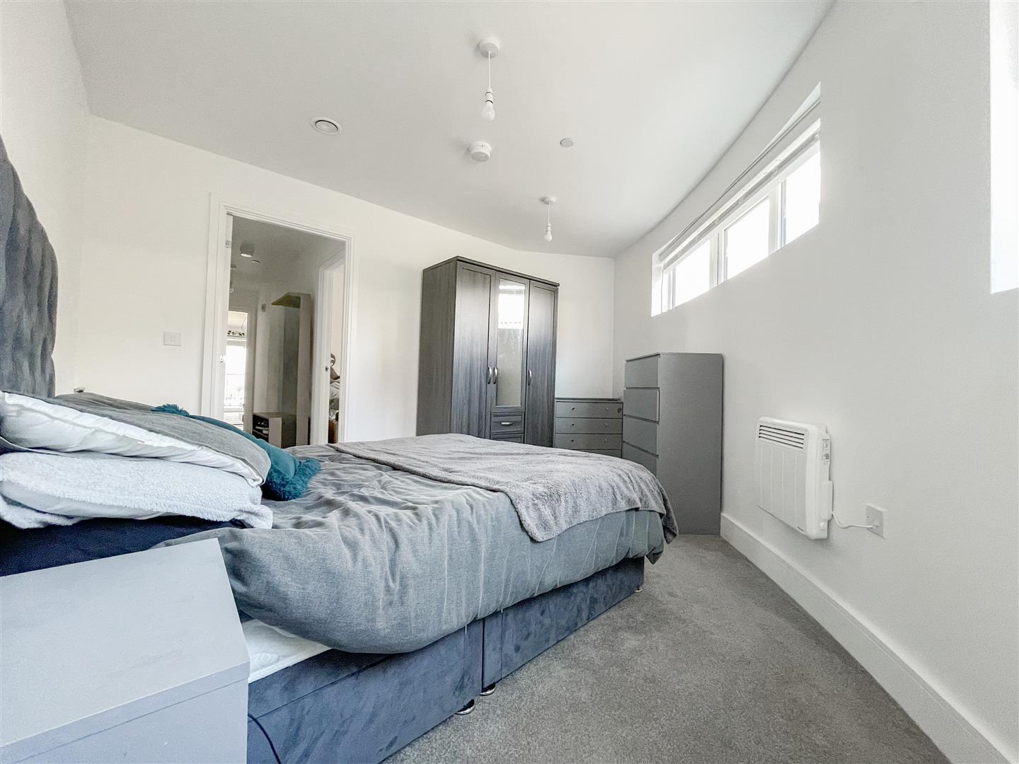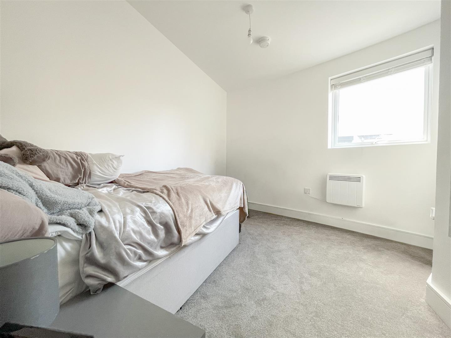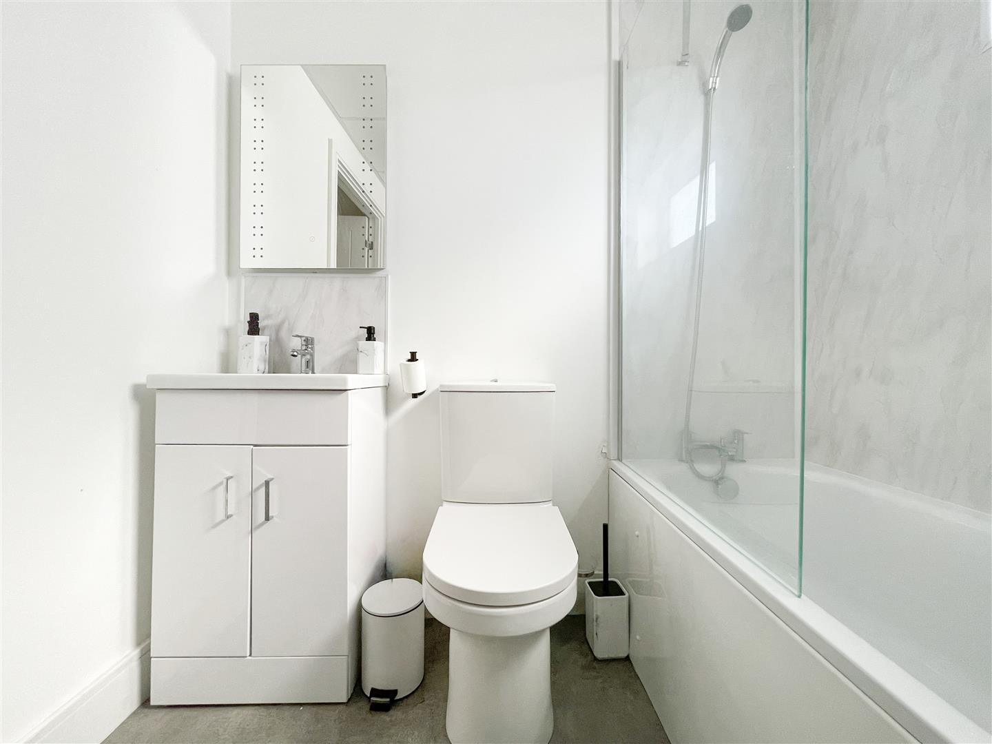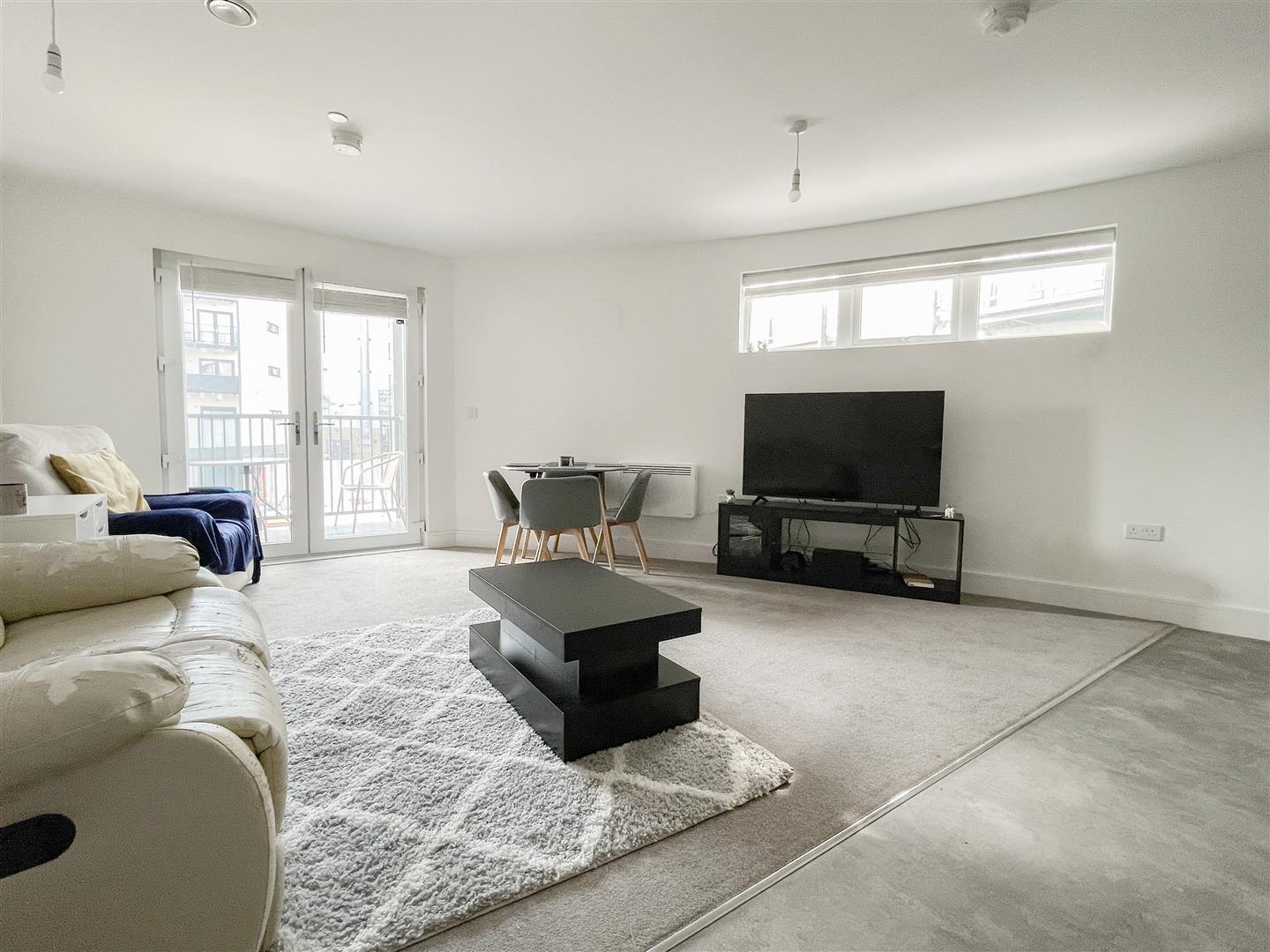 The property features a bright open-plan living area with a modern fitted kitchen that includes a washing machine, fridge/freezer, dishwasher, oven and hob. Two sizeable bedrooms and a family bathroom with shower over bath. The living room has doors that lead to a Juliet balcony.