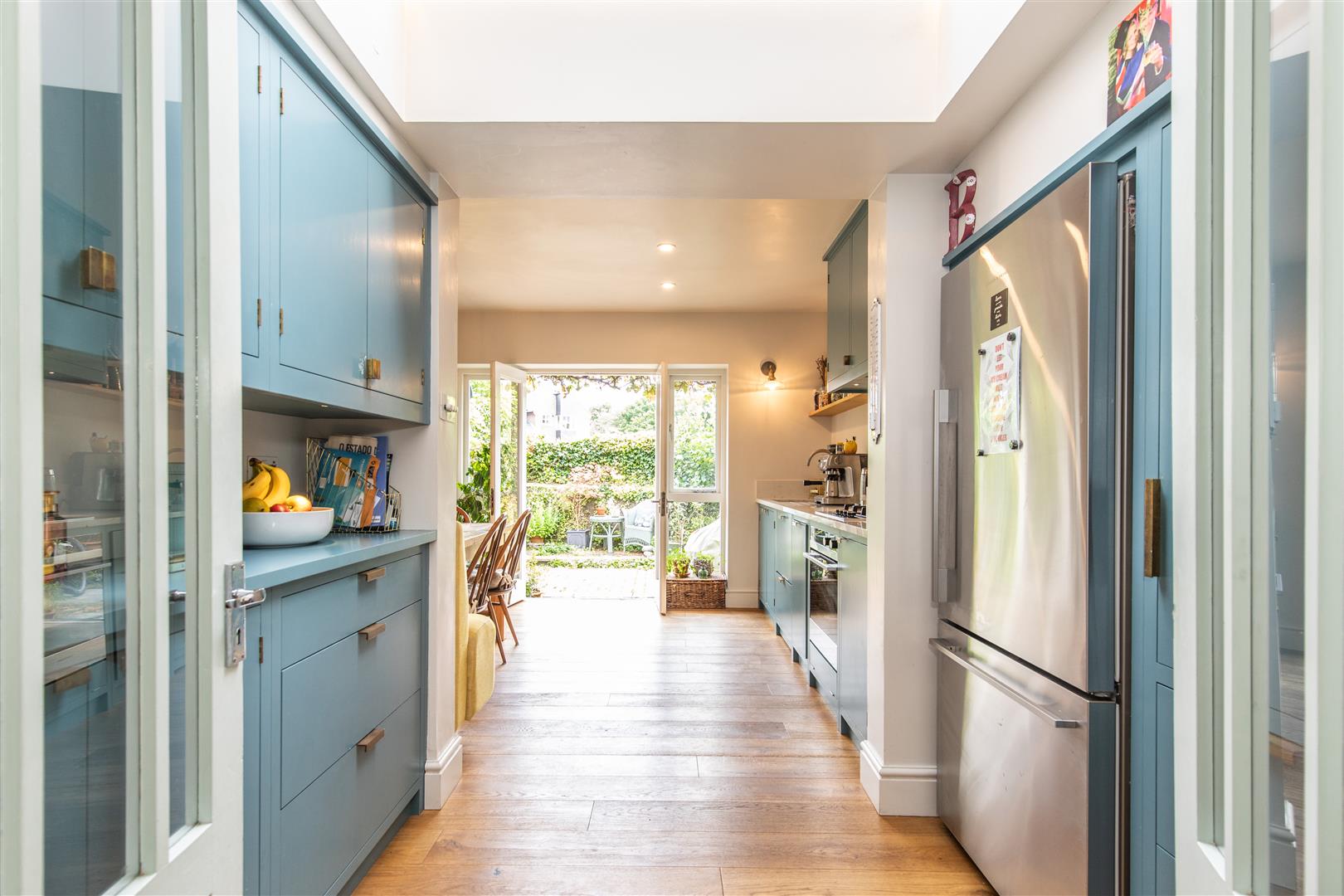 Ground Floor: Solid wood Front Door into Entrance hall; Sitting Room with large open fireplace, alcoves with fitted cupboards and shelves, original ceiling roses, access to basement; Wet Room with walk in shower, wall mounted hand wash basin, low level WC, heated towel rail, half tiled walls, tiled floor; bespoke Inglis Hall fitted kitchen with integrated dishwasher drawers, integrated oven with gas hob over, space for fridge freezer, skylight, fitted seating for Dining area, French doors to Courtyard Garden. Cellar with washing machine, dryer, freezer, fitted shelves, brick floors, cobblestone wall divide.