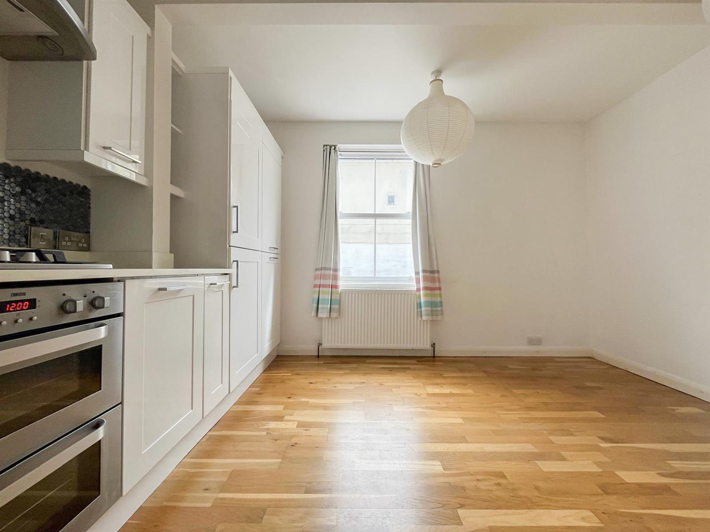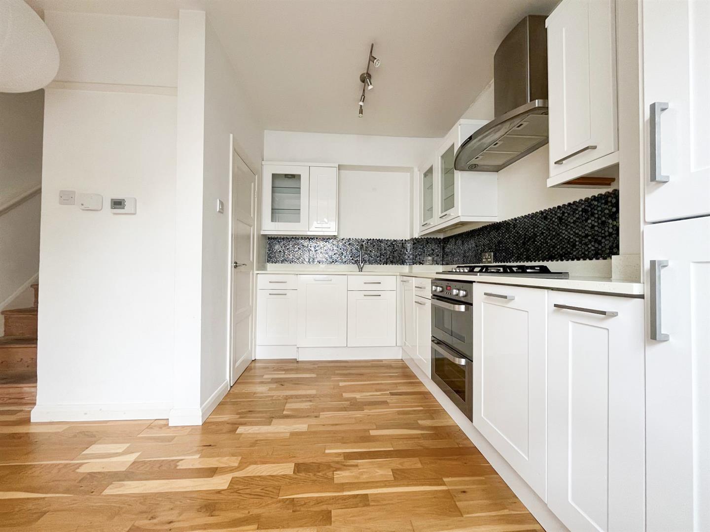 The ground floor features a bright dual-aspect living room, which flows through to a generously sized kitchen/dining room positioned at the rear of the property. The kitchen is fitted with modern units and provides ample space for a full dining table. Appliances include an electric oven with gas hob, fridge/freezer, and integrated dishwasher. A useful under-stairs larder cupboard offers additional storage, along with space and plumbing for a washing machine.