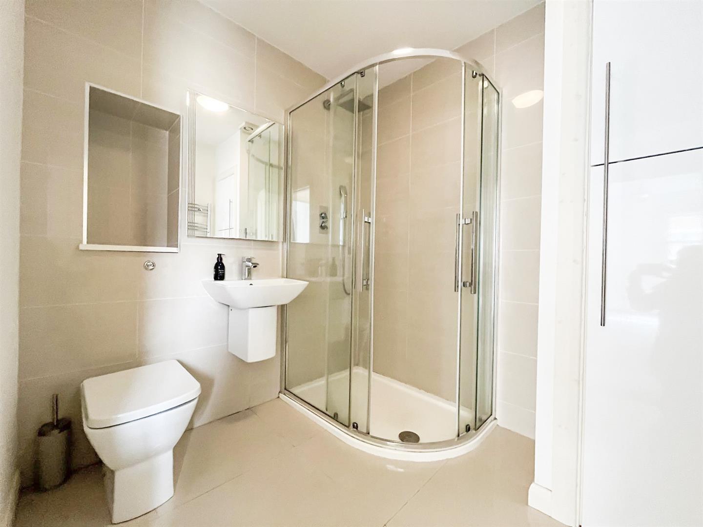 - First floor comprising a double bedroom, single bedroom with built-in storage, and contemporary shower room