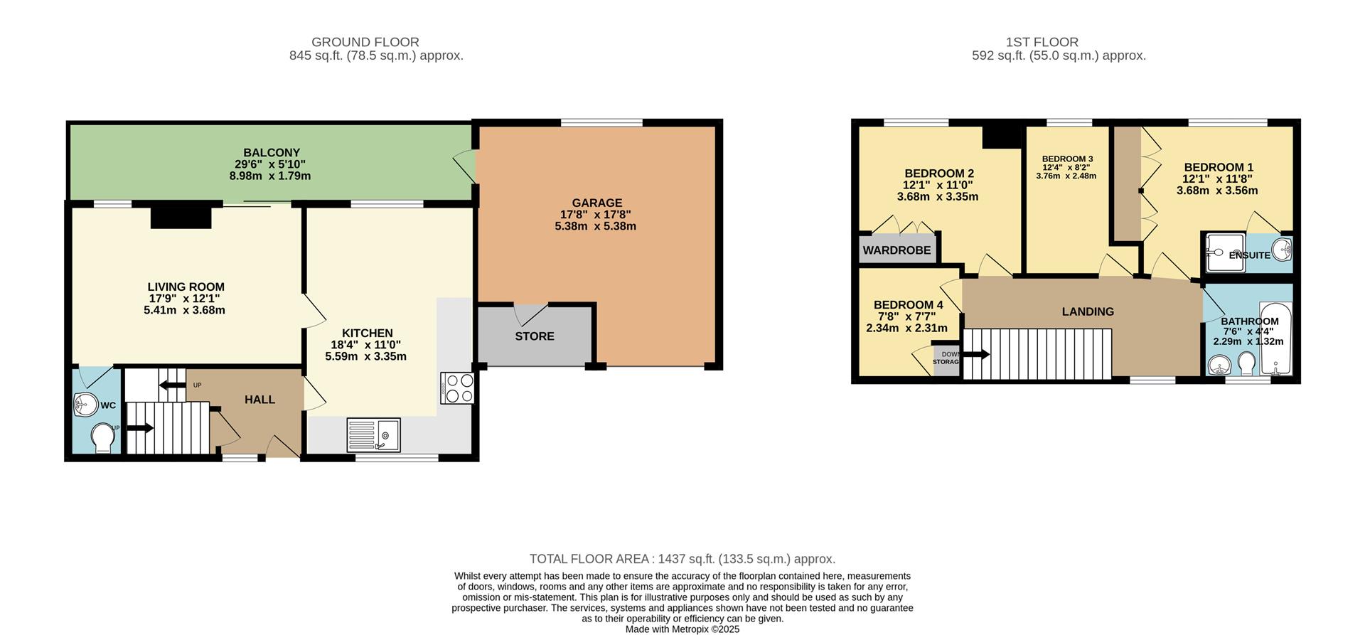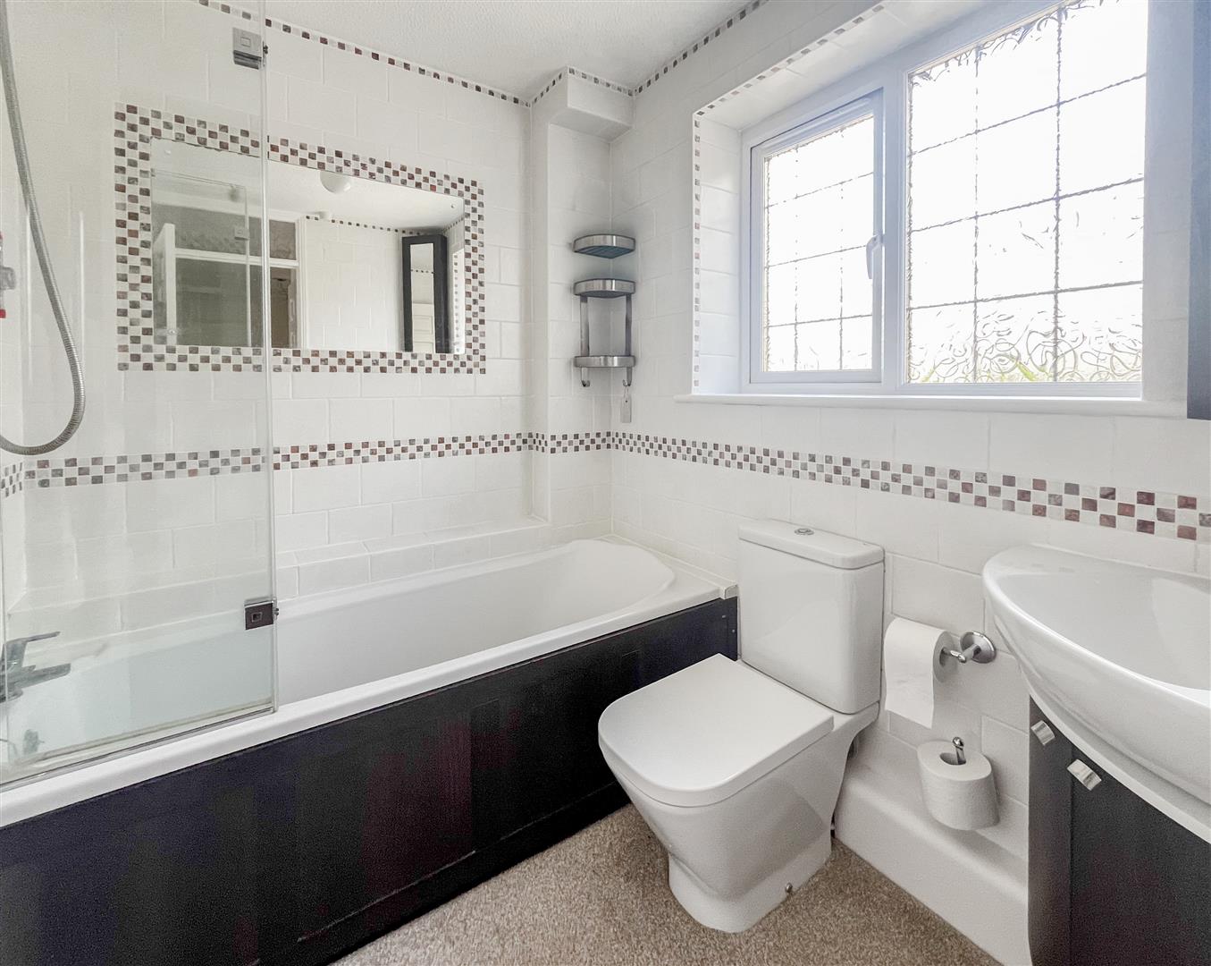 Upstairs, the home offers four bedrooms, including a principal suite with an en-suite shower room. A modern family bathroom with a white suite serves the remaining bedrooms.
