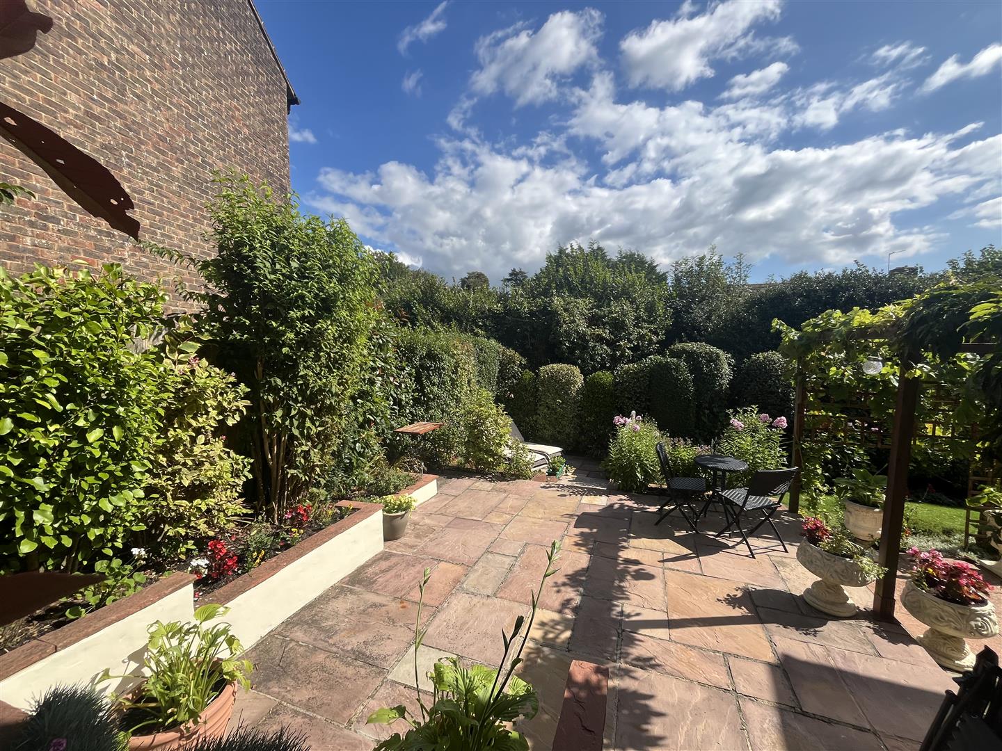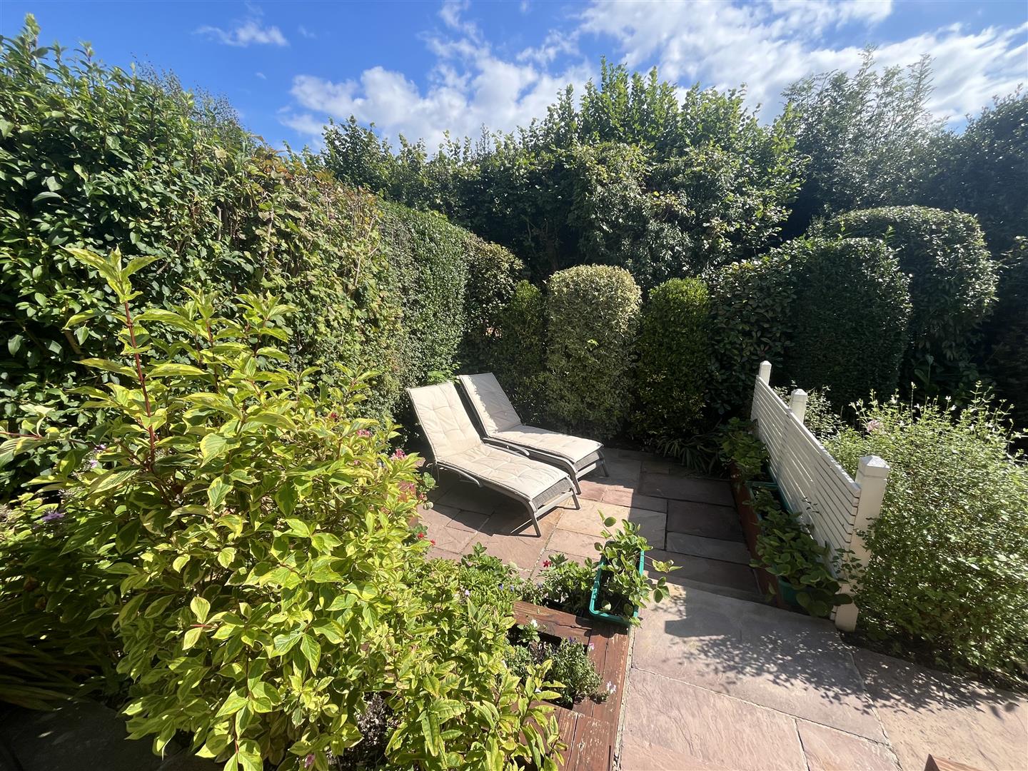 The well-maintained garden features a neat lawn, mature trees, established shrub borders, and a flagstone patio—ideal for outdoor entertaining.