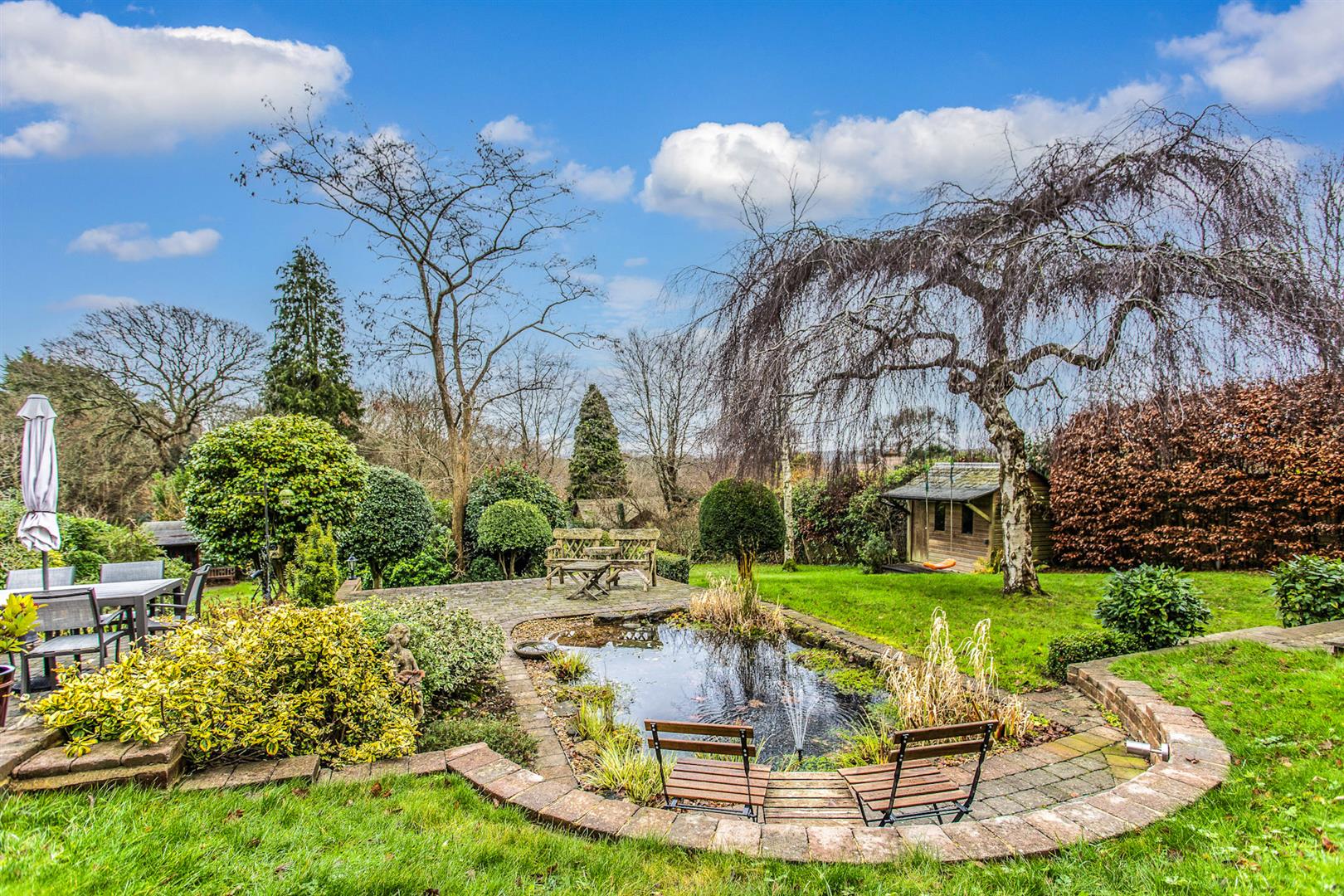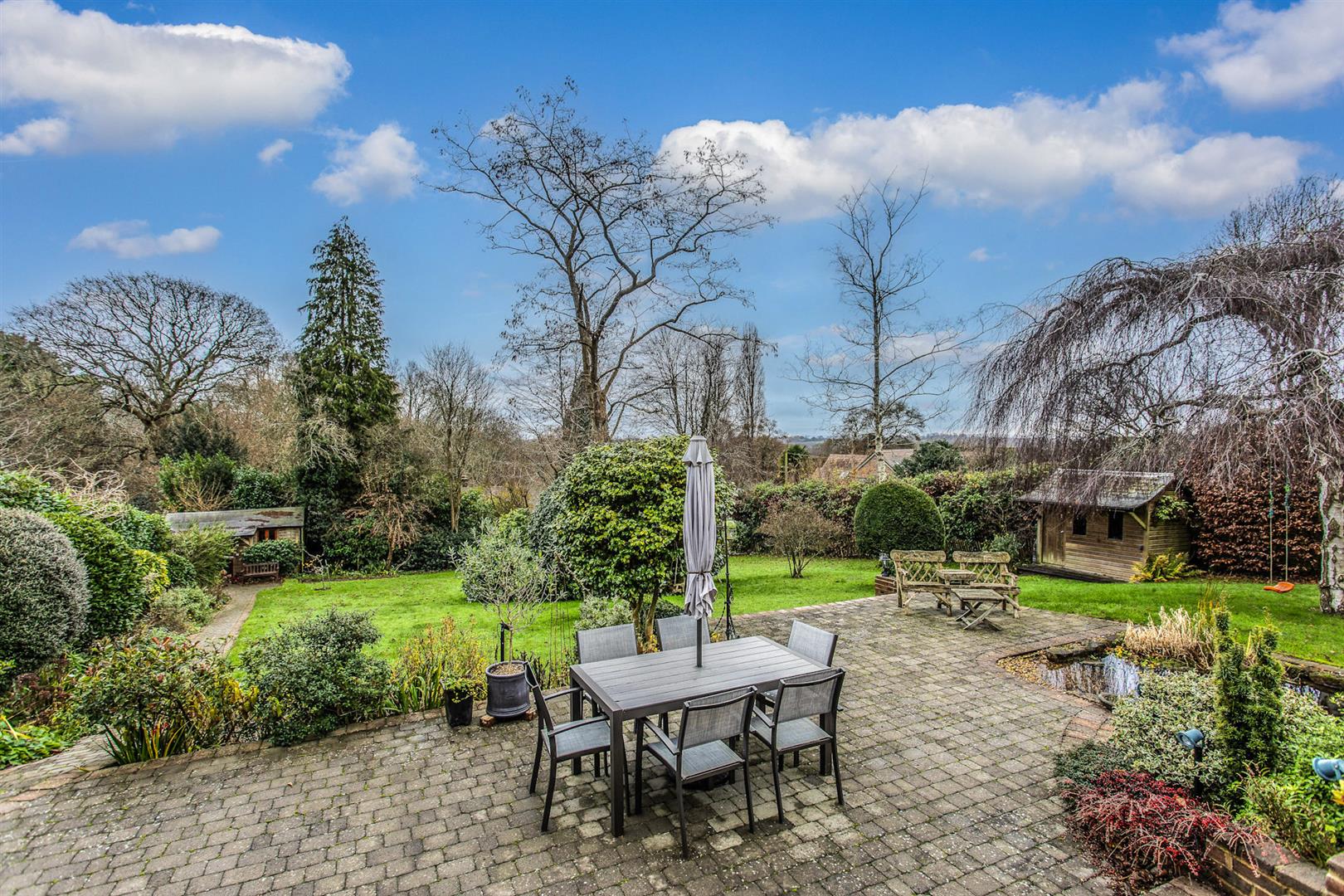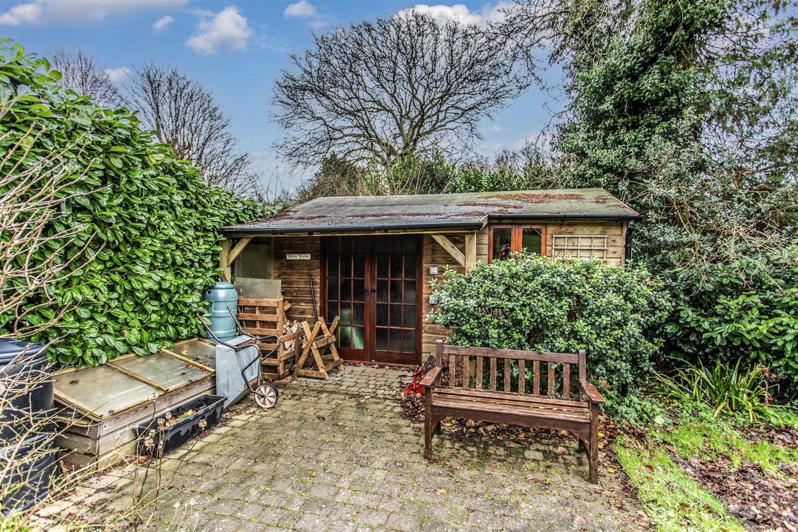 - Glorious south-facing gardens of approx. 150’ x 84’ with lawns, borders, pond and large outbuilding