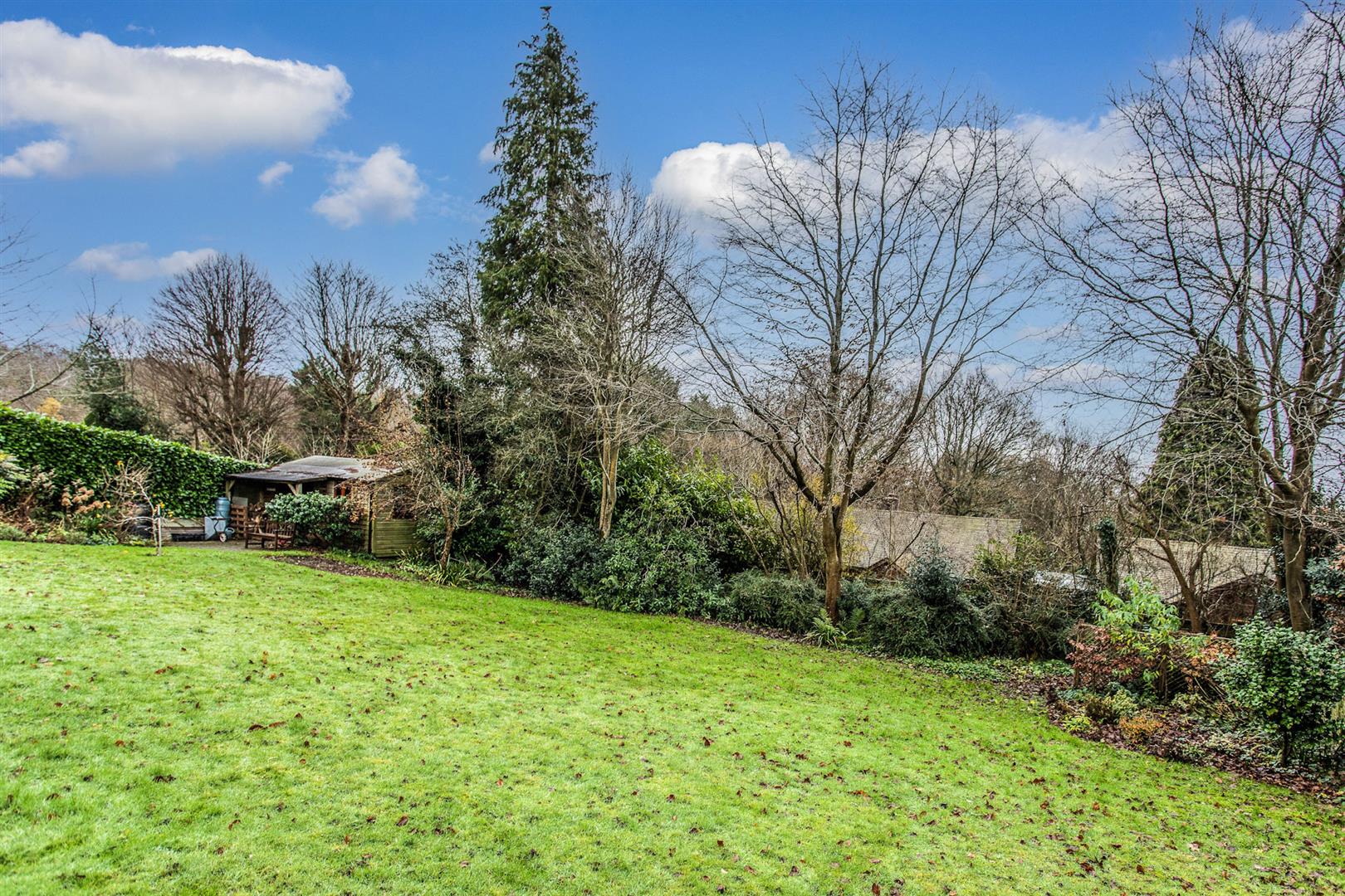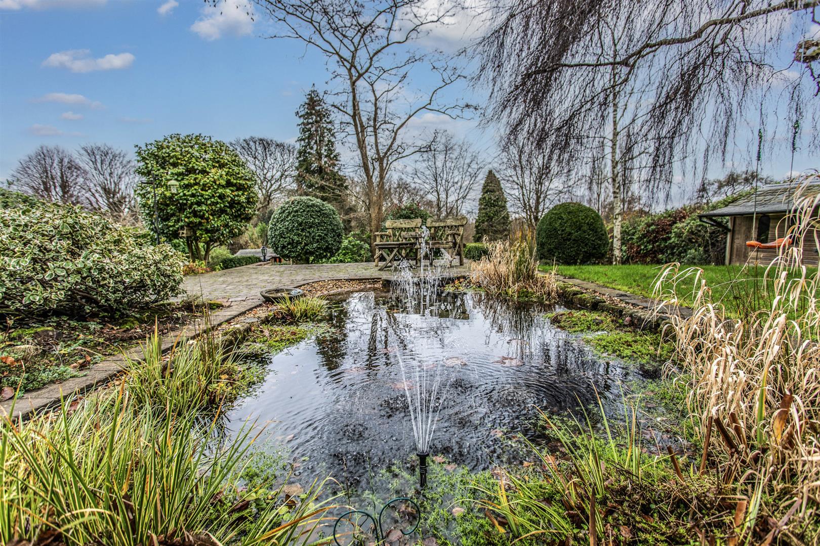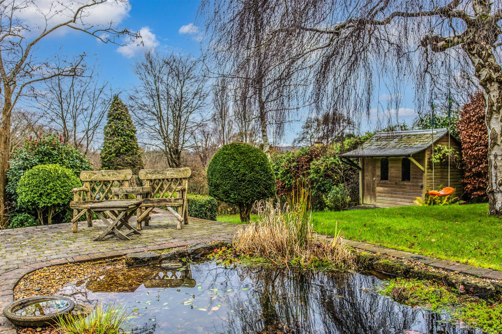 - Glorious south-facing gardens of approx. 150’ x 84’ with lawns, borders, pond and large outbuilding