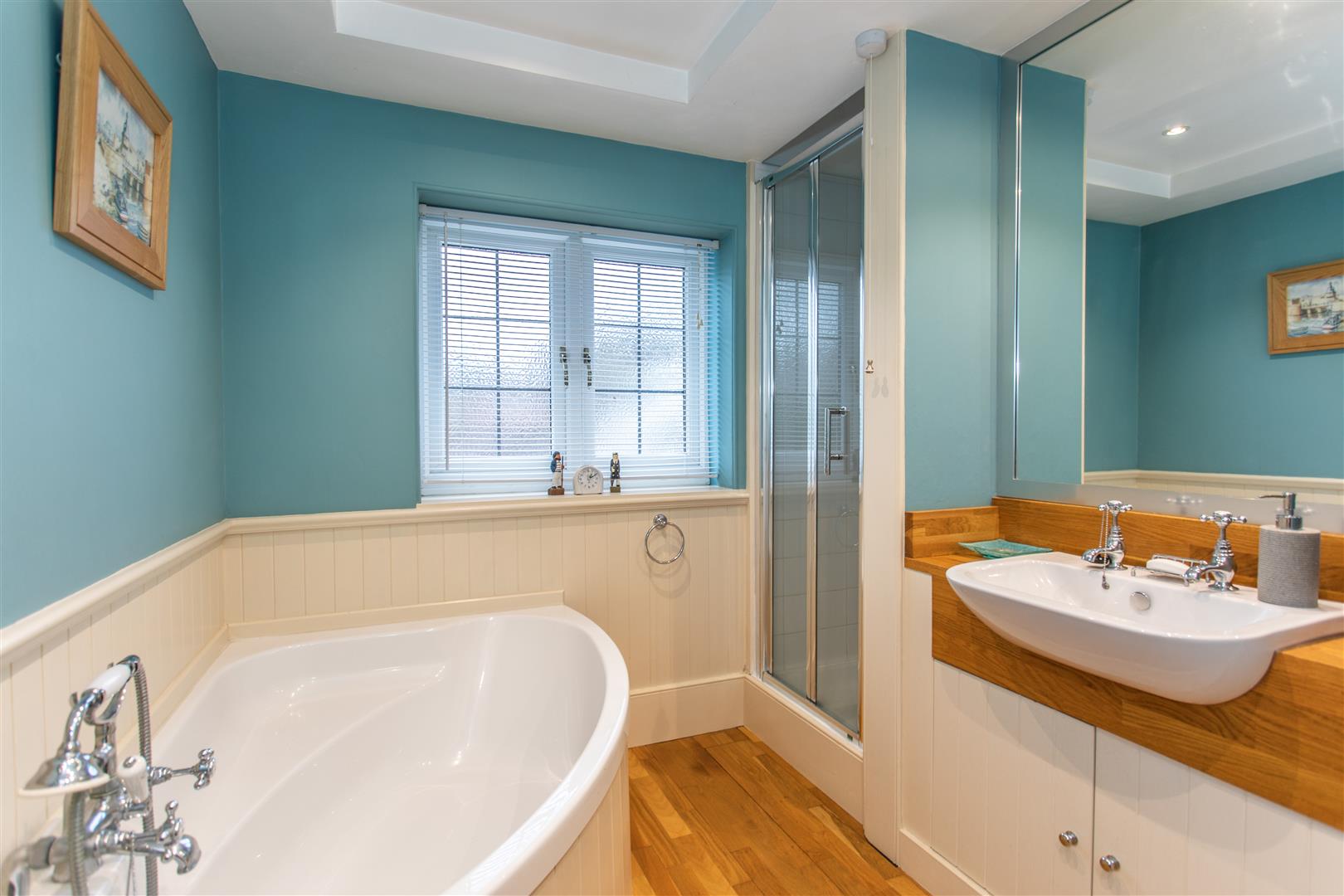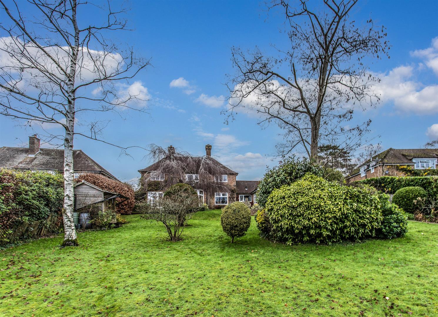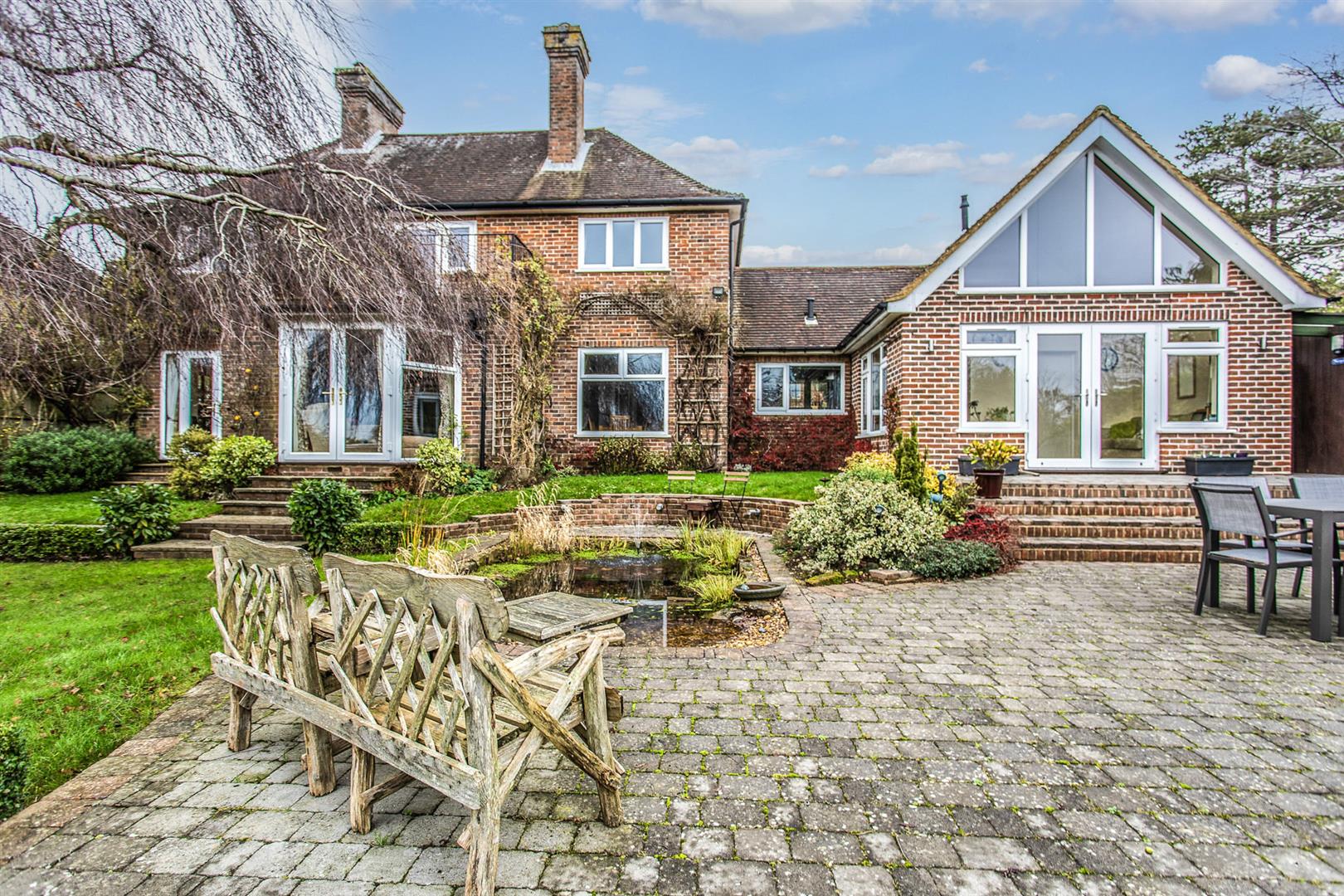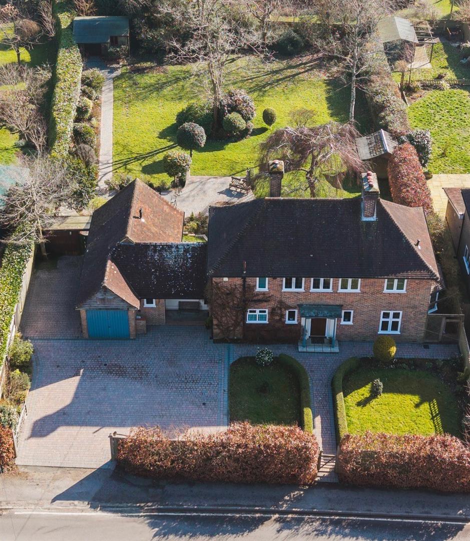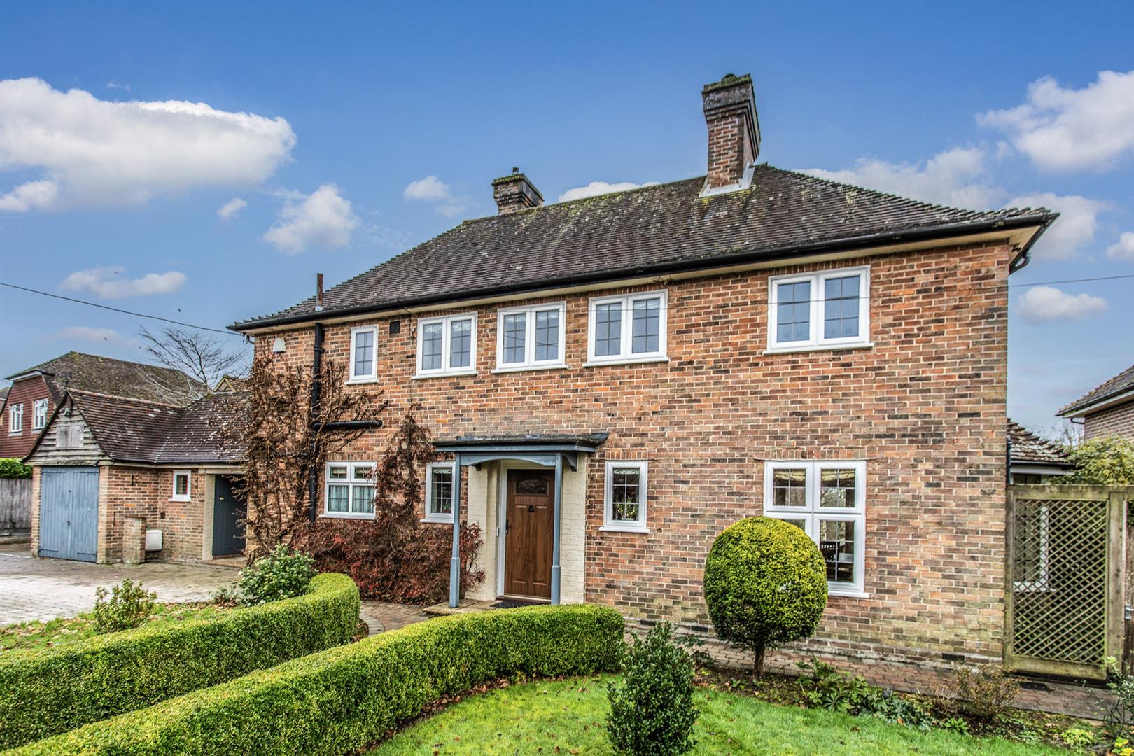 Set behind gated access in the heart of the sought-after village of Buxted, this beautifully presented detached 1930s home offers elegant, light-filled accommodation seamlessly blending period charm with modern living. The ground floor features a welcoming entrance hall, cloakroom, and a superb flow of reception spaces including a double-aspect drawing room with log burner and garden access, a triple-aspect dining room with bay window and fireplace, and a charming breakfast room leading to a country kitchen fitted with natural wood worktops, integrated appliances and a double Butler sink. A striking garden room with vaulted ceiling and glazed gable end opens directly onto the terrace, complemented by a home office and versatile workshop/store.