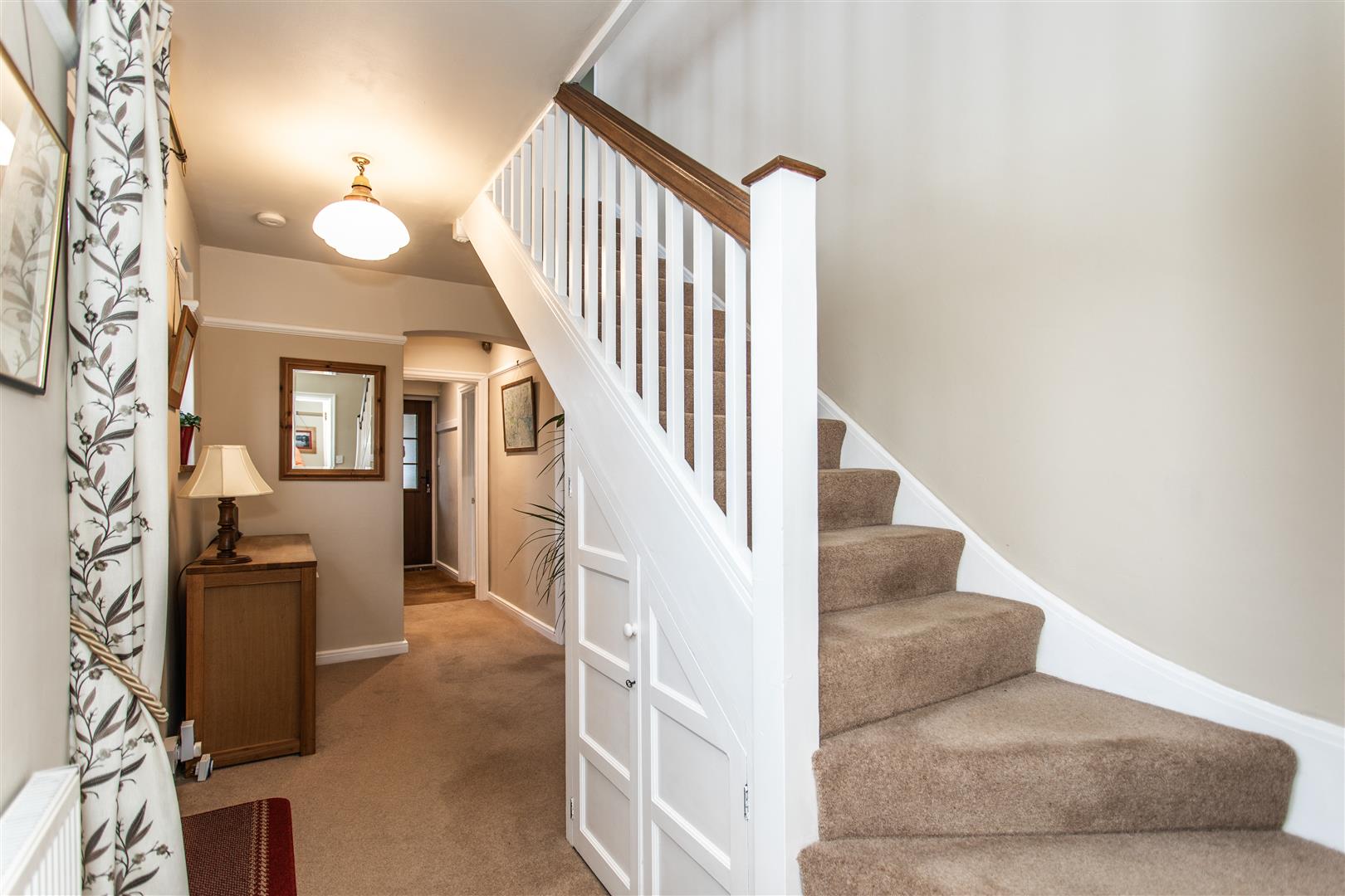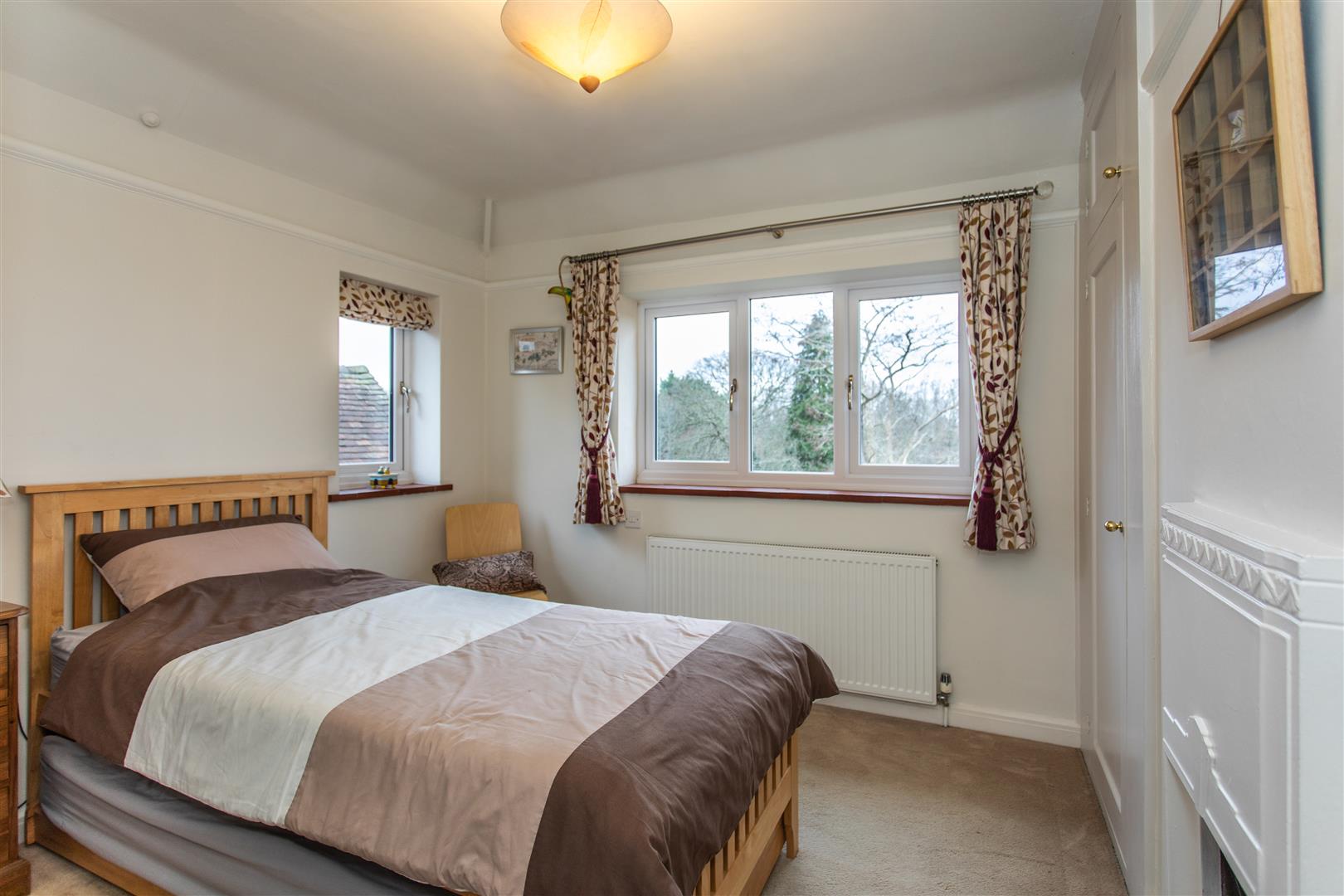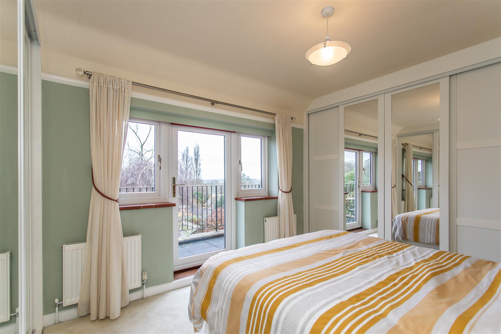The first floor is arranged around a spacious galleried landing and offers three beautifully proportioned bedrooms. The principal suite enjoys a double aspect, fitted wardrobes and a modern en suite shower room, while the second bedroom benefits from built-in wardrobes and a private balcony overlooking the gardens. A generous third bedroom retains its original fireplace, served by a well-appointed family bathroom.