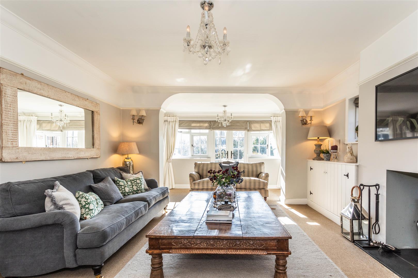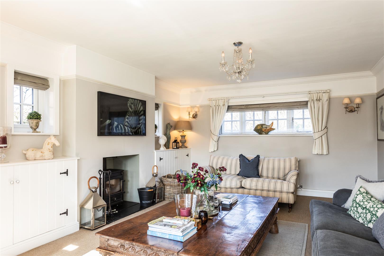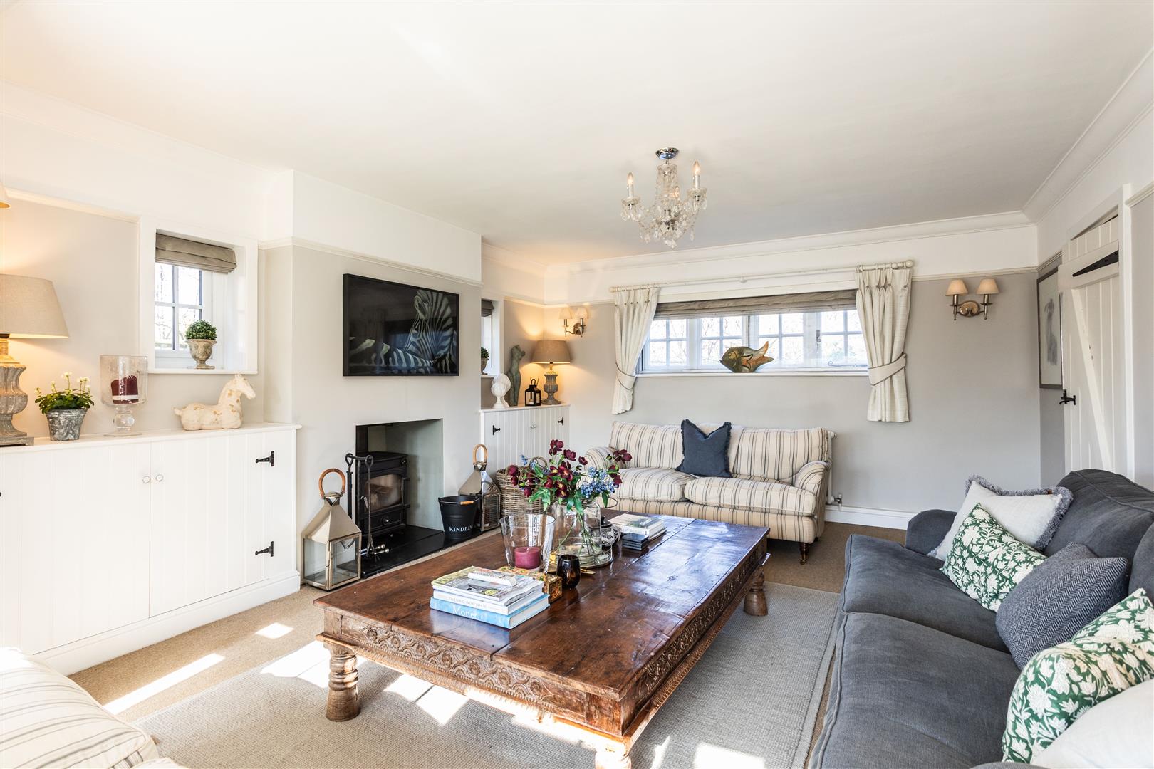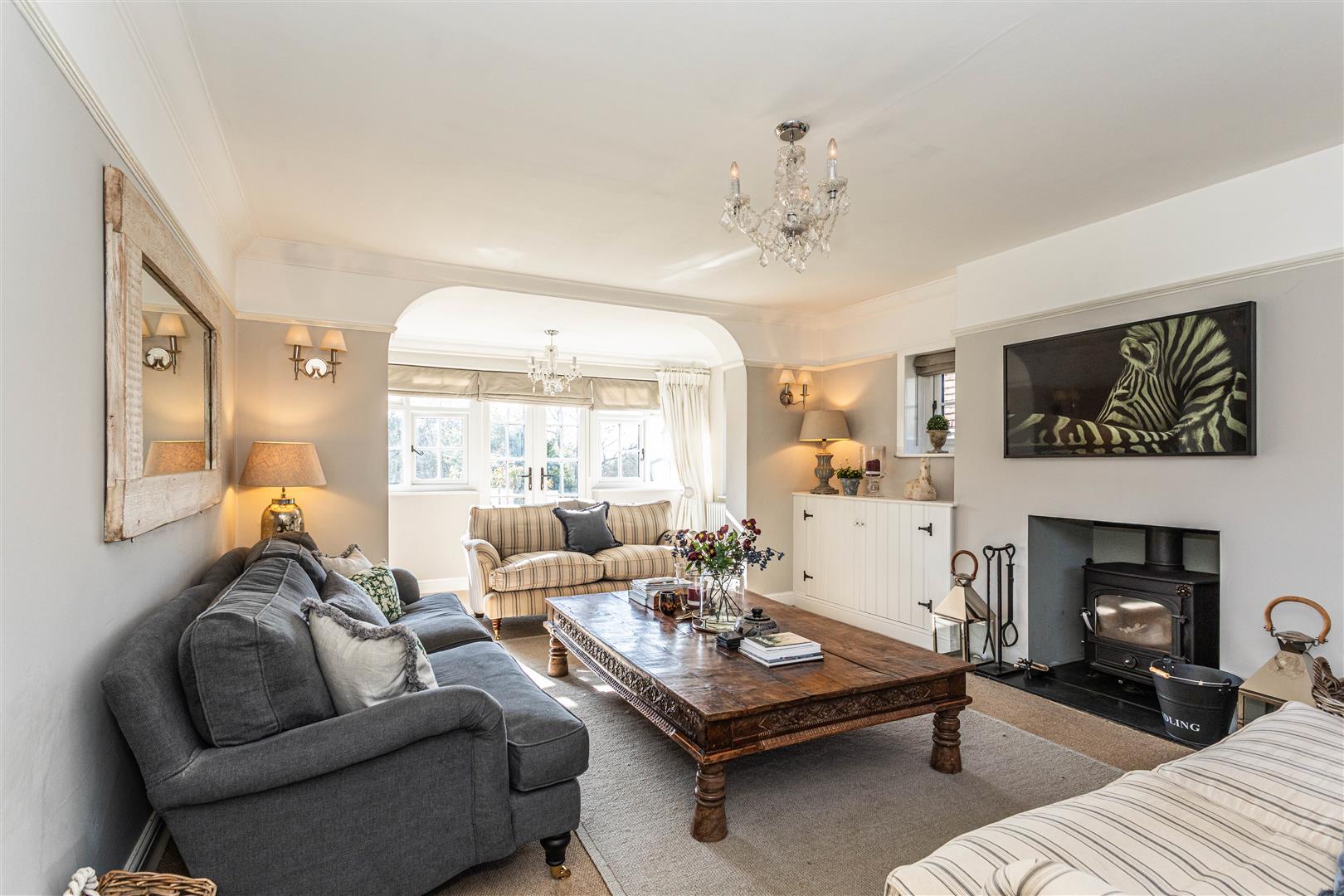 - Elegant triple-aspect drawing room with wood-burning stove and French doors to terrace