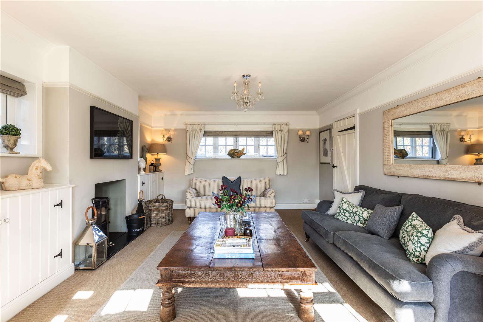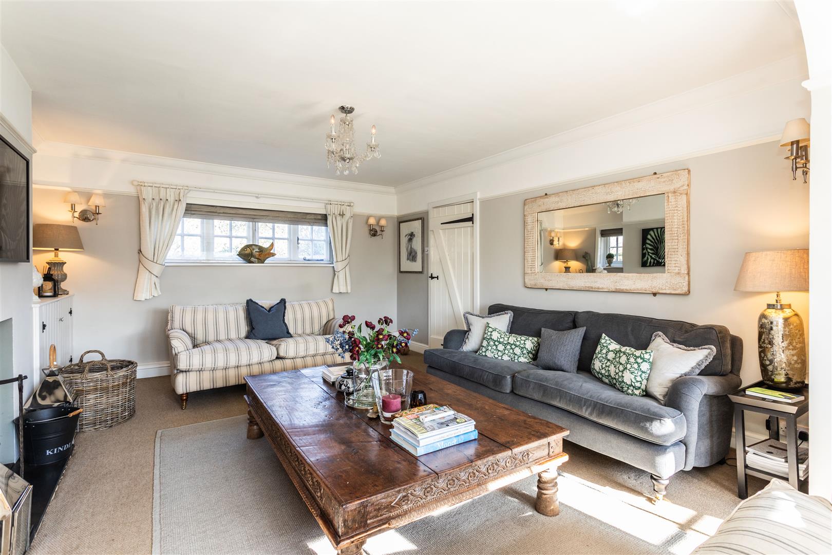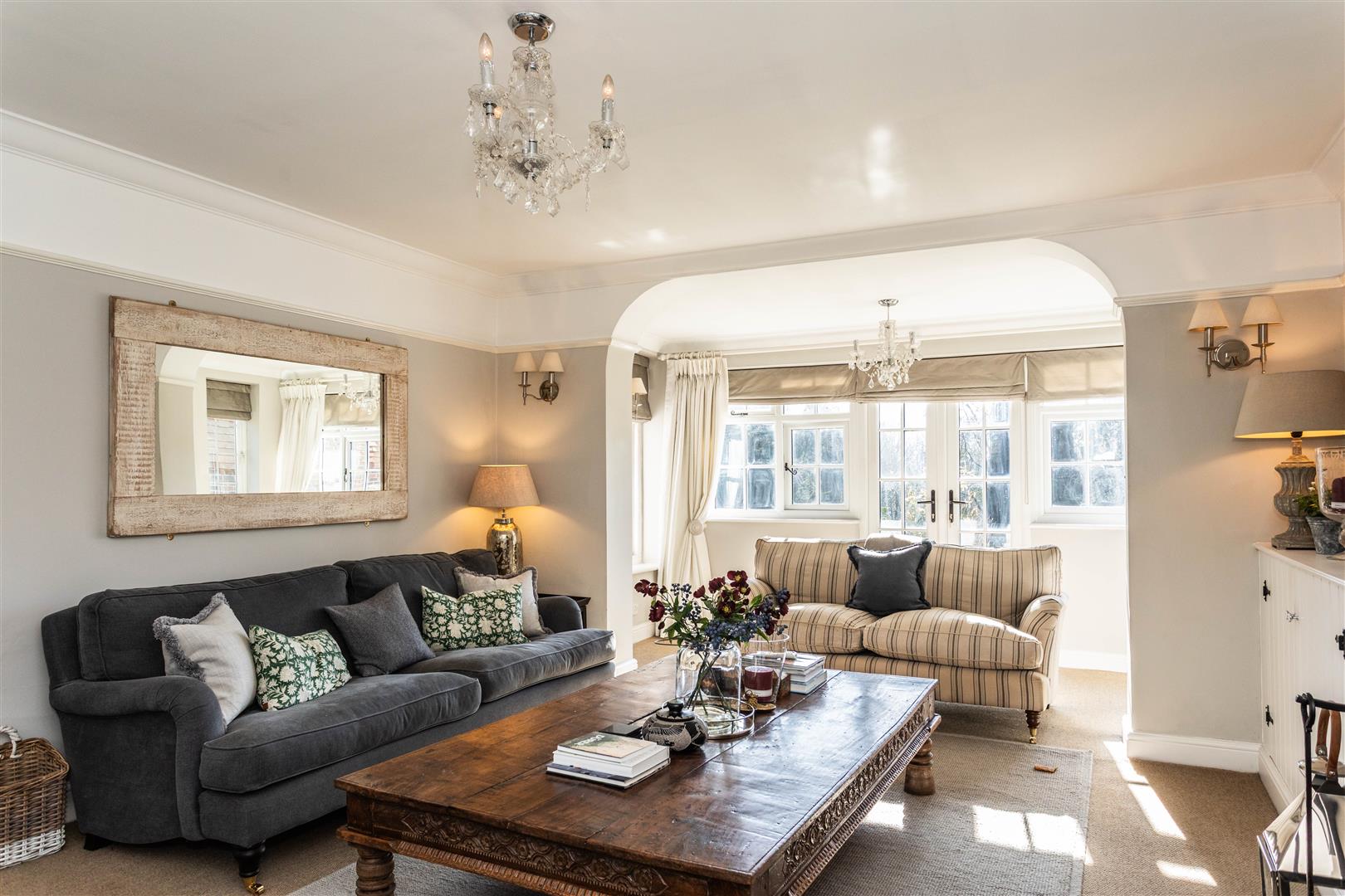 - Elegant triple-aspect drawing room with wood-burning stove and French doors to terrace