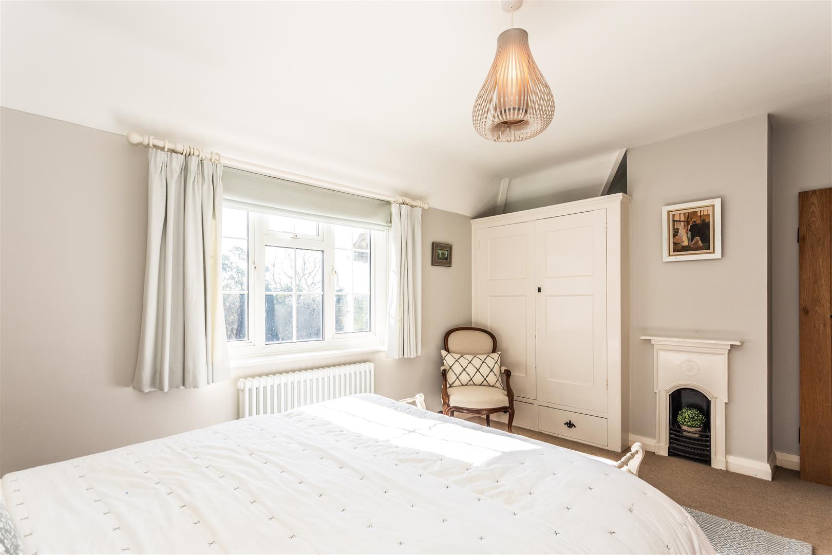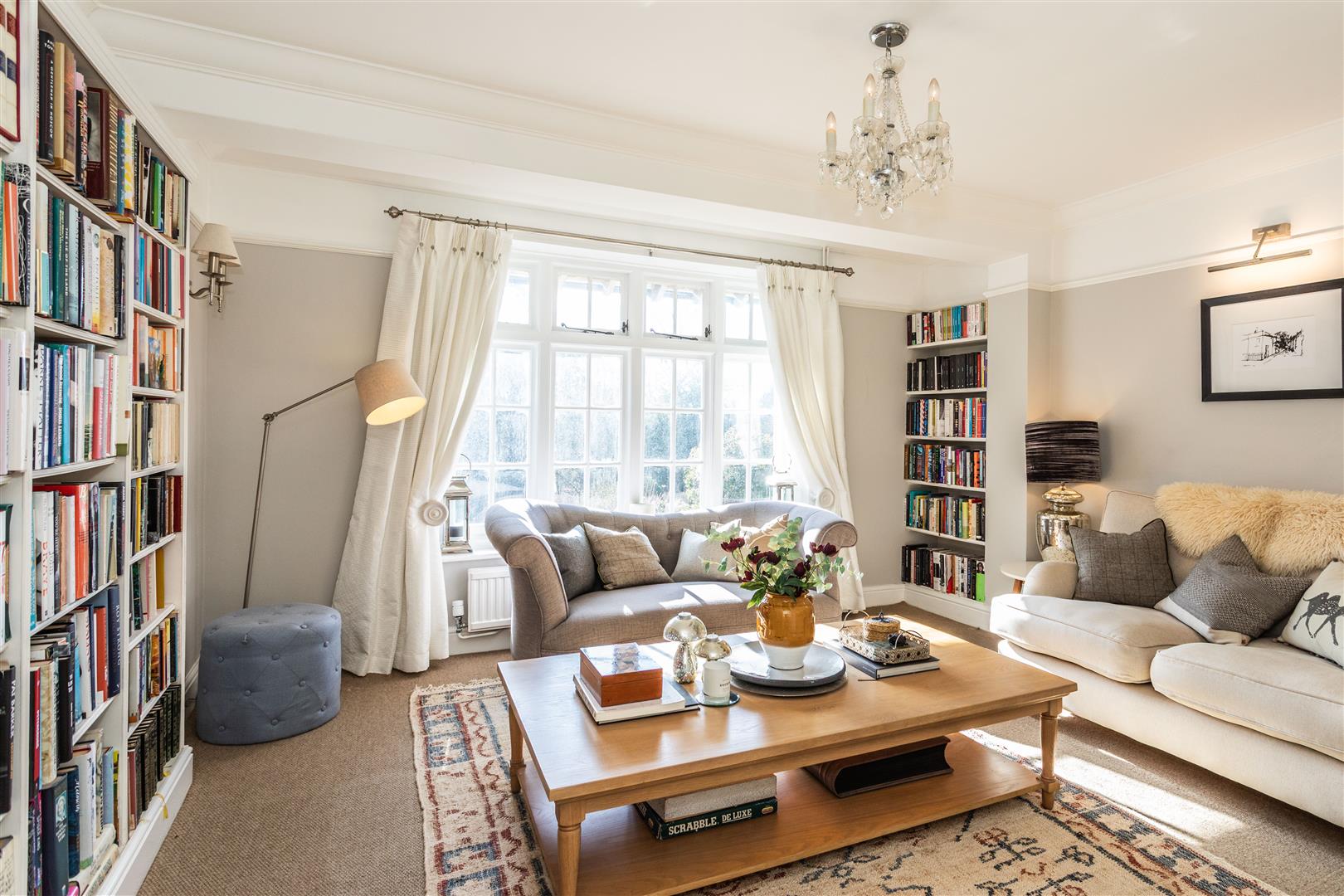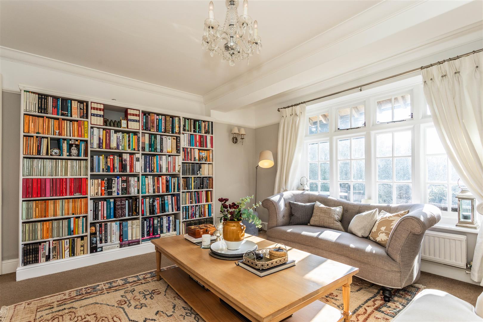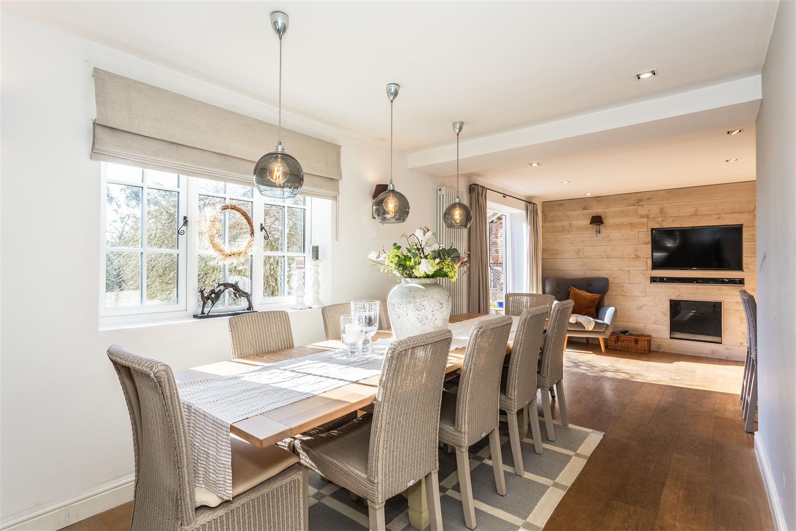 - Elegant triple-aspect drawing room with wood-burning stove and French doors to terrace