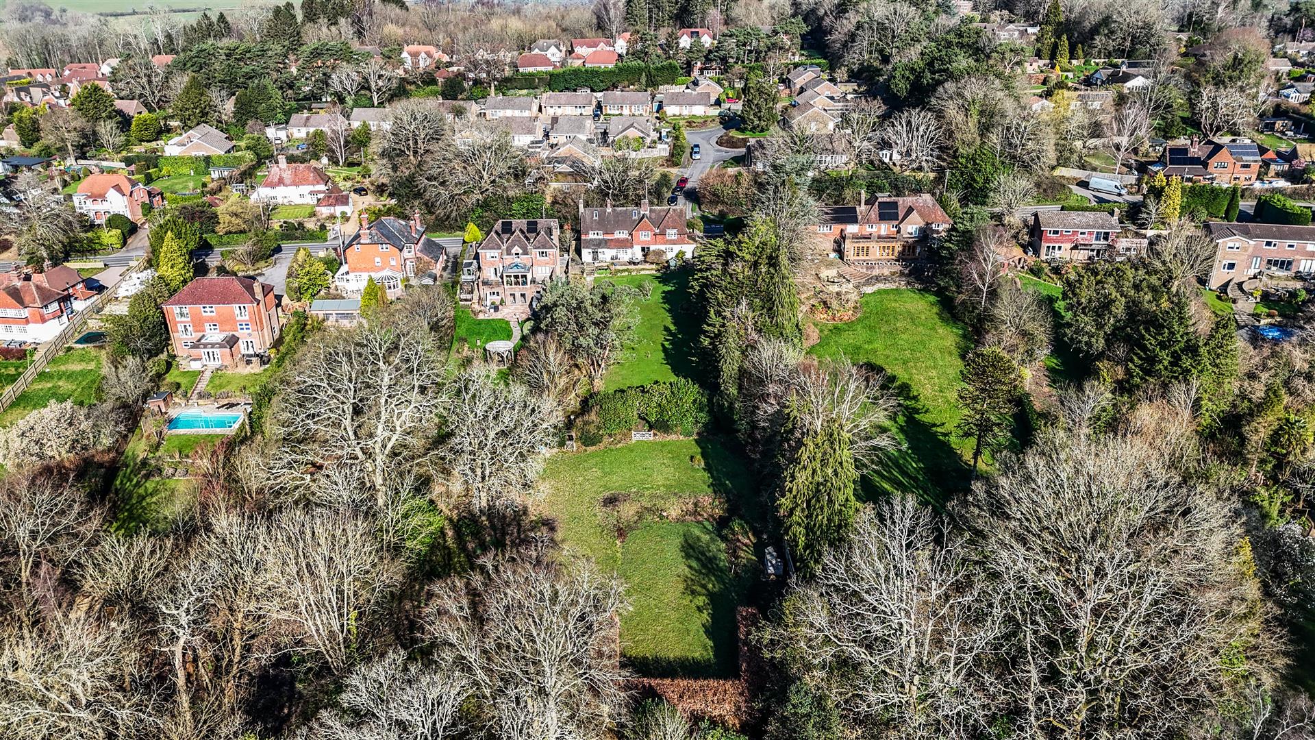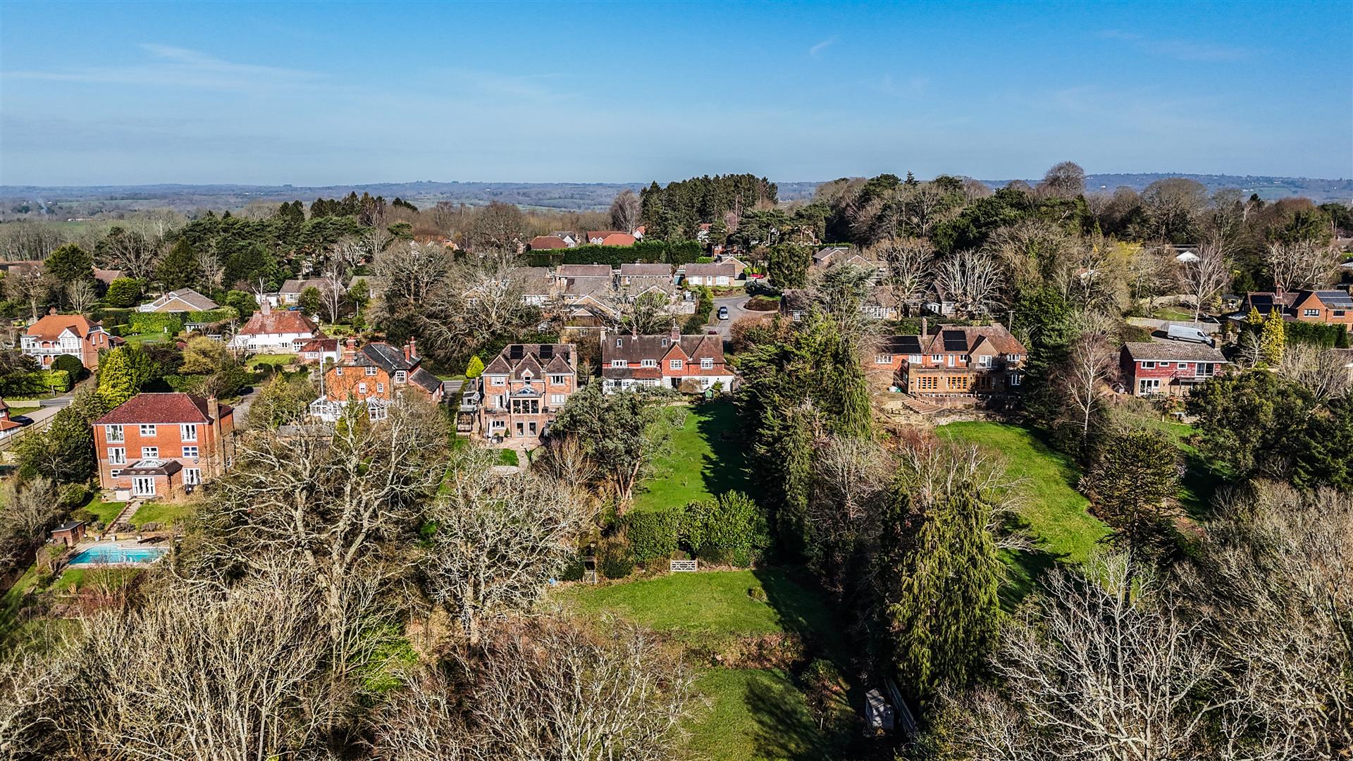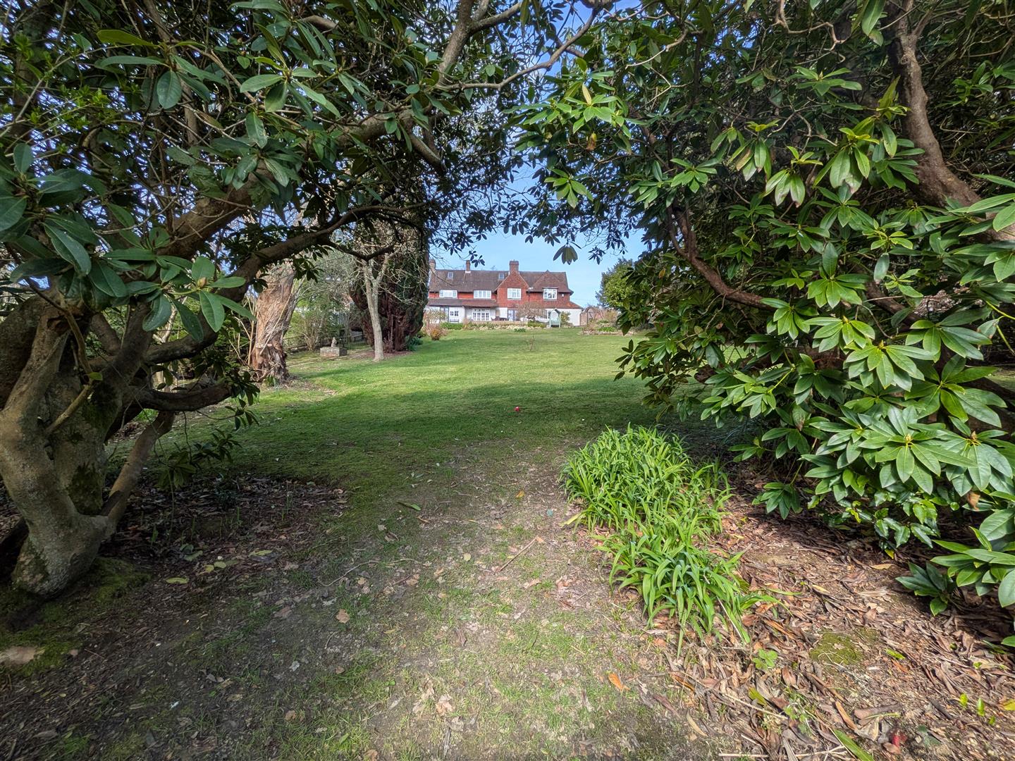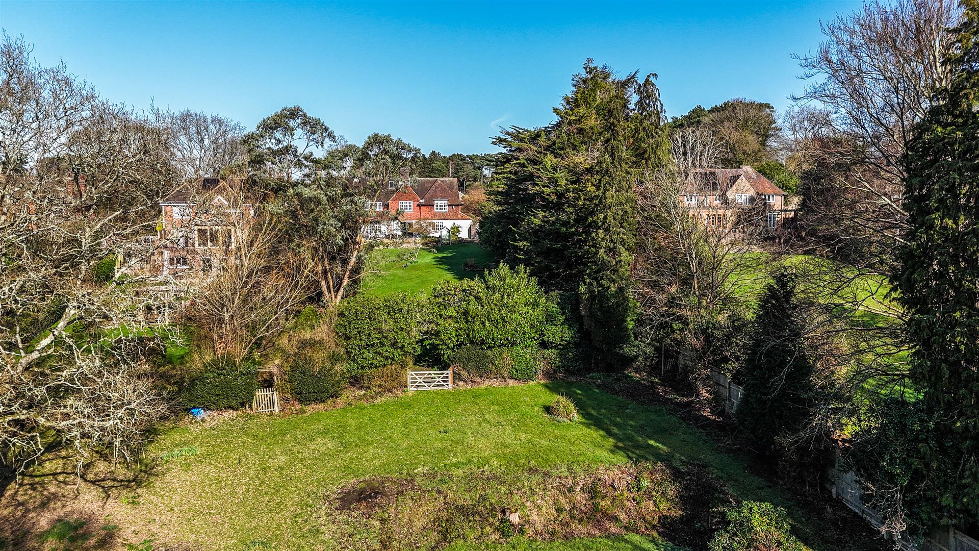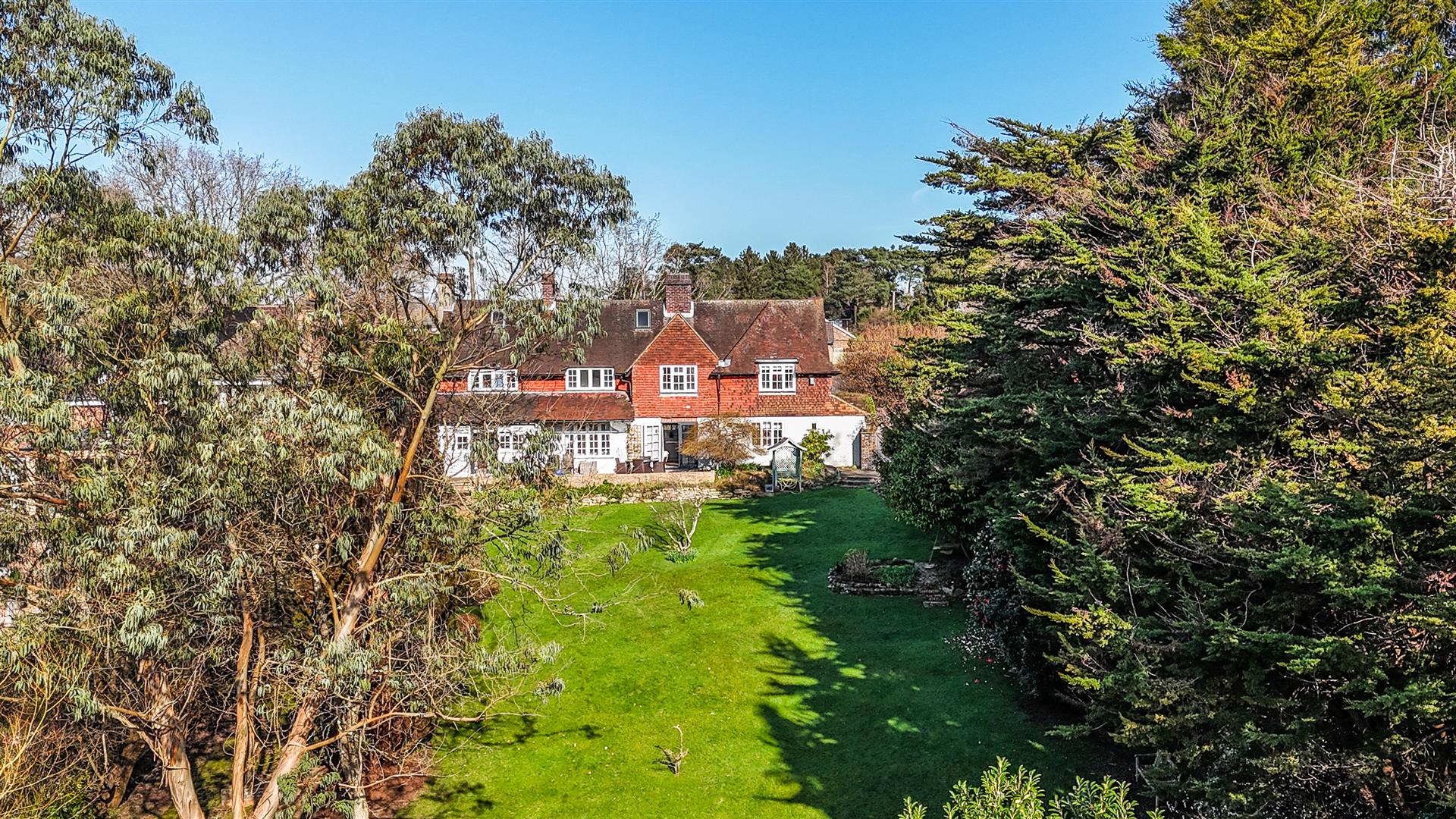 - Broad rear terrace and sweeping lawns framed by specimen trees and flowering shrubs