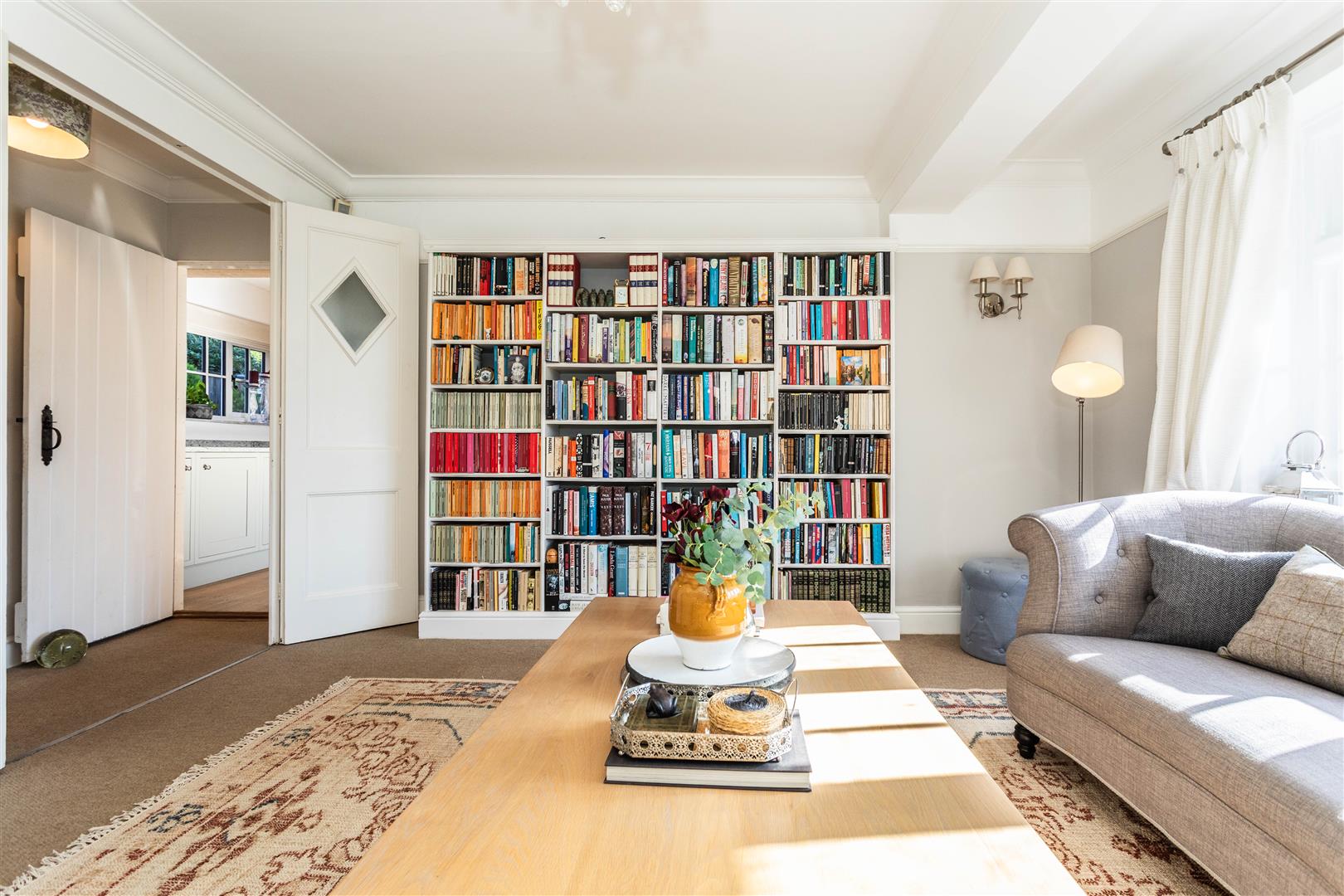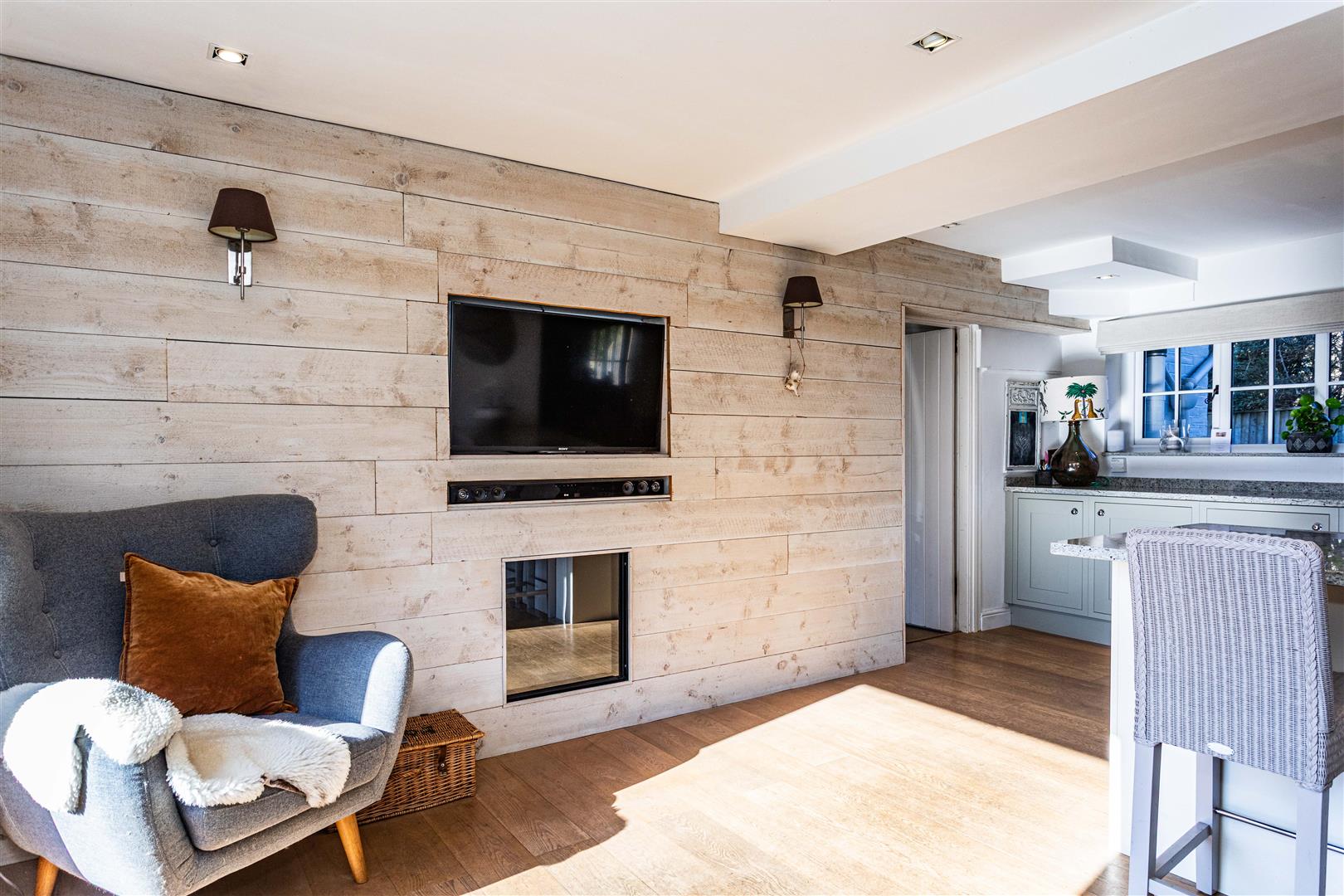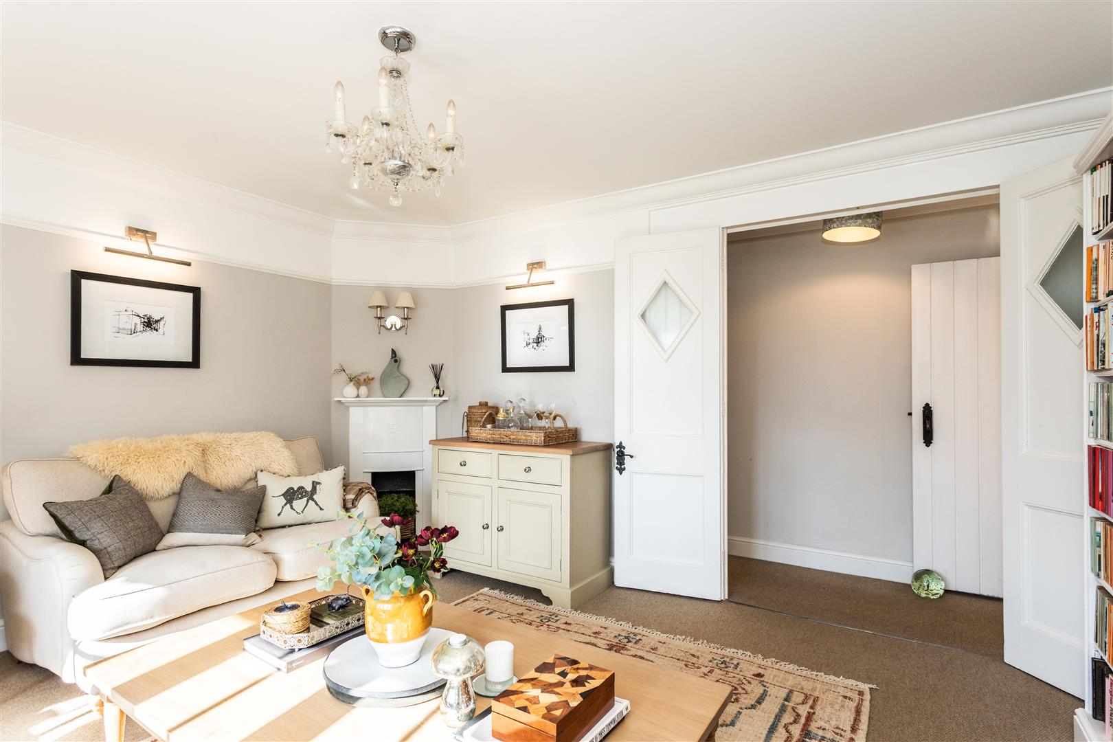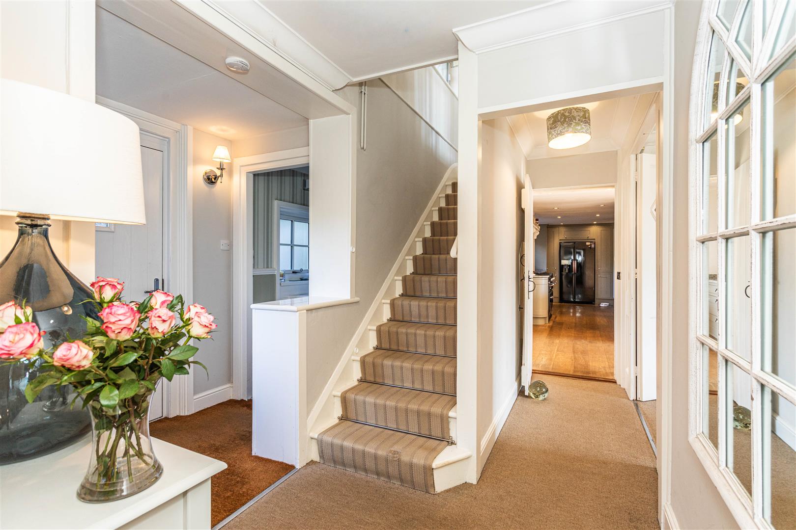 A welcoming entrance hall with cloakroom leads to elegant reception spaces ideal for entertaining and family life. The triple-aspect drawing room features a wood-burning stove, bespoke cabinetry and French doors to the terrace. A cosy snug with ornate fireplace and fitted shelving provides a quieter retreat.