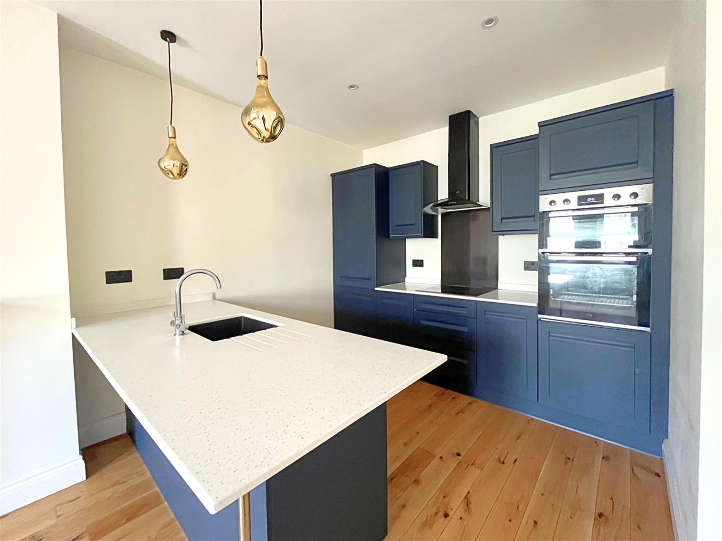 Comprises an open-plan living space with a luxury kitchen, two bedrooms, a modern bathroom, and exposed varnished floorboards throughout.
