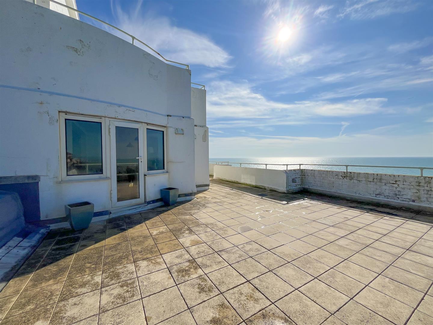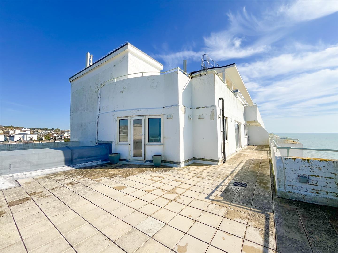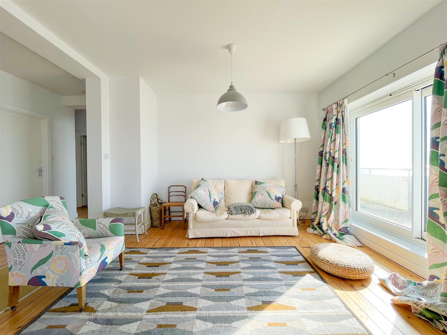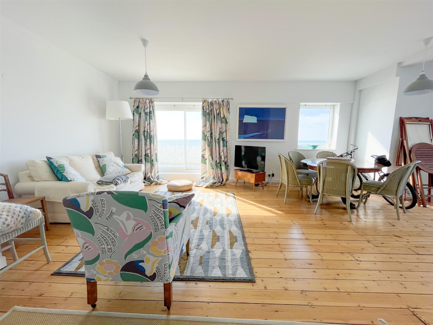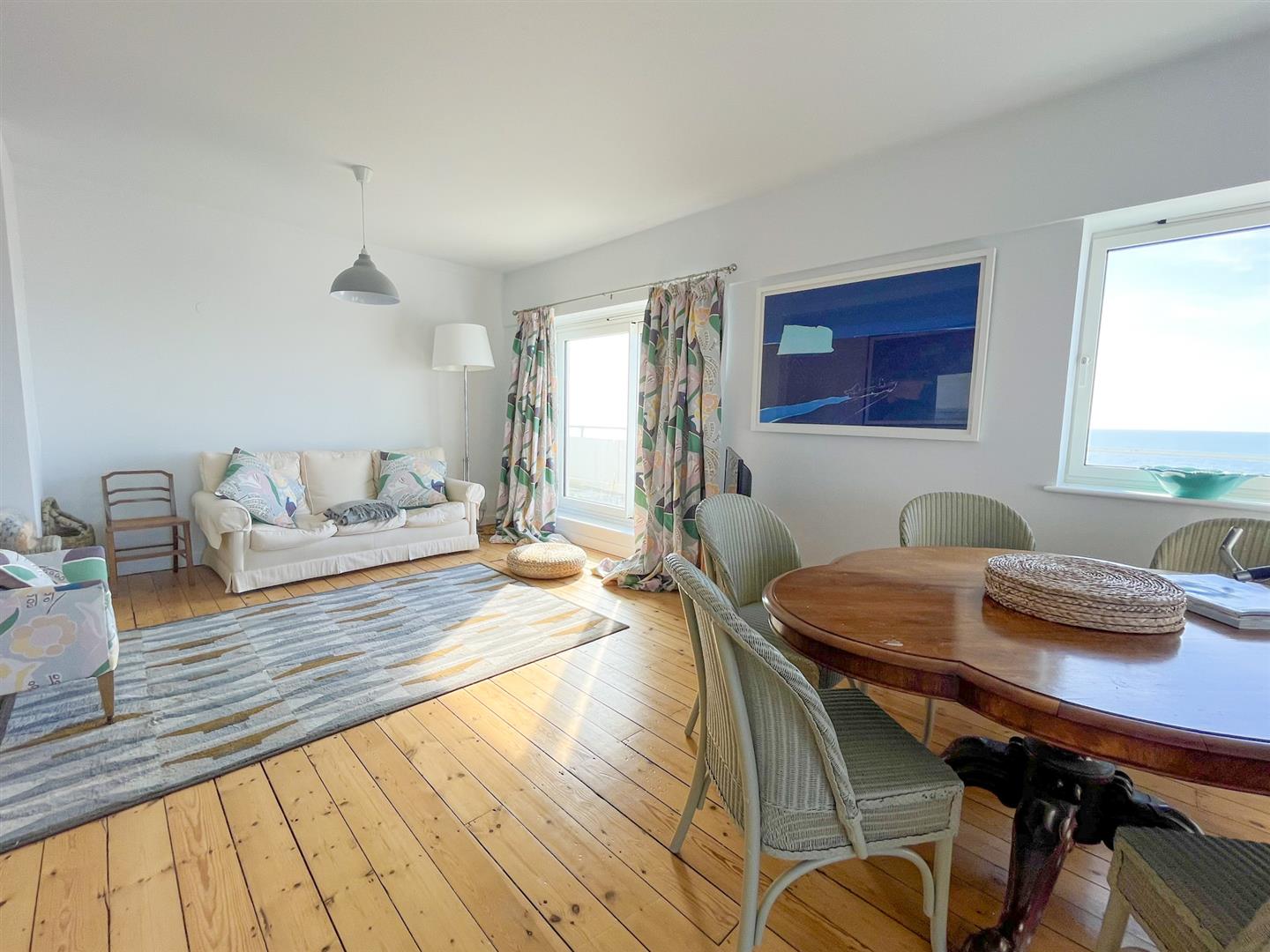 Set in a Grade II-listed art deco building on the seafront in St Leonards-on-Sea, this light-filled two-bedroom penthouse apartment has a wraparound balcony with far-reaching ocean views.