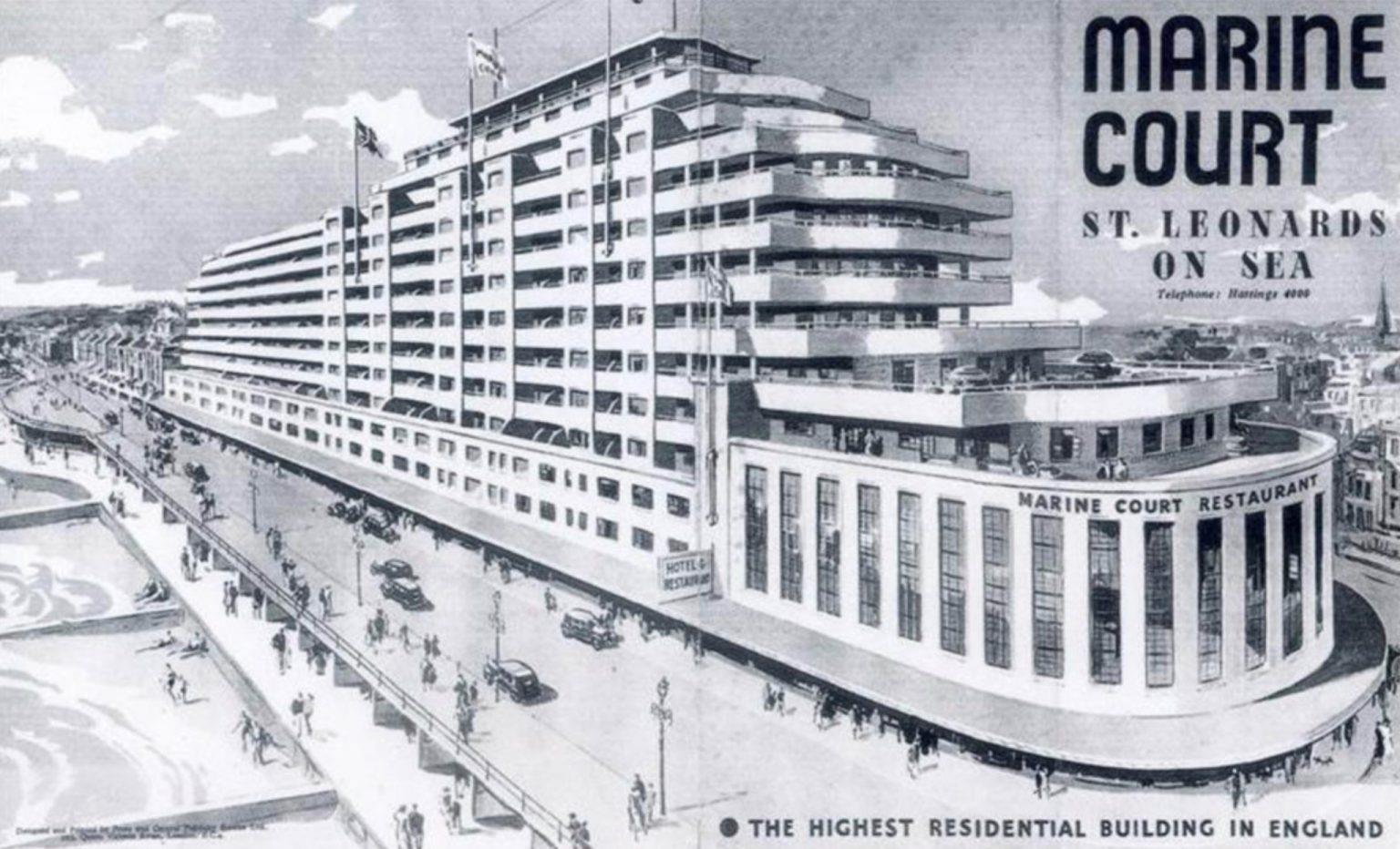 The first foundations of Marine Court were laid in 1936, with construction completed in 1938. An early pioneer of steel-frame construction, the building is 14 storeys high and sits broadside to the seafront. Its form was took inspiration from the Queen Mary, a transatlantic cruise ship which entered commercial service in 1936.
