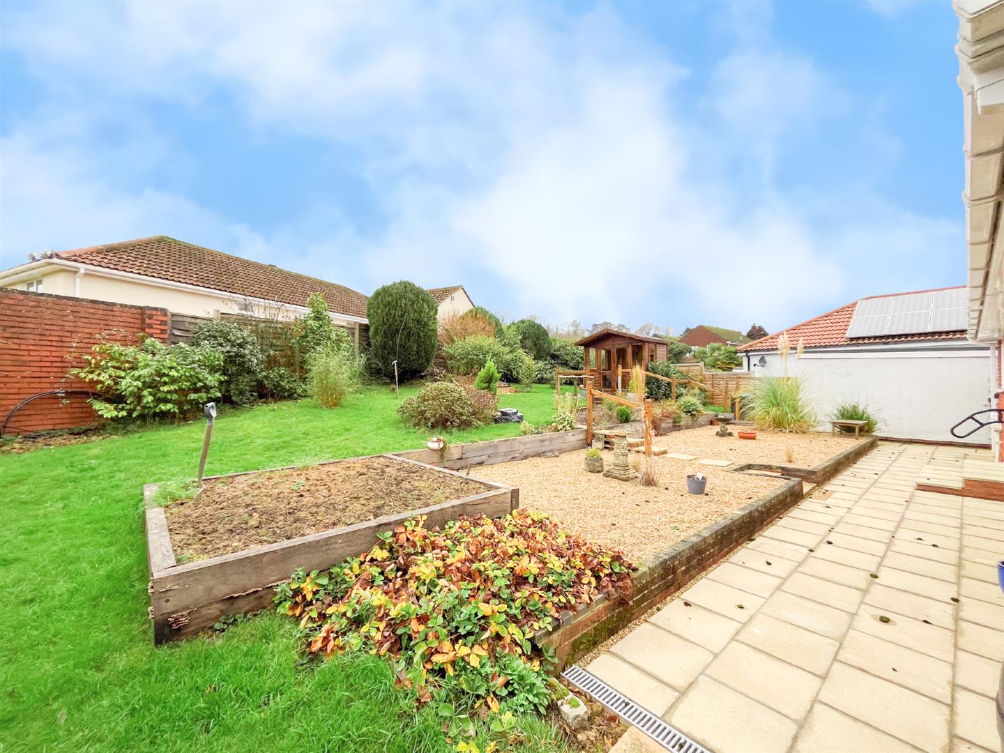 The bungalow sits on a generous plot with a well-maintained garden featuring mature shrubs and planting, providing a pleasant outlook and a good degree of privacy. The garden has clearly been cared for to a high standard and offers an ideal space for both relaxation and entertaining.