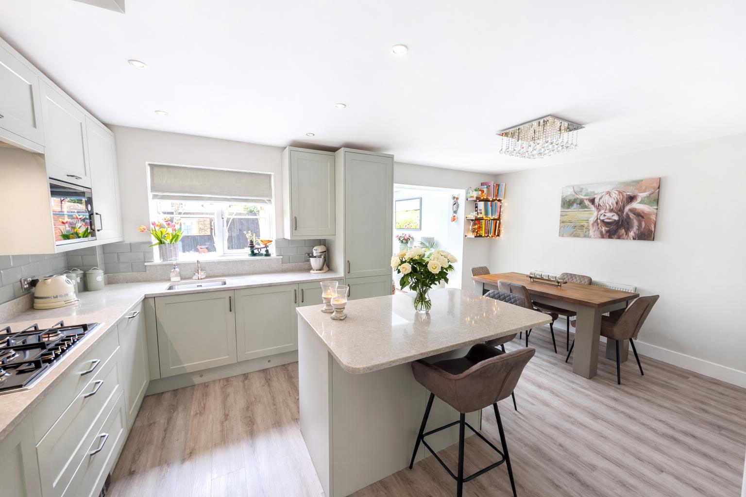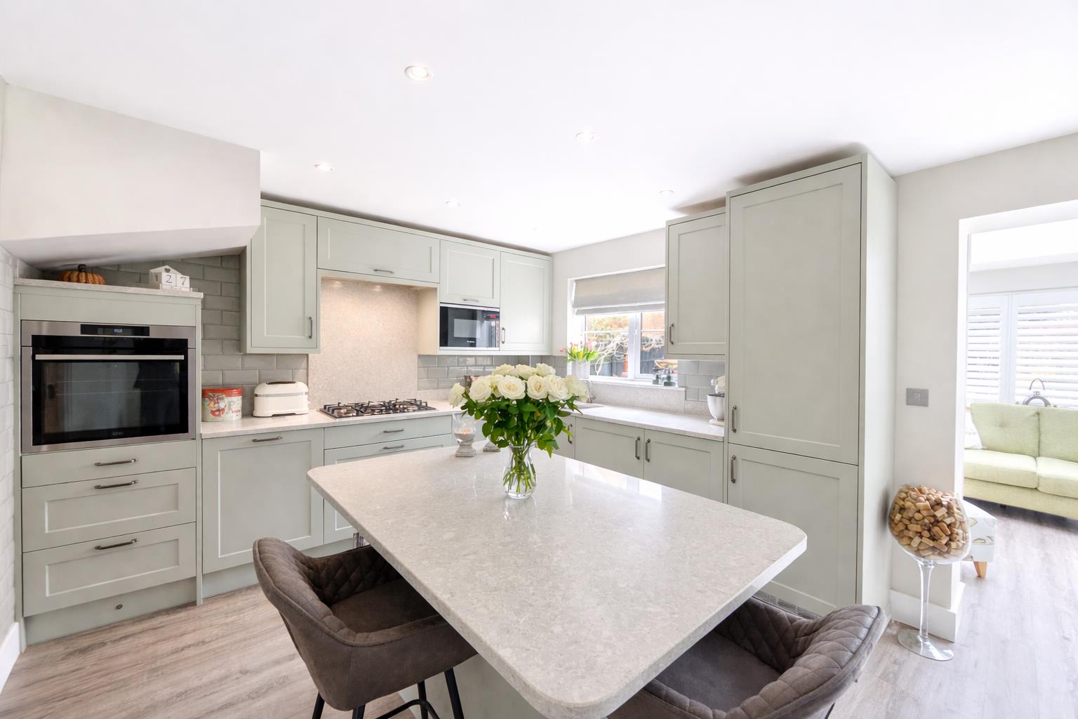 To the rear, the stunning open-plan kitchen/diner is truly the heart of the home. Featuring striking quartz worktops and island along with sage coloured cupboards, this contemporary space is ideal for both everyday living and entertaining. The kitchen flows seamlessly into a beautiful orangery, adding further versatile living space bathed in natural light — perfect for relaxing or hosting guests all year round.