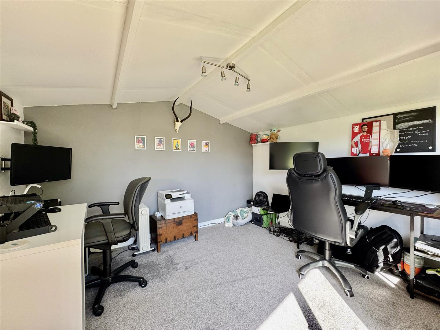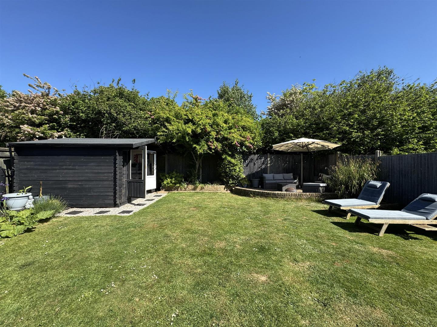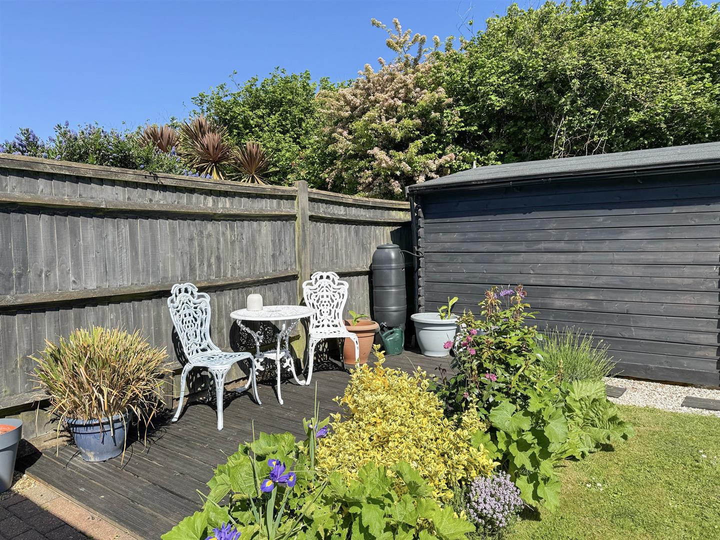 The enclosed rear garden is a true highlight, offering a paved patio area directly off the property, a central lawn, an additional patio area to the rear, a decking area, garden storage shed, and an outbuilding with power, perfect for a home office or hobby room.