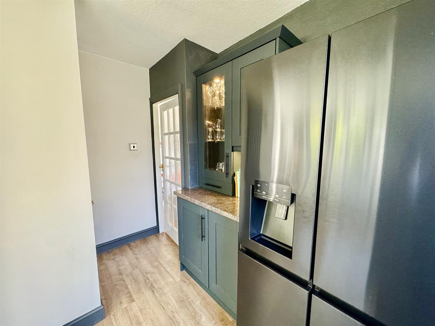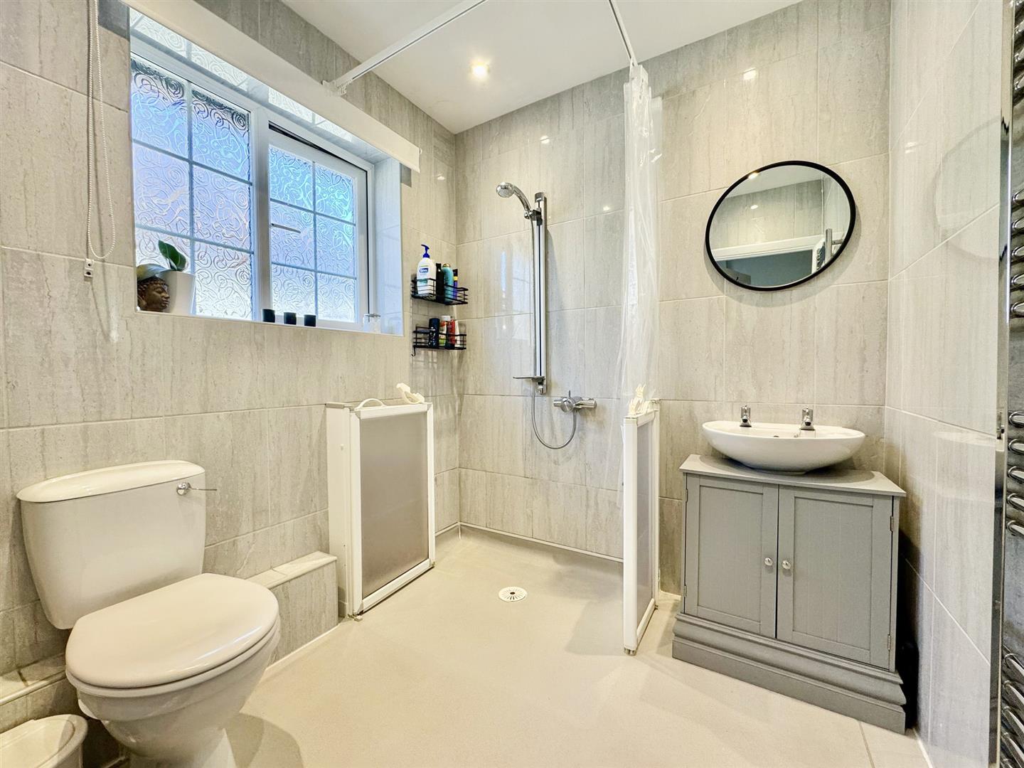 The separate dining room offers direct access to the rear garden and leads through to a well-appointed kitchen, fitted with a comprehensive range of wall-mounted and matching base units with ample work surface space. A modern wet room with a three-piece suite completes the ground floor layout.