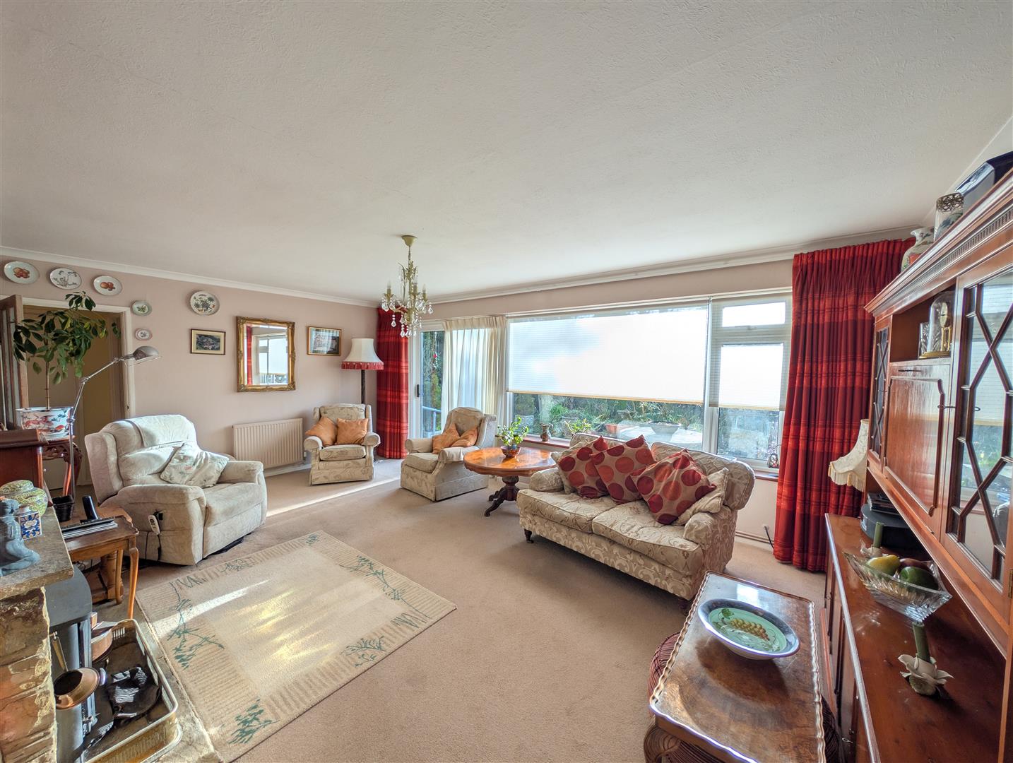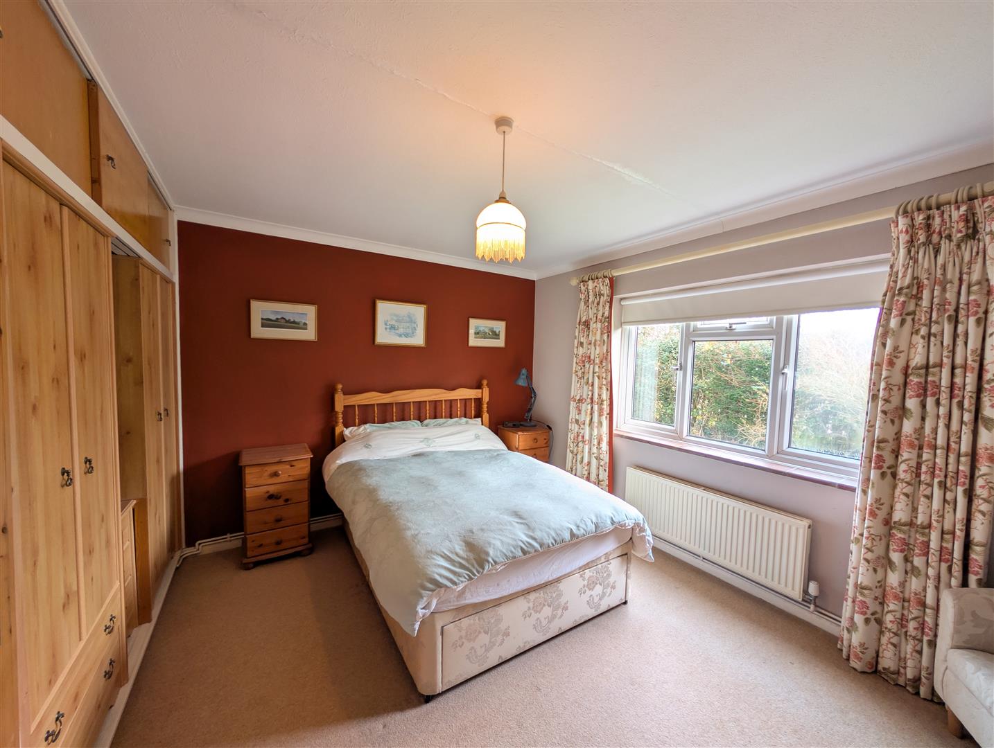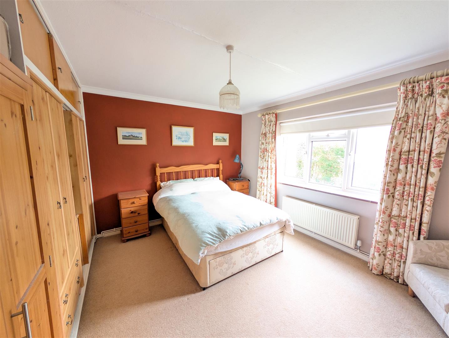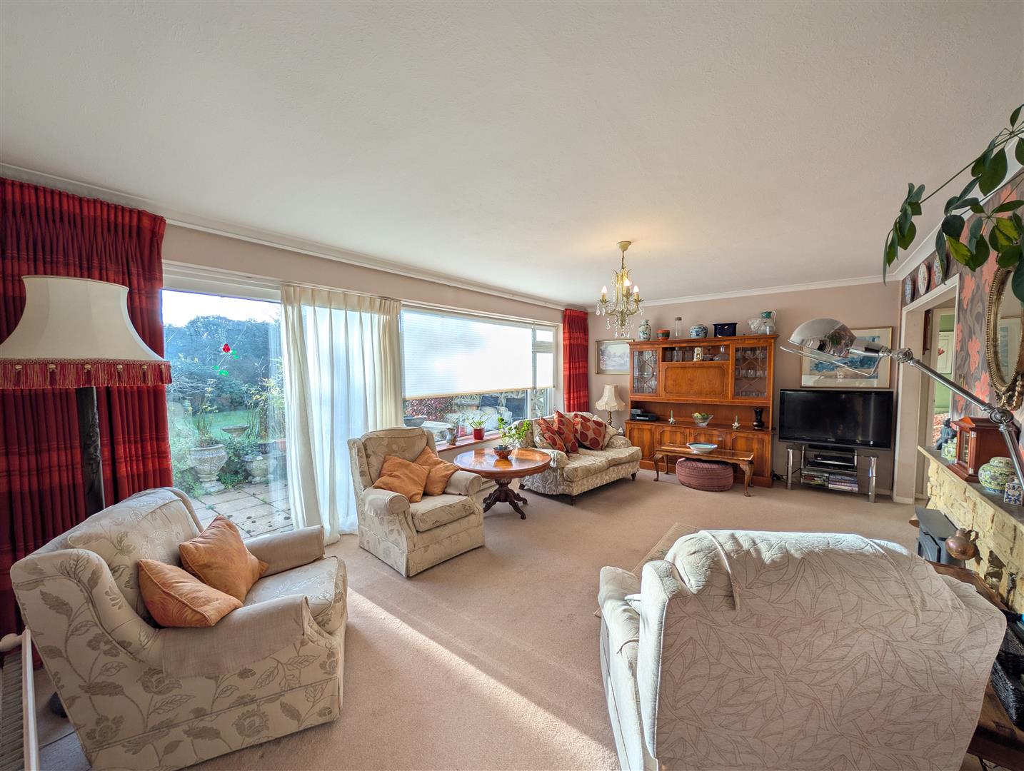 The spacious lounge is bathed in natural light and features delightful outlooks over the front garden, with doors opening onto the patio for seamless indoor-outdoor living. An inner hallway leads to three generous double bedrooms, all served by a contemporary family bathroom and a separate shower room.