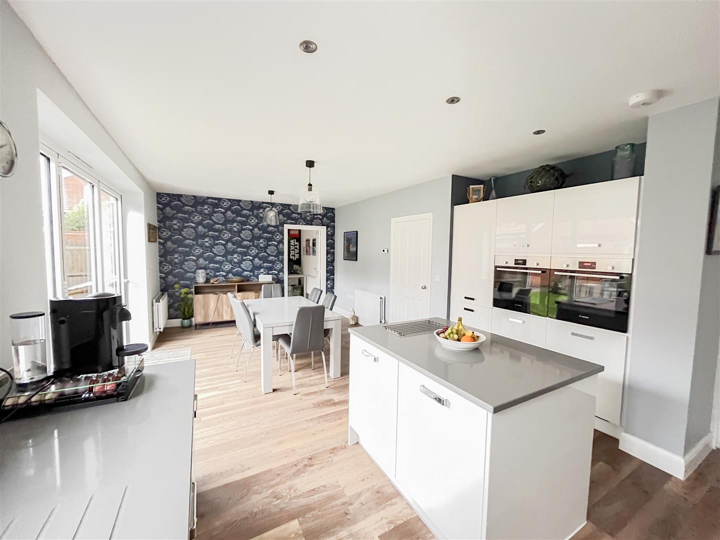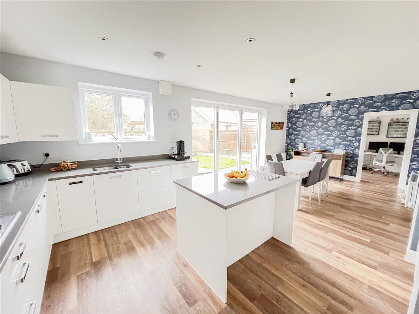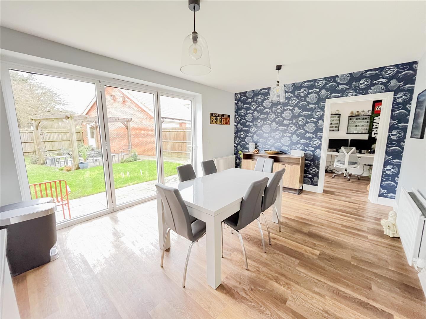 The accommodation is both modern and flexible, featuring two additional reception rooms ideal for use as a study and playroom, alongside a generous lounge with an attractive log burner. The heart of the home is the very large kitchen/diner, which benefits from bi-folding doors opening directly onto the rear garden, creating an excellent indoor-outdoor entertaining space. This is further complemented by a separate utility room and a convenient cloakroom.