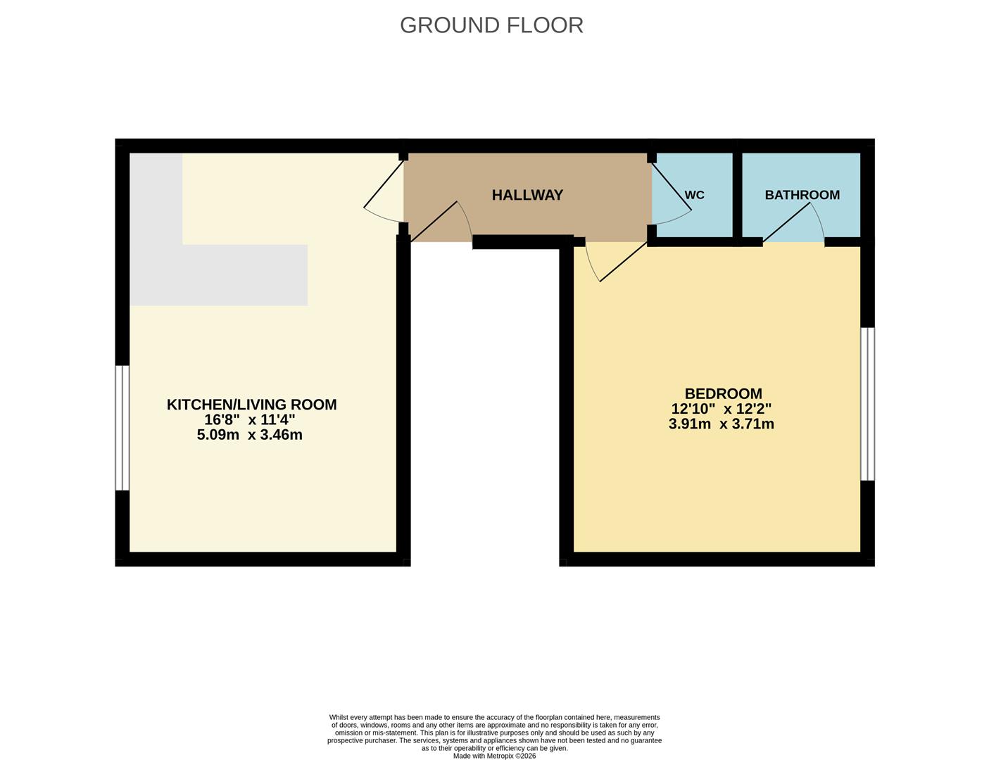 The accommodation comprises a bright open-plan living room/kitchen, a generous double bedroom with en-suite bathroom featuring a shower over the bath, and a separate WC. Large windows allow for plenty of natural light, creating a spacious and airy feel throughout.