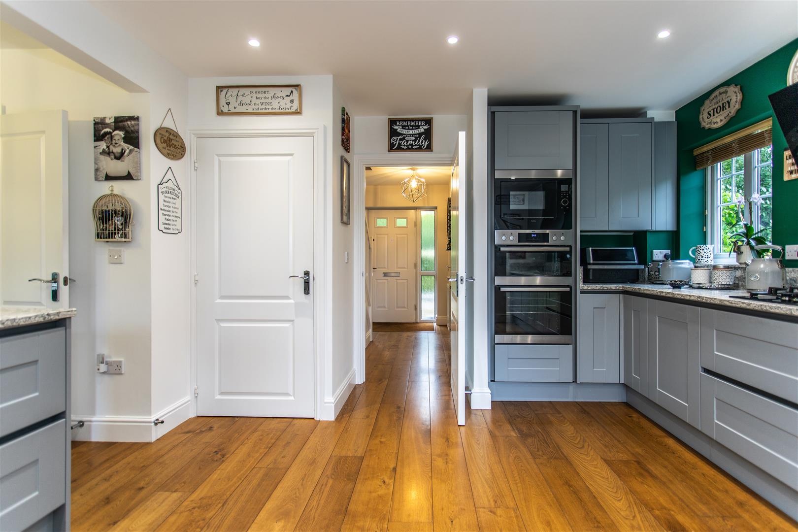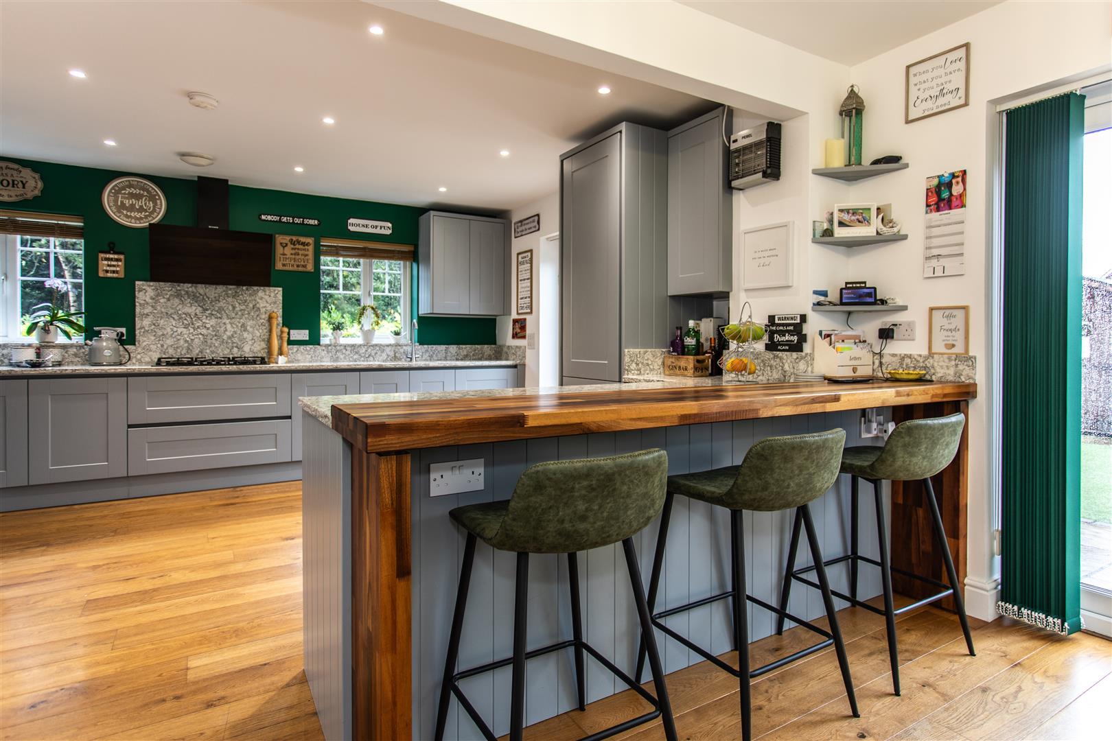 Step inside to a welcoming hallway with cloakroom and utility. The heart of the home is the impressive open-plan kitchen/dining room – refitted with integrated appliances, a stylish peninsula island, a walk-in larder and French doors opening onto the landscaped garden.