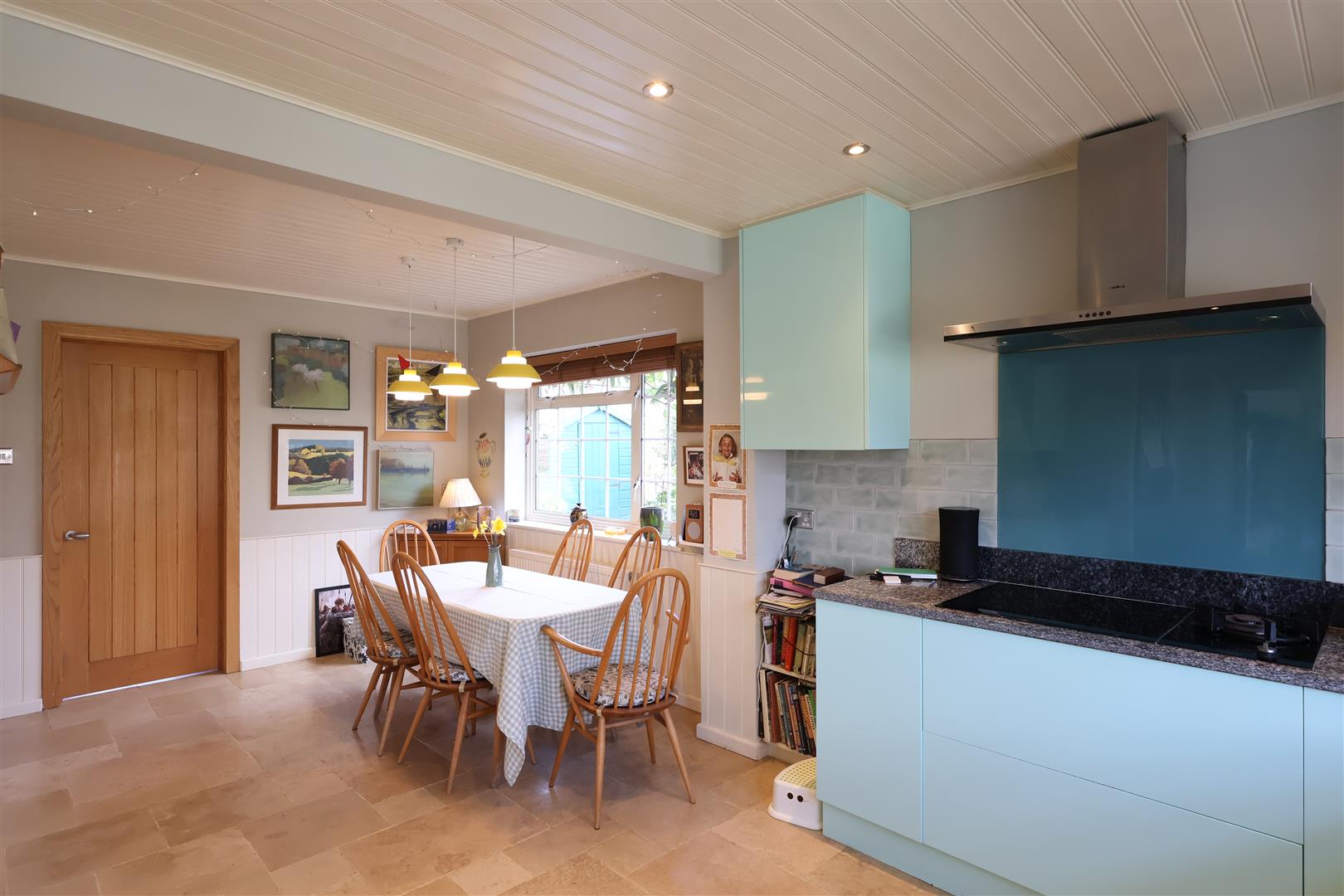 To the rear, the property opens into a generous L-shaped kitchen, dining and utility space, designed with both everyday living and entertaining in mind. This sociable area offers a natural flow and enjoys direct access to the beautifully maintained rear garden, creating a private and peaceful outdoor setting. The property is heated via an oil fired system, with the kitchen also benefiting from an LPG gas hob.