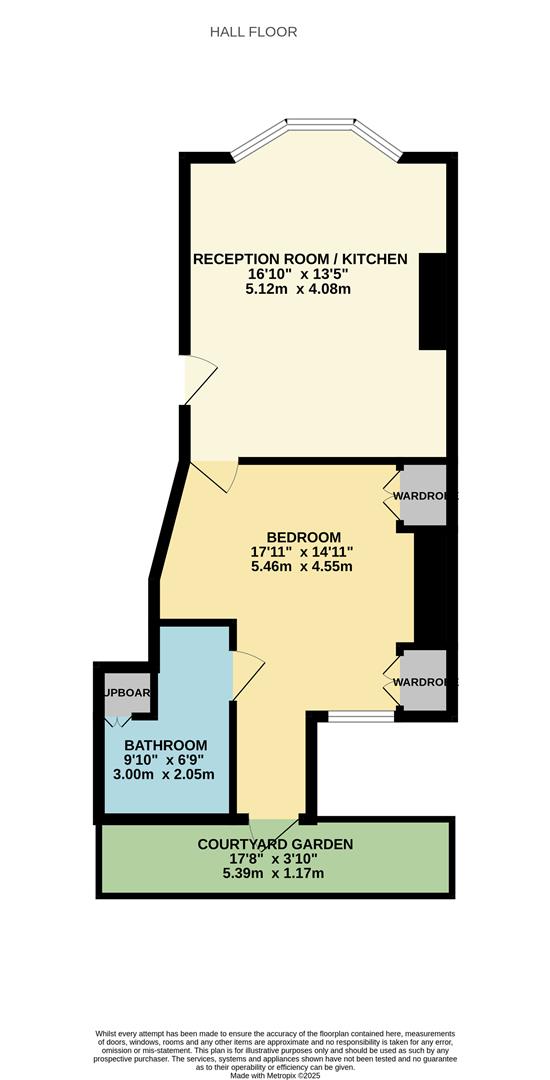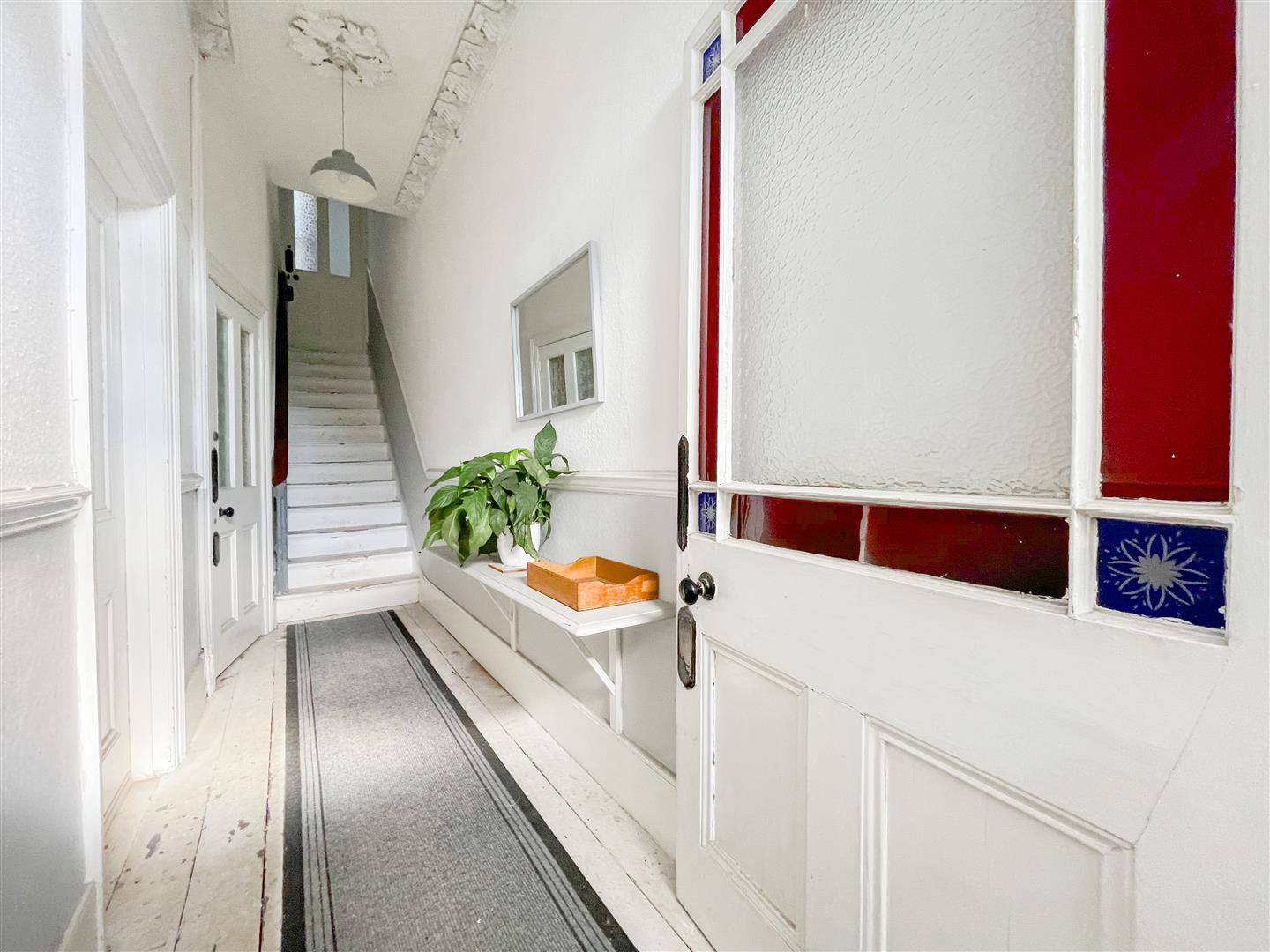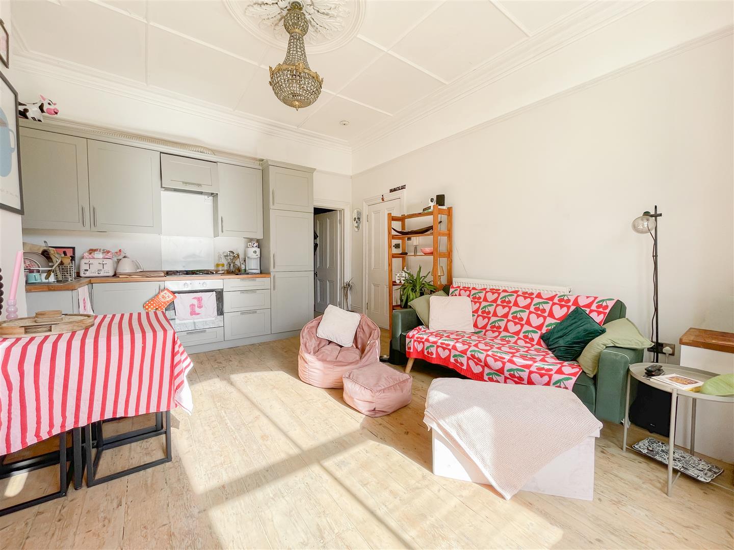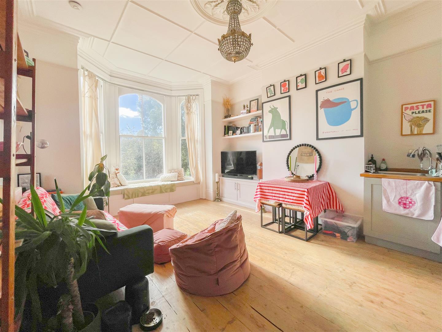 The accommodation is on the hall floor of this attractive Victorian building and comprises an open plan living space with bay window and exposed floorboards and fitted with an attractive painted kitchen which offers electric oven and gas hob. The bedroom benefits from built-in storage and the stylish bathroom offers bath with shower over, wash basin and WC.