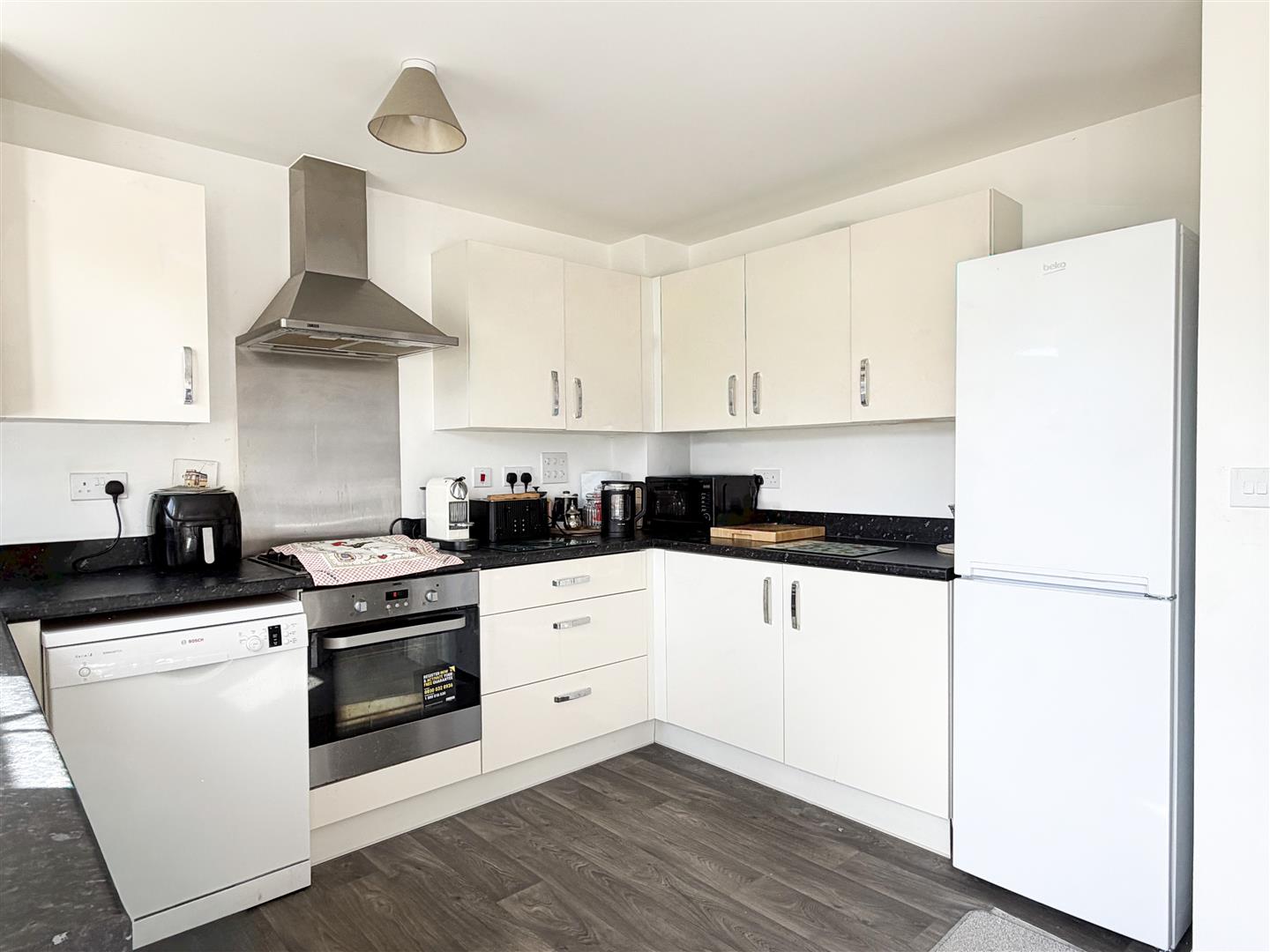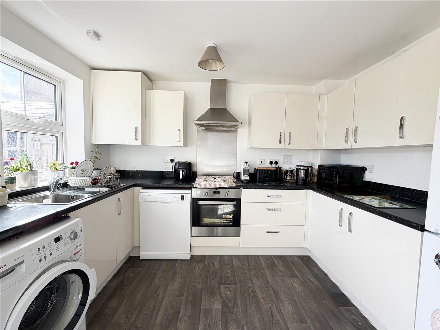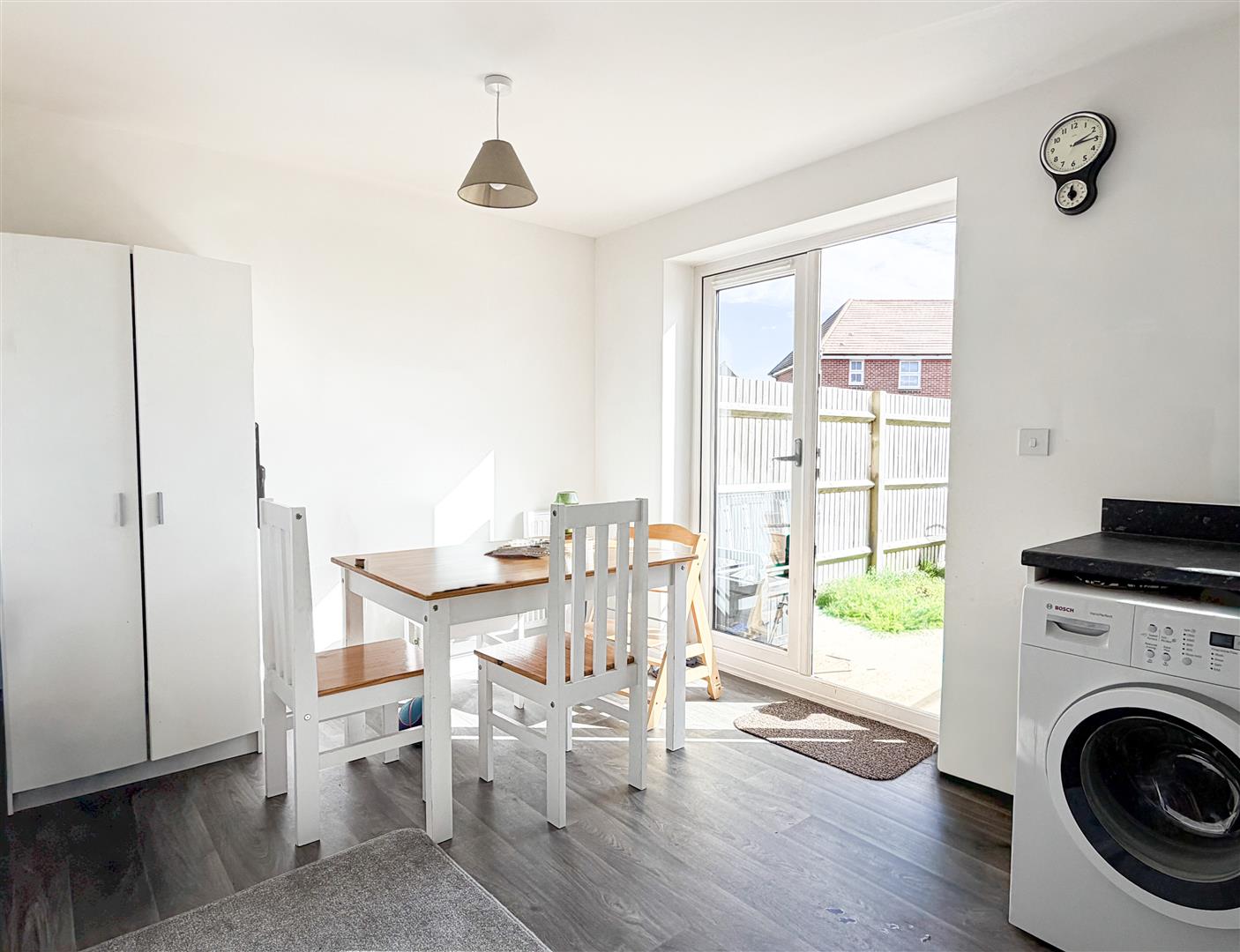 To the rear of the property, the modern kitchen is thoughtfully designed with ample storage and workspace, and features double doors opening directly onto the generously sized rear garden—ideal for outdoor dining and enjoying warmer months.