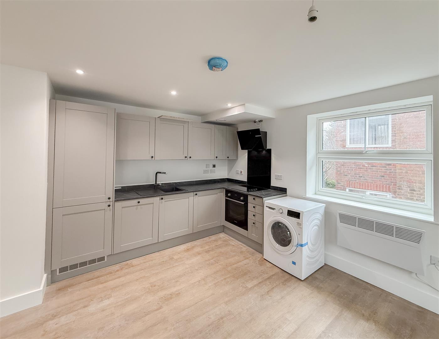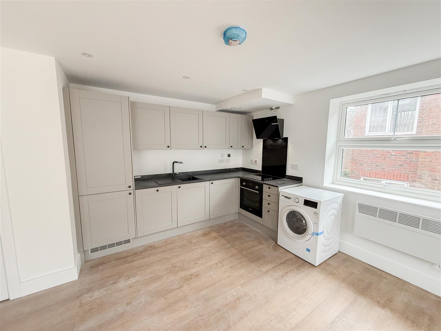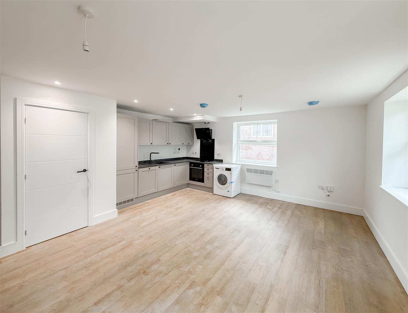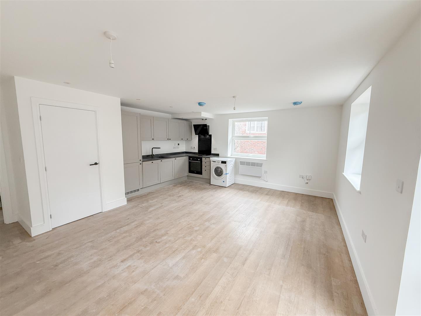 Situated on the first floor, this particular flat offers modern and convenient living throughout. Upon entering, you are welcomed by a spacious hallway leading to a bright open-plan living and kitchen area. The newly fitted contemporary kitchen features integrated appliances including a fridge/freezer, and dishwasher, along with an electric oven and hob and a freestanding washer/dryer.