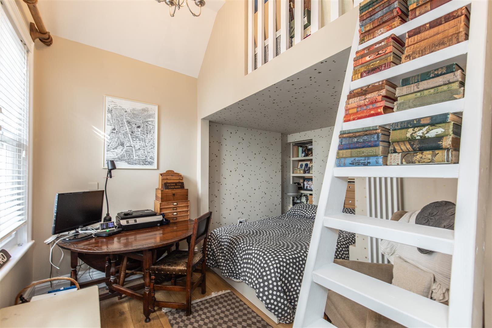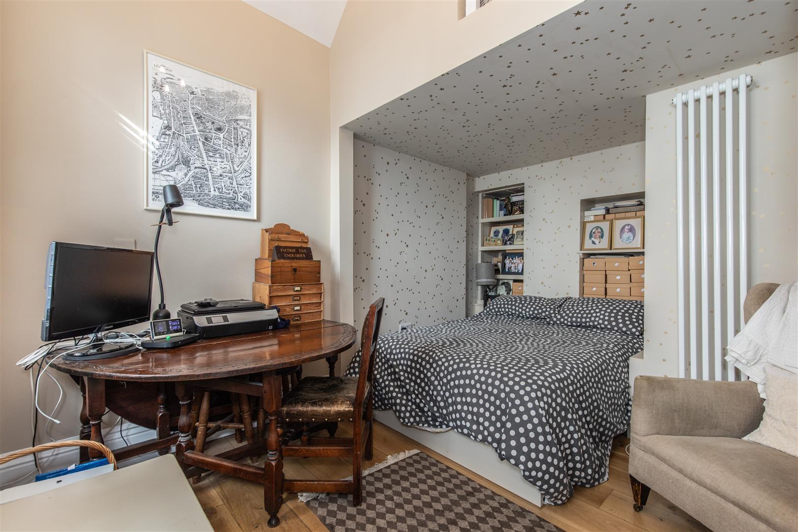 Staircase from the Hall leads up into the stunning open plan ‘loft’ space, cleverly divided into three separate living areas flooded with natural light from the commanding south facing picture windows and large roof Velux windows. The peninsular Kitchen is newly fitted with bespoke hand crafted Alistair Fleming cabinets and furniture incorporating an integrated dishwasher, integrated fridge/freezer, engineered quartz stone worksurface with inset Belfast sink, free standing electric range cooker; Dining Area with feature fireplace leading to the Sitting Area at the far end. A corridor leads off this open space to a Cloakroom with low level WC and hand wash basin; Bedroom 2 with alcove for a double bed and feature mezzanine floor above allowing ancillary accommodation with built-in single bed, electric light and power; Bedroom 3 currently used as a playroom.