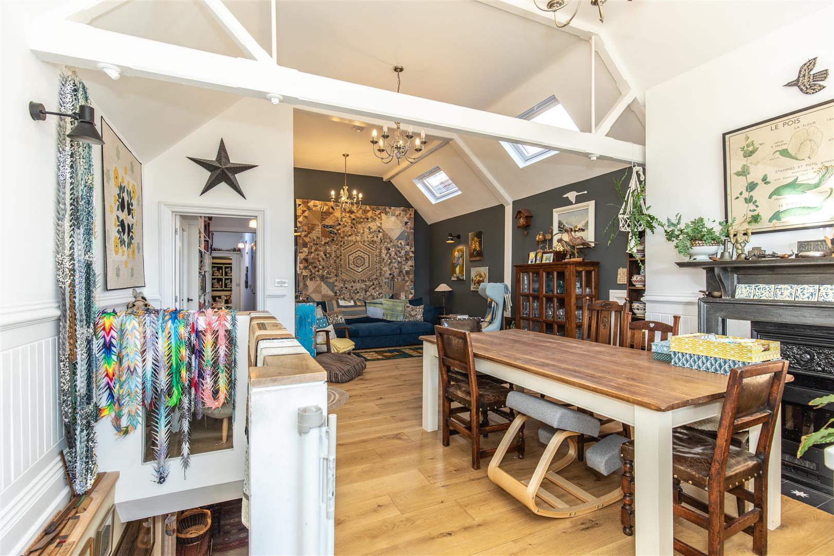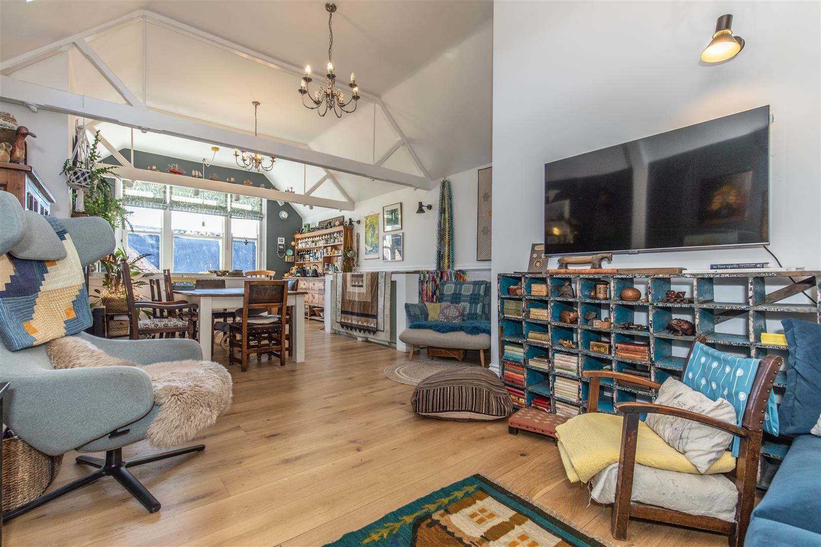 The ground floor provides versatile accommodation ideally suited to modern lifestyles, currently arranged to include two generous double bedrooms, a further bedroom or multi-use room, a well-appointed family bathroom, and a separate shower room. A useful boot room/study sits to the rear, offering an ideal work-from-home space or practical everyday entrance, Ascending to the first floor, a galleried staircase opens into an impressive, light-filled open-plan living area extending over 33 feet, featuring vaulted ceilings and a striking double-aspect design that creates a wonderful sense of space. The bespoke Alistair Fleming kitchen forms the centrepiece of this remarkable room, perfectly designed for both entertaining and relaxed family living. This level also provides two additional bedrooms, a cloakroom (with potential to convert into a shower room), and access to a mezzanine level which offers an ideal reading area, study, or occasional guest space.