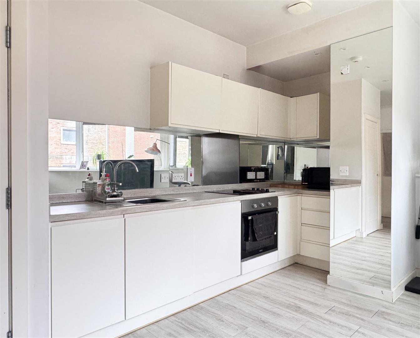 Situated within a modern purpose-built block, the property features a spacious living area with a fitted kitchen that includes an integrated oven and hob, providing a practical and functional layout.