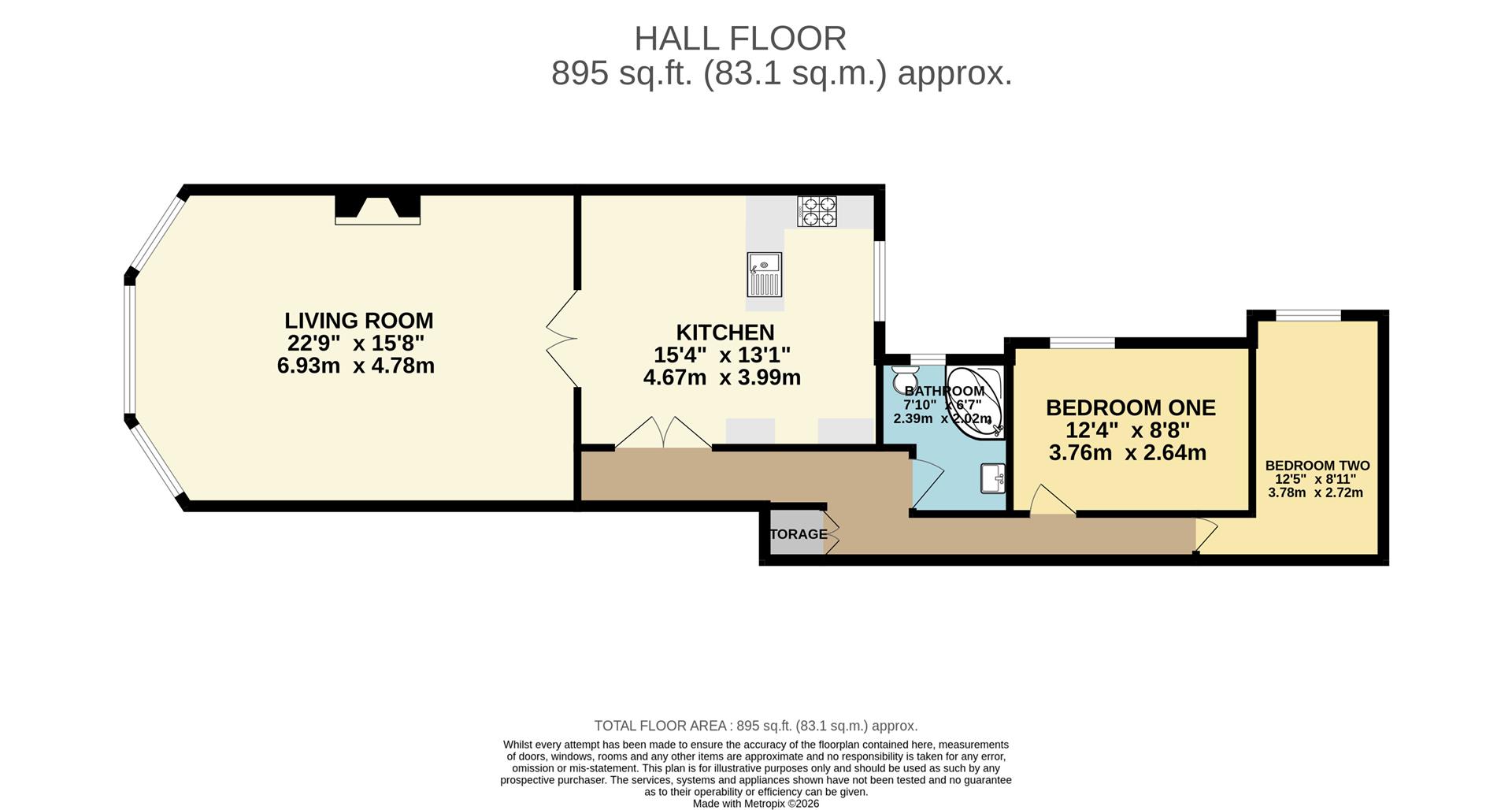 The property features a spacious living room that flows seamlessly into the kitchen, two bedrooms, and a well-appointed bathroom, providing a practical and welcoming layout throughout.